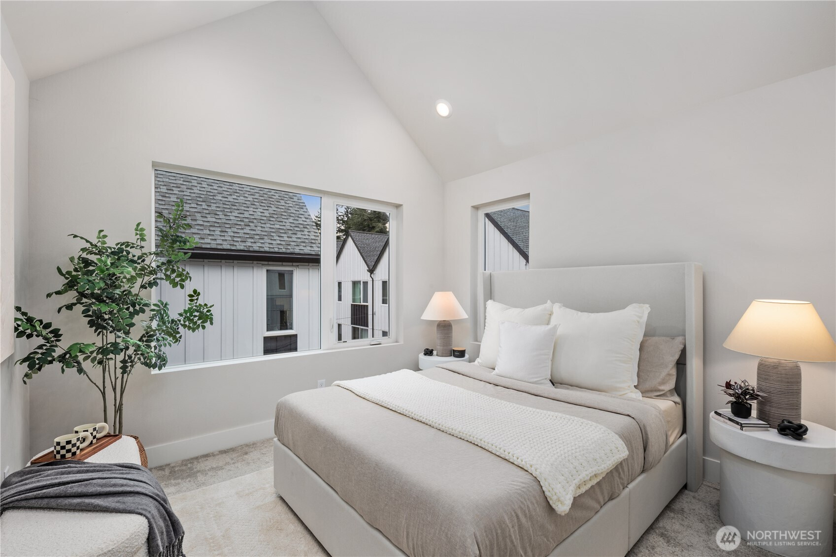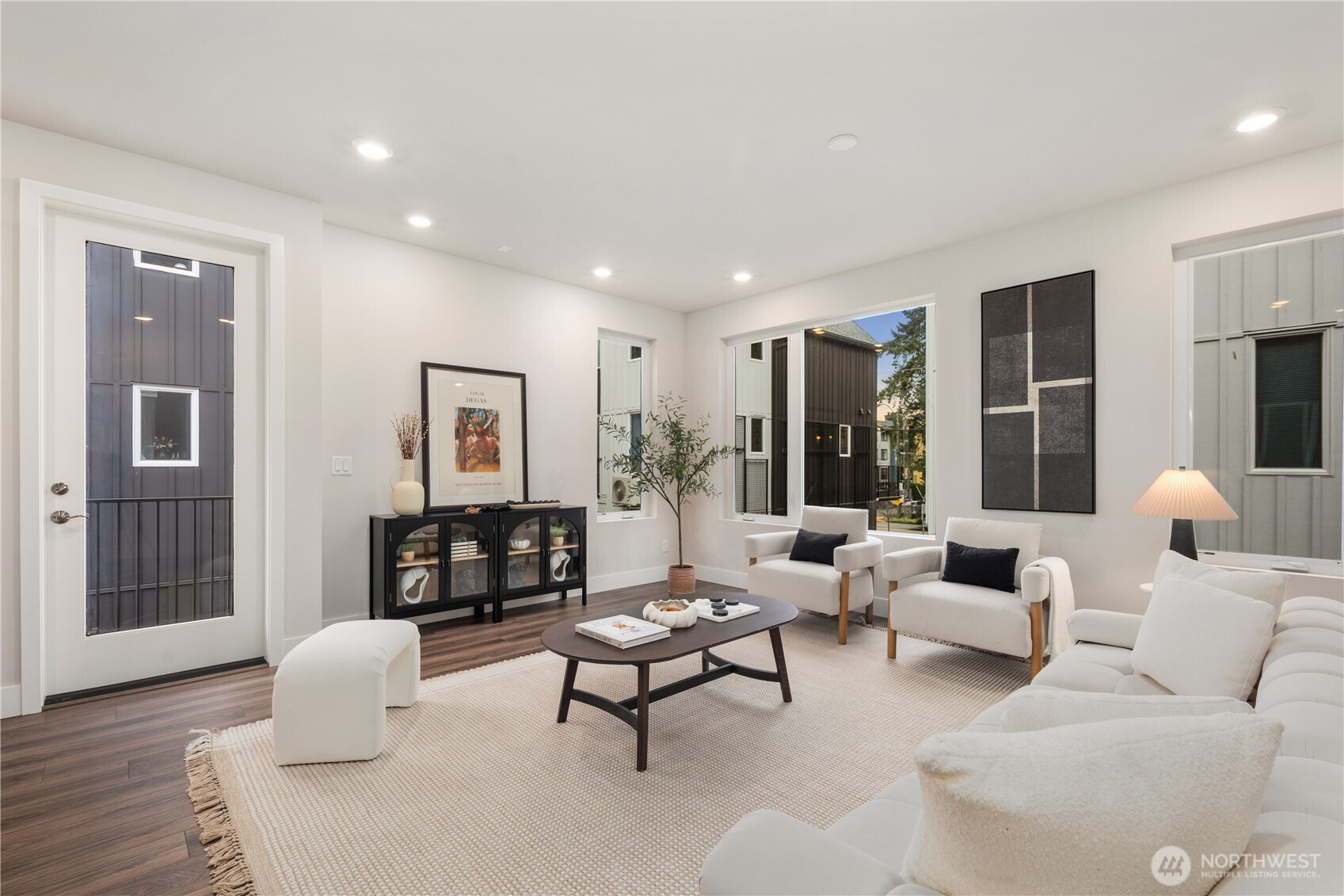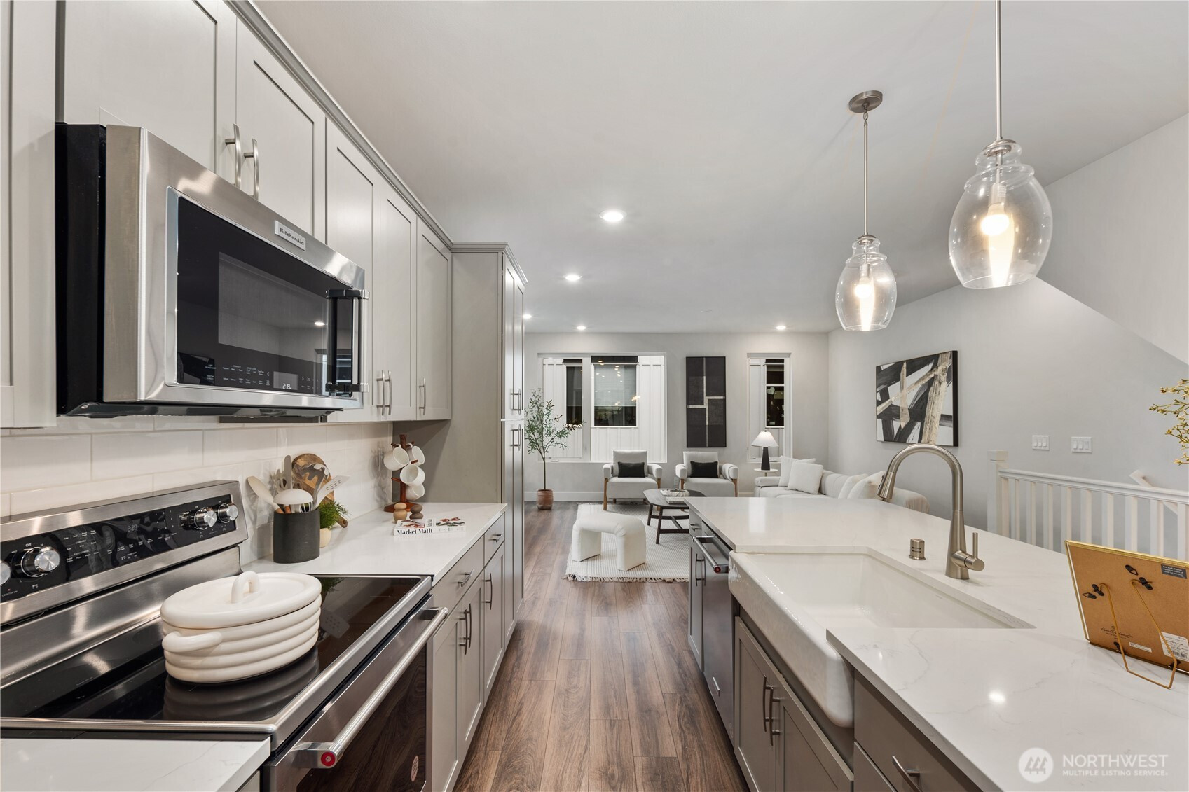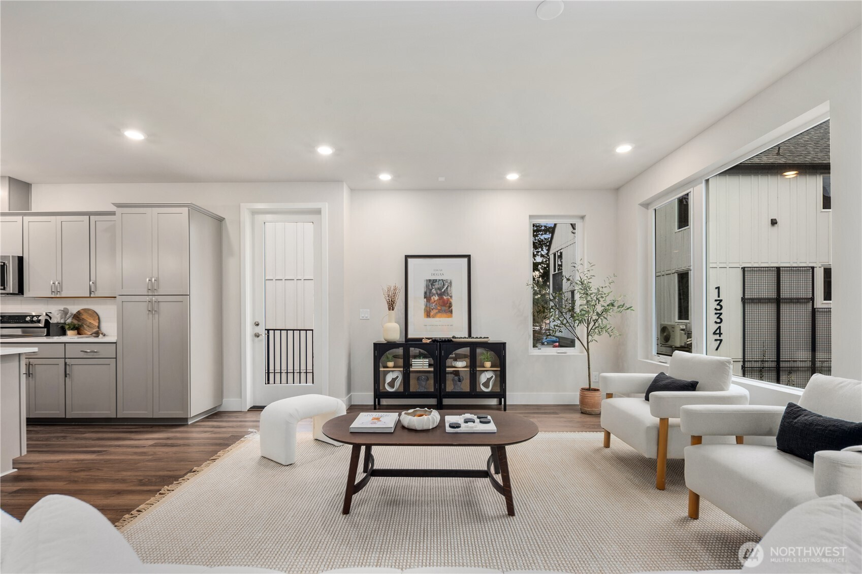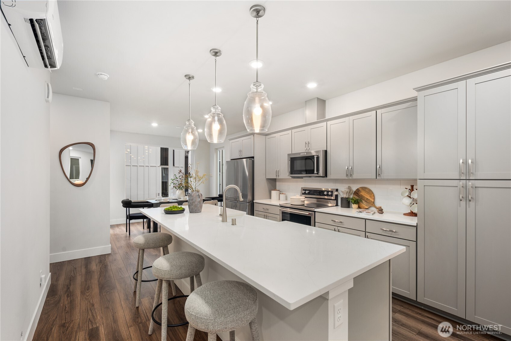 Pulte Homes new construction resale offering a rare corner end unit offering a wider, more livable layout than typical Seattle townhomes, quietly tucked away from the main road for added privacy. Built in 2021 but occupied in 2023, this thoughtfully maintained home blends modern design with everyday functionality. The open concept main level is anchored by a chef’s kitchen featuring an oversized 10ft quartz island, white soft close cabinetry, farmhouse sink, and premium KitchenAid appliances with Samsung refrigerator, flowing seamlessly into sunlit living and dining spaces framed by expansive windows unique to its corner positioning. Enjoy indoor outdoor living with 2 covered balcony’s off the main level, ideal for year round use, entertaining, or unwinding. Upstairs, the vaulted primary suite offers a spa-inspired retreat with dual vanities, floor to ceiling tiled shower with bench, frameless glass enclosure, and a generous walk in closet. Spacious secondary bedrooms provide flexibility for guests, work from home, or lifestyle needs, while a full bedroom and bath on the entry level adds even more versatility. A rare find in Seattle, the home is built over a true side by side 2 car garage, offering both convenience and additional storage without compromise. EV charger ready and no sewer capacity charges. Ideally located near Dunn Gardens, Carkeek Park, Green Lake, and Bitter Lake, with quick access to I-5, Northgate Station, and downtown Seattle. No Sewer capacity charge!