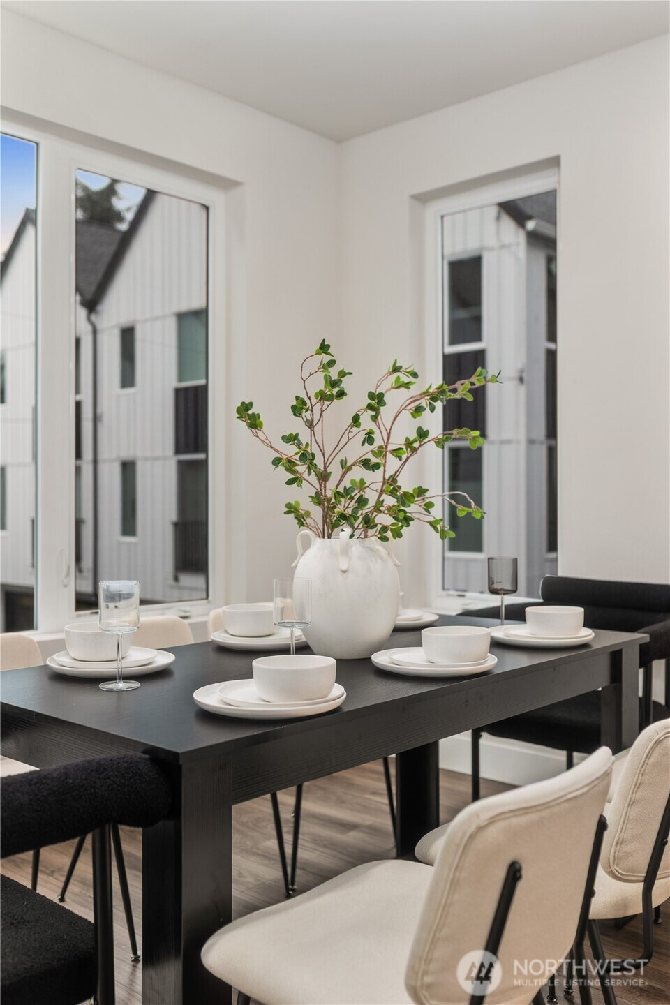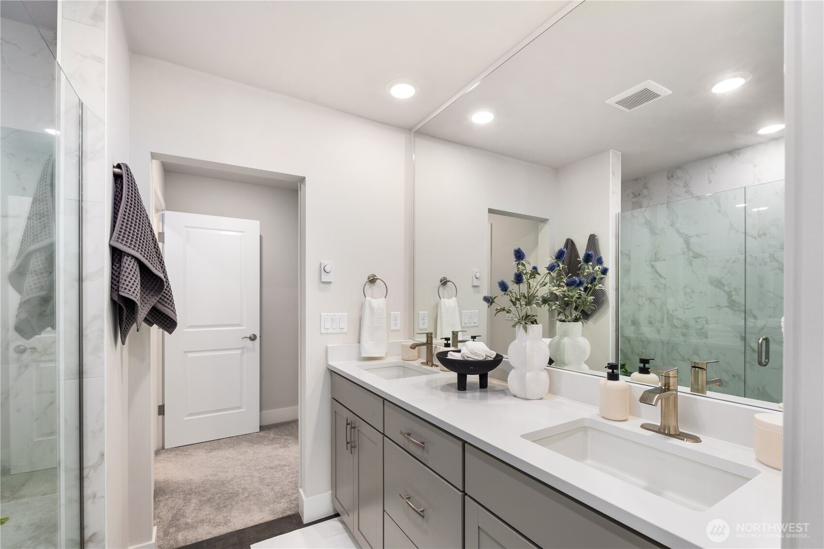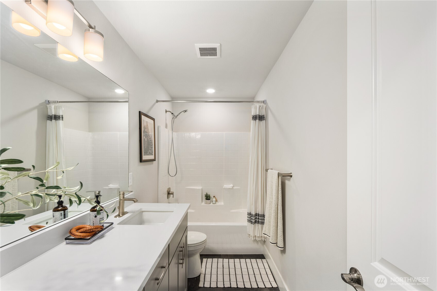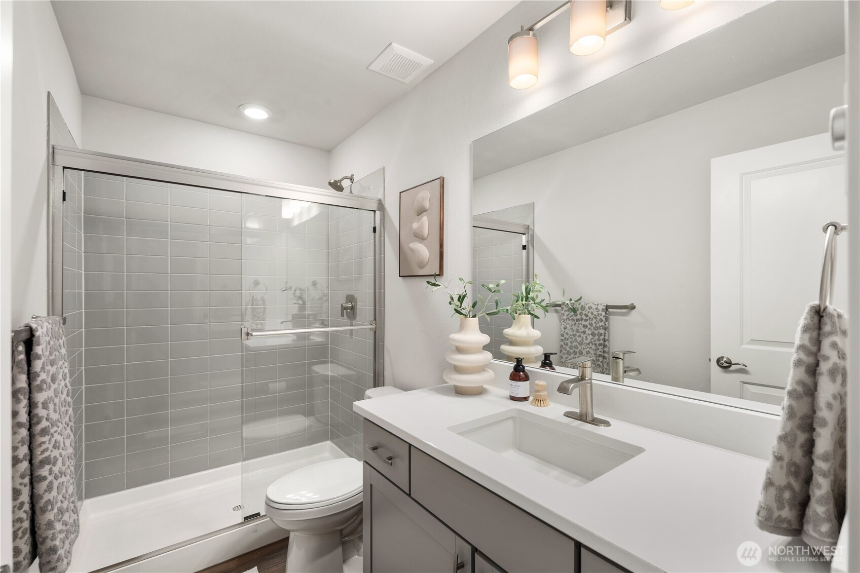 Pulte Homes new construction resale offering a rare corner end unit offering a wider, more livable layout than typical Seattle townhomes, quietly tucked away from the main road for added privacy. Built in 2021 but occupied in 2023, this thoughtfully maintained home blends modern design with everyday functionality. The open concept main level is anchored by a chef’s kitchen featuring an oversized 10ft quartz island, white soft close cabinetry, farmhouse sink, and premium KitchenAid appliances with Samsung refrigerator, flowing seamlessly into sunlit living and dining spaces framed by expansive windows unique to its corner positioning. Enjoy indoor outdoor living with 2 covered balcony’s off the main level, ideal for year round use, entertaining, or unwinding. Upstairs, the vaulted primary suite offers a spa-inspired retreat with dual vanities, floor to ceiling tiled shower with bench, frameless glass enclosure, and a generous walk in closet. Spacious secondary bedrooms provide flexibility for guests, work from home, or lifestyle needs, while a full bedroom and bath on the entry level adds even more versatility. A rare find in Seattle, the home is built over a true side by side 2 car garage, offering both convenience and additional storage without compromise. EV charger ready and no sewer capacity charges. Ideally located near Dunn Gardens, Carkeek Park, Green Lake, and Bitter Lake, with quick access to I-5, Northgate Station, and downtown Seattle. No Sewer capacity charge!