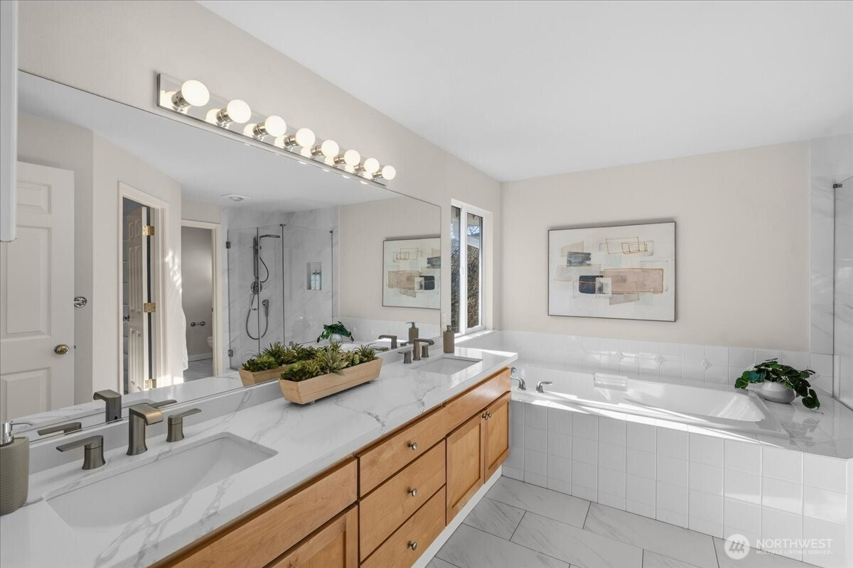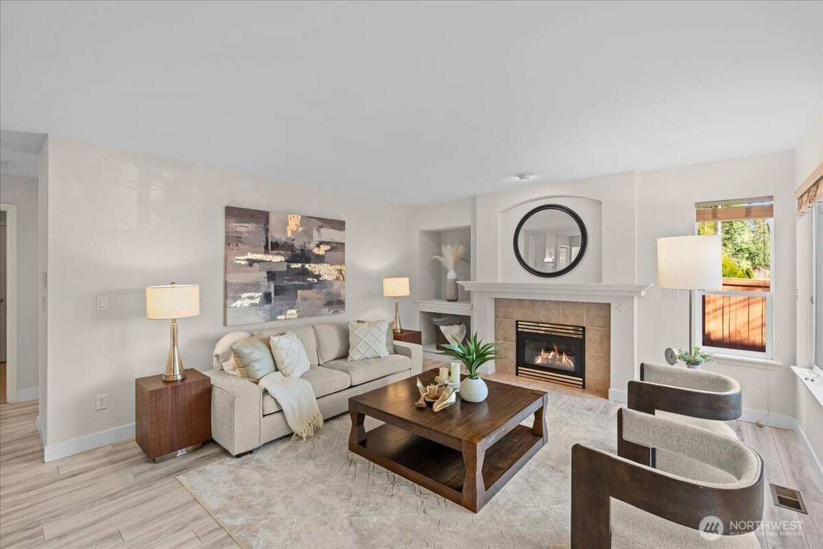 Discover comfort and everyday convenience in this centrally located Cambridge Heights residence, complete with a 3-car garage. From the moment you enter, soaring vaulted ceilings in the entry and living room create a bright, open atmosphere that feels both welcoming and dramatic. The home has been thoughtfully refreshed with brand-new interior paint on walls and ceilings, newer exterior paint, updated flooring, updated bathrooms plus an upgraded 50-year roof. The heart of the home is the beautifully updated kitchen, showcasing quartz countertops, a generous island ideal for gathering with a gas cooktop, and a brand-new refrigerator. Upstairs, the spacious primary suite is a true retreat, featuring a cozy sitting area with a gas fireplace. Double doors separate the sitting room from the main bedroom for privacy. The updated primary bathroom features quartz counters, double sinks, a tile shower, soaking tub, and walk-in closet. The main-floor bedroom adds flexibility, perfect for guests or a private home office. Outside, enjoy a low-maintenance backyard with an oversized side yard and a covered pergola, ideal for unwinding after a long day. Located in the Lake Washington School District and just minutes from shopping, dining, Evergreen Health Medical, Totem Lake Village, Woodinville wine country, and I-405. Easy commute to Redmond, Kirkland and Bellevue tech hubs. This home offers the perfect balance of style, comfort, and location. Seller pre-inspected for peace of mind.