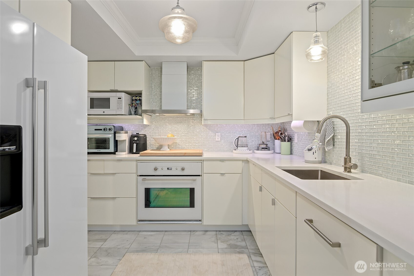 One of a Kind. You won’t believe it’s a condo (and so quiet). Cherished by longtime residents, homes in this six-unit building rarely come to market. Enjoy low maintenance living with unbeatable convenience: stroll to Fremont Peak Park, grab your morning coffee at Lighthouse Roaster — charming, welcoming, and great coffee—or shop at the Fremont Sunday Street Market. The only residence on its floor, accessed through a private vestibule that instantly sets the tone. Step inside to a fully remodeled interior where smart design meets understated sophistication, and outside is your own private covered patio. It’s an ideal space for hosting a small group of friends or enjoying a relaxing evening at home. Tucked quietly between Fremont, Ballard, and Wallingford, this rare single level condominium offers a level of privacy and calm almost unheard of in condo living. The spacious layout is both functional and refined, ideal for modern living and work from home ease. Carefully selected finishes elevate every space, from rich bamboo flooring in the living areas to cool marble floors in the kitchen and dining room. Updated lighting, curated hardware, and beautifully organized California Closets—with ample storage throughout—make everyday living effortless. The result is a quiet, well-kept community and a sense of ownership that’s hard to find. Walkability, privacy, and design come together seamlessly here. Hop on nearby transit for an easy commute. This is condo living reimagined.