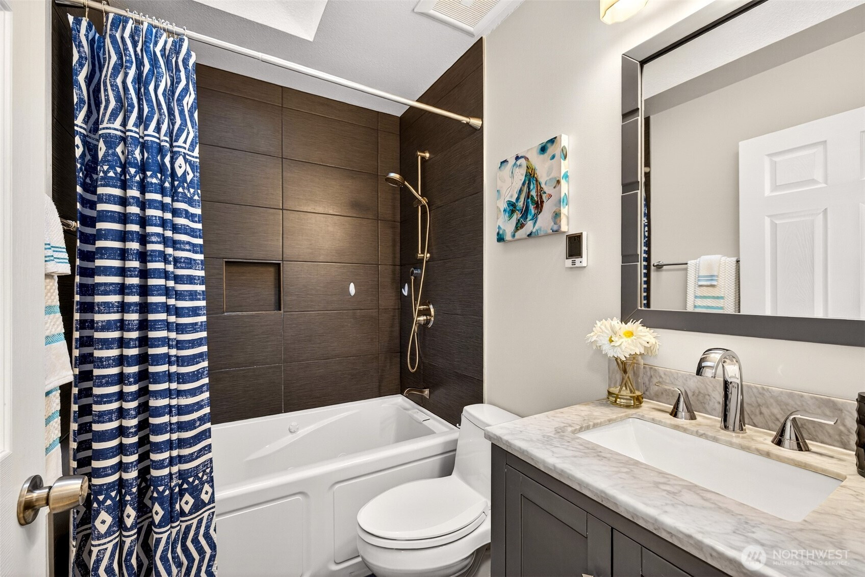 Beautifully updated two-story home in Redmond's Sunrise on English Hill. This 4-bed, 2.5-bath, 2,230 SF home on a private 8,750 SF lot has been thoughtfully prepared and genuinely cared for throughout. Refinished hardwood floors, fresh paint, and new kitchen recessed lighting create a move-in ready feel from day one. Updated kitchen with quartz countertops, stainless steel appliances, peninsula cooktop with vent hood, opening to casual dining and family room with direct patio access. Spa-quality primary bath features frameless glass shower, marble tile surround, rain head, dual undermount sinks, and heated floors. Remodeled hall bath offers bold tile surround, soaking tub, updated vanity, and heated floors. Upstairs den serves as optional 5th bedroom — ideal for today's hybrid work lifestyle. Main level half bath with heated floors, dedicated laundry room, and bonus rec room perfect for a home office, playroom, or hobby space. Fully fenced backyard with large paver patio and soaring evergreen backdrop delivers exceptional outdoor privacy on nearly 8,750 SF. Northshore School District. Minutes to Microsoft, Google, and Meta. English Hill Living at its Best!