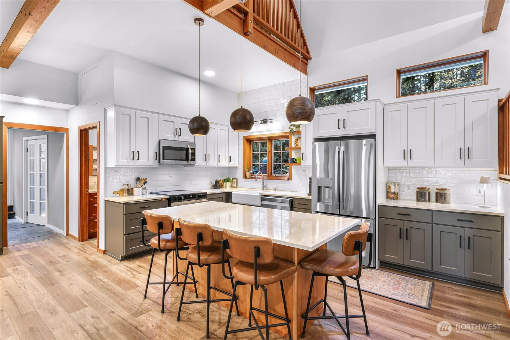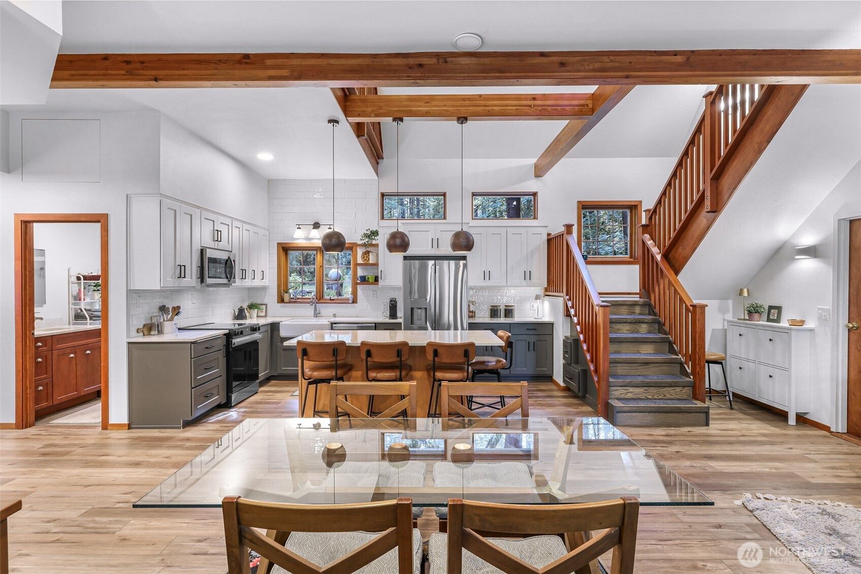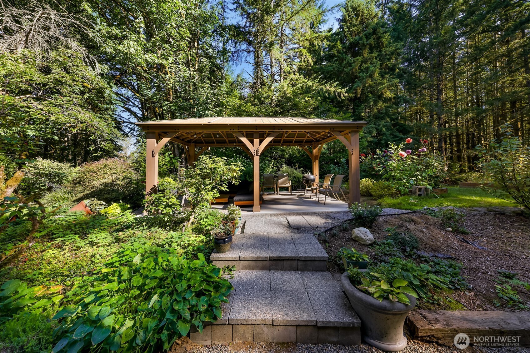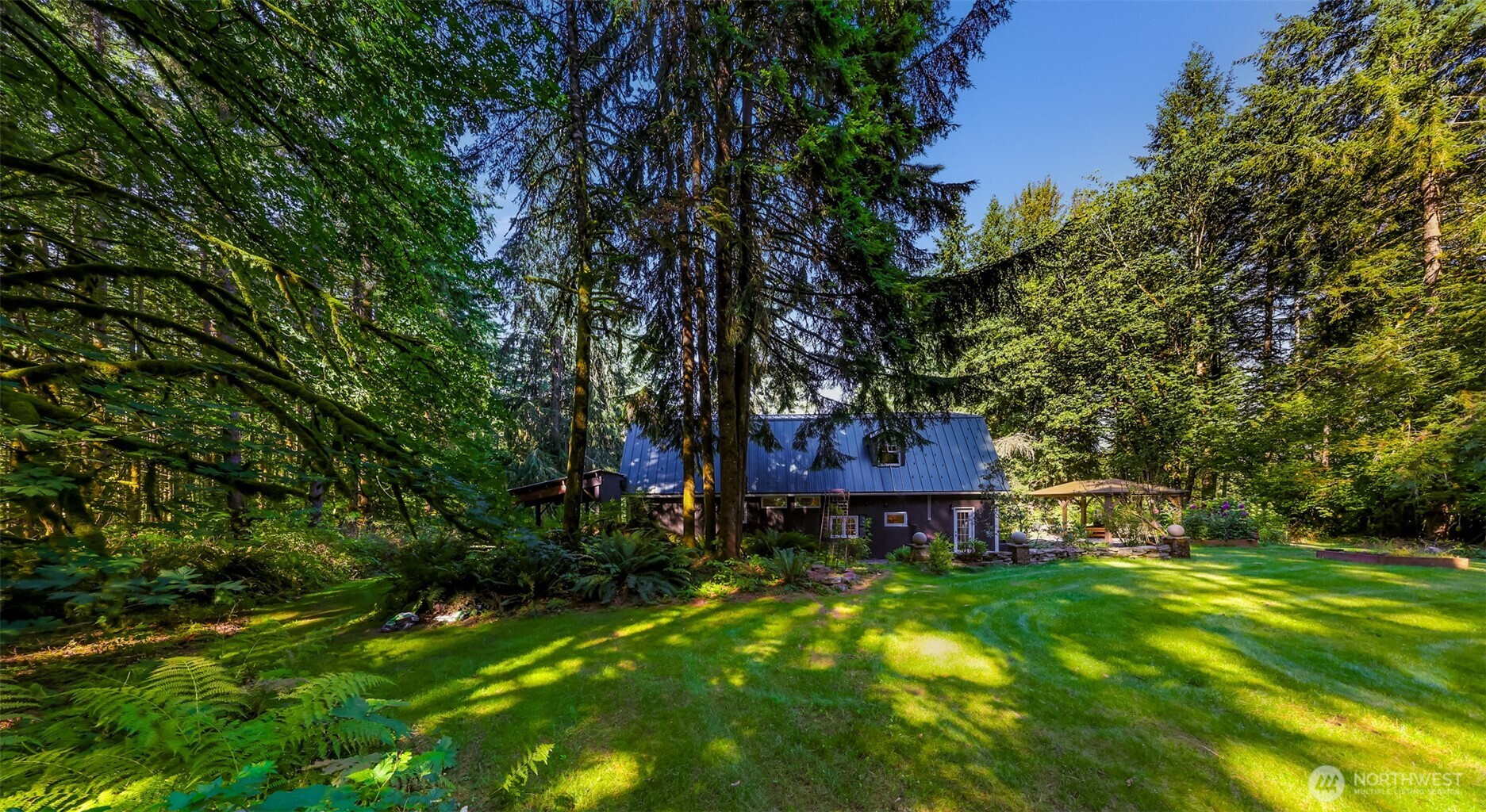 Welcome to this enchanting 4.8-acre estate, featuring stunning English gardens & custom-built 2710sqft NW home. First time on the market, this residence exudes warmth & character. The inviting main level showcases updated gorgeous chef’s kitchen, spacious great room w/soaring beamed ceilings & fireplace, bedroom, full bath, laundry. Upstairs, 3 generous bedrooms, beautifully remodeled bath w/heated floors & loft. Gorgeous flooring flows throughout, enhancing the home’s natural charm. Outdoor living w/covered patios, chicken coop, garden spaces. Large garage/shop with additional carport & RV hookups. With a durable metal roof, space for a potential ADU, & serene garden paths, this property offers rare privacy, beauty & endless possibilities.