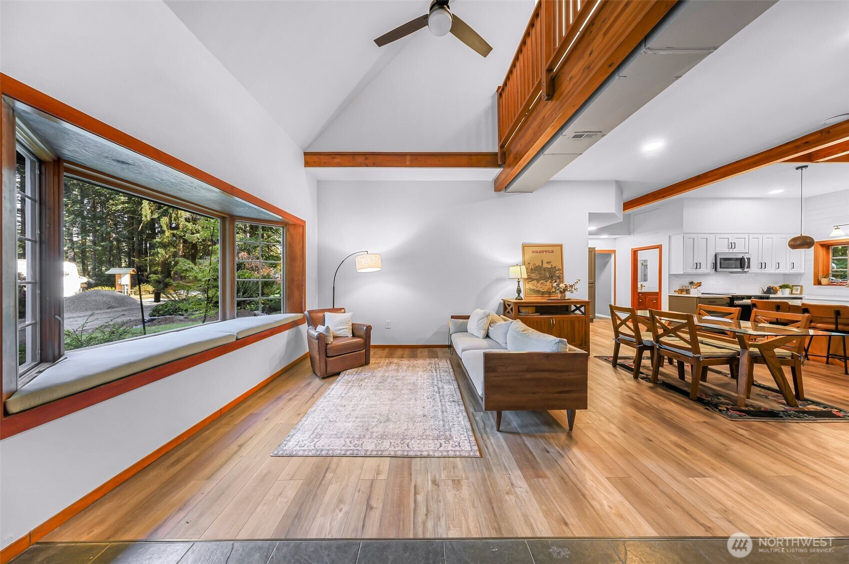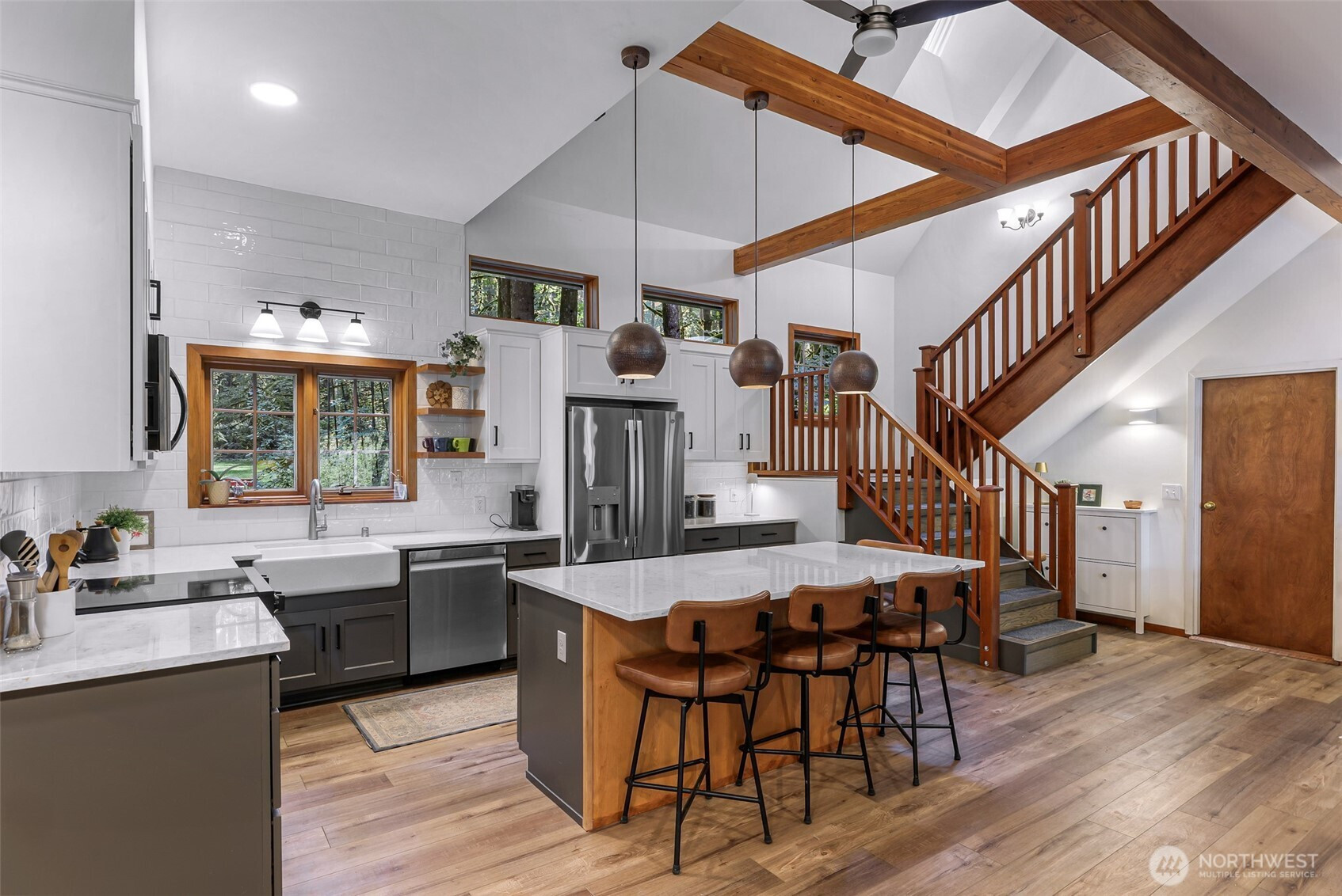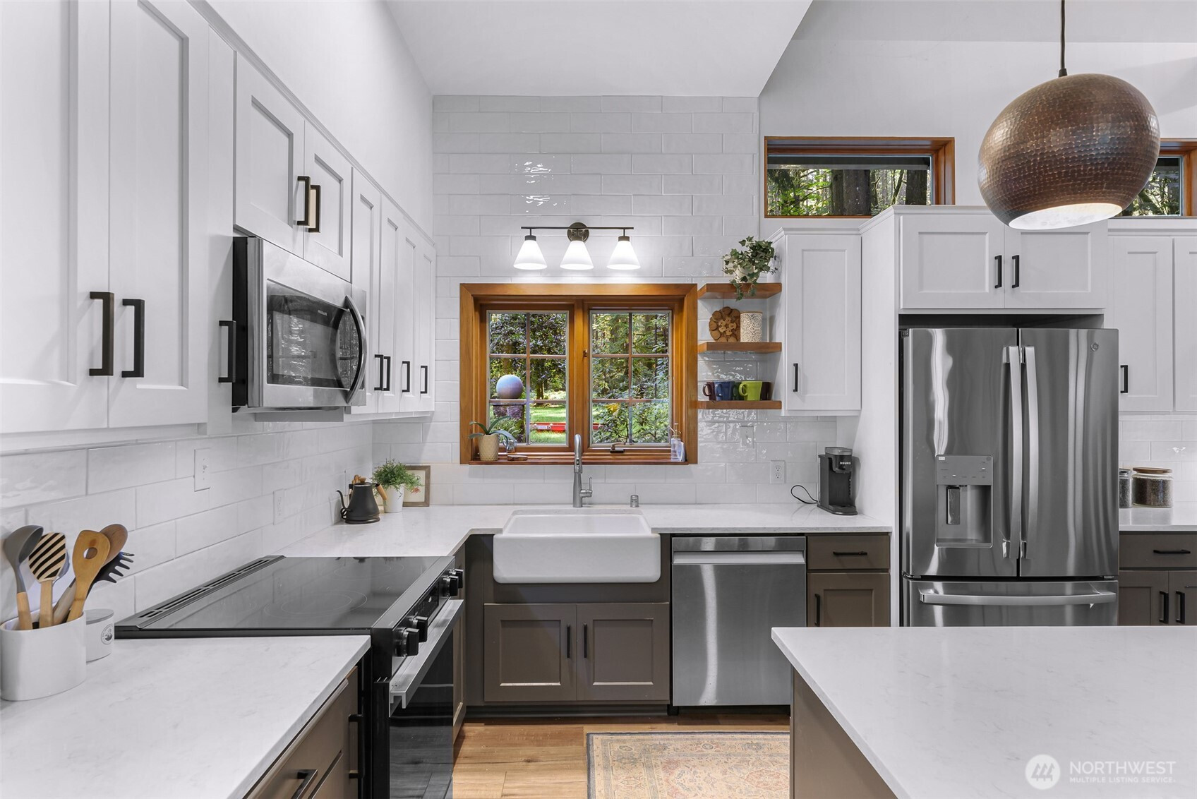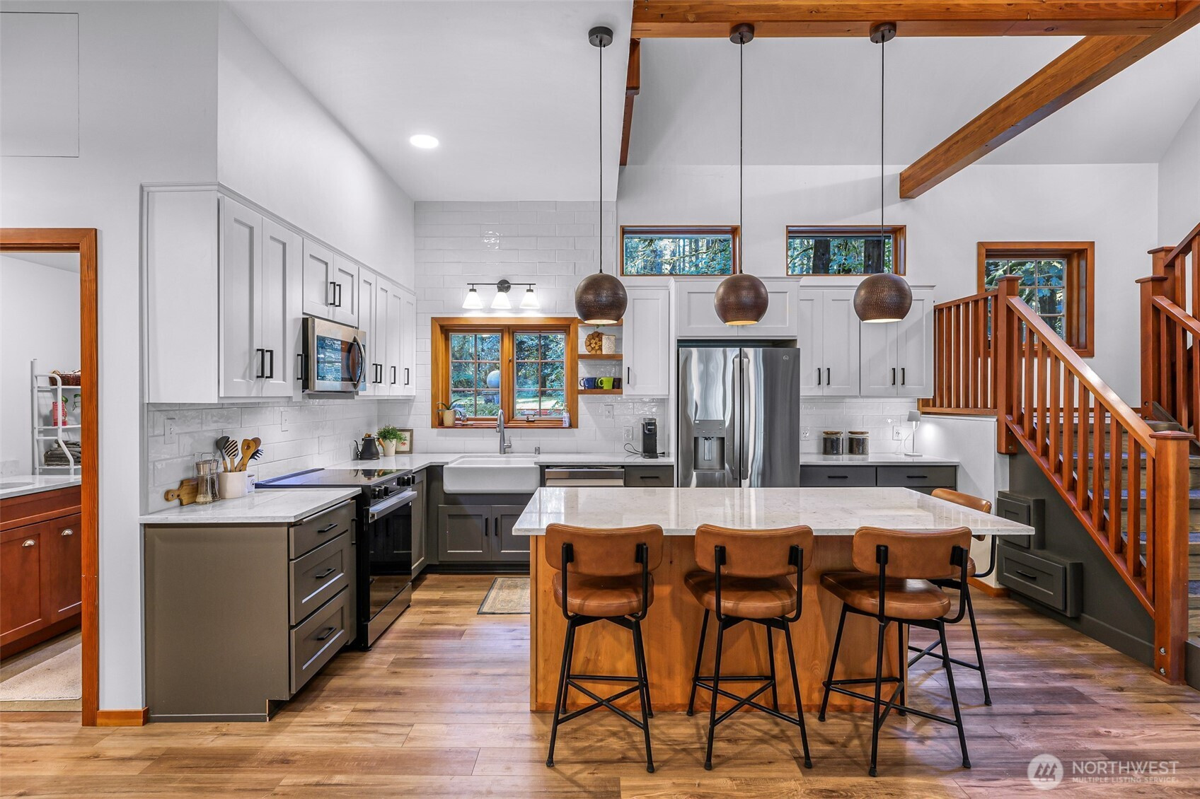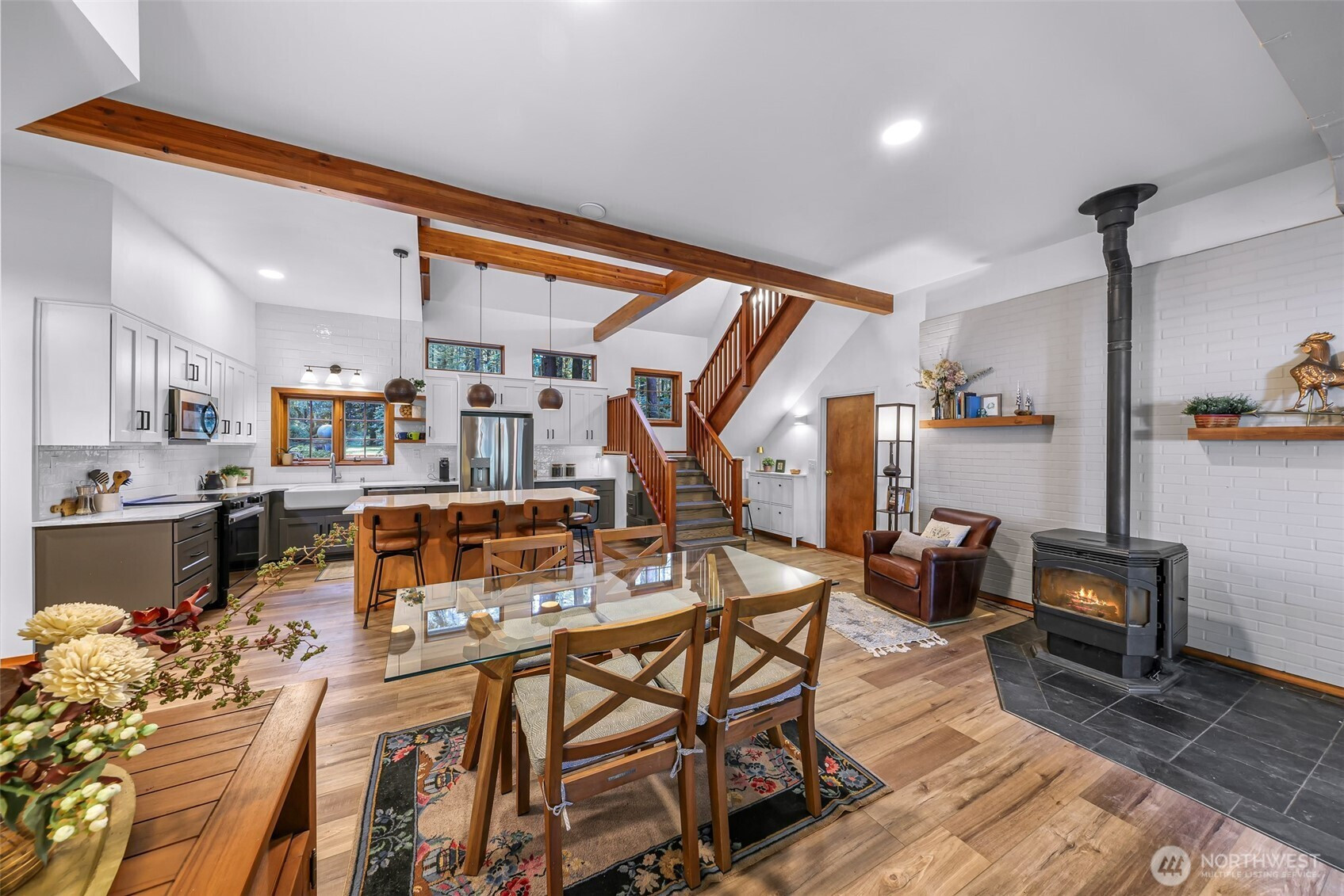 Welcome to this enchanting 4.8-acre estate, featuring stunning English gardens & custom-built 2710sqft NW home. First time on the market, this residence exudes warmth & character. The inviting main level showcases updated gorgeous chef’s kitchen, spacious great room w/soaring beamed ceilings & fireplace, bedroom, full bath, laundry. Upstairs, 3 generous bedrooms, beautifully remodeled bath w/heated floors & loft. Gorgeous flooring flows throughout, enhancing the home’s natural charm. Outdoor living w/covered patios, chicken coop, garden spaces. Large garage/shop with additional carport & RV hookups. With a durable metal roof, space for a potential ADU, & serene garden paths, this property offers rare privacy, beauty & endless possibilities.