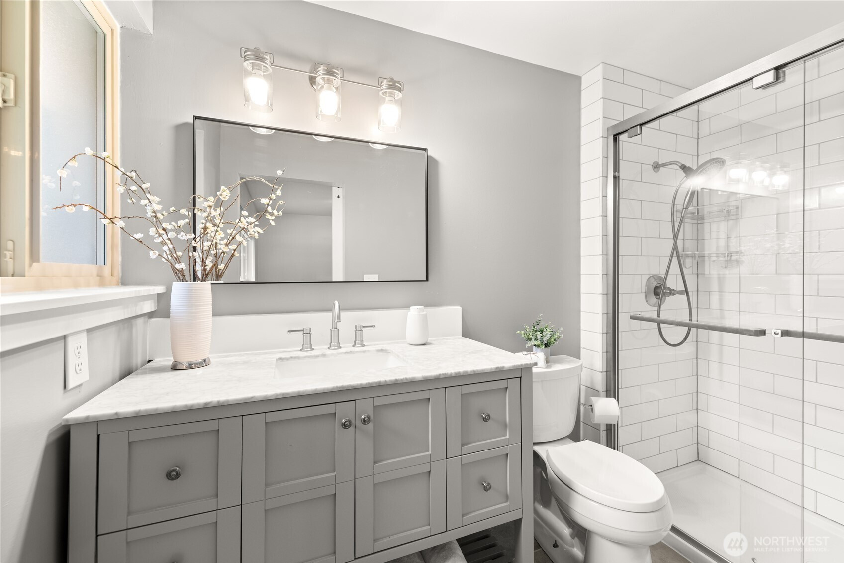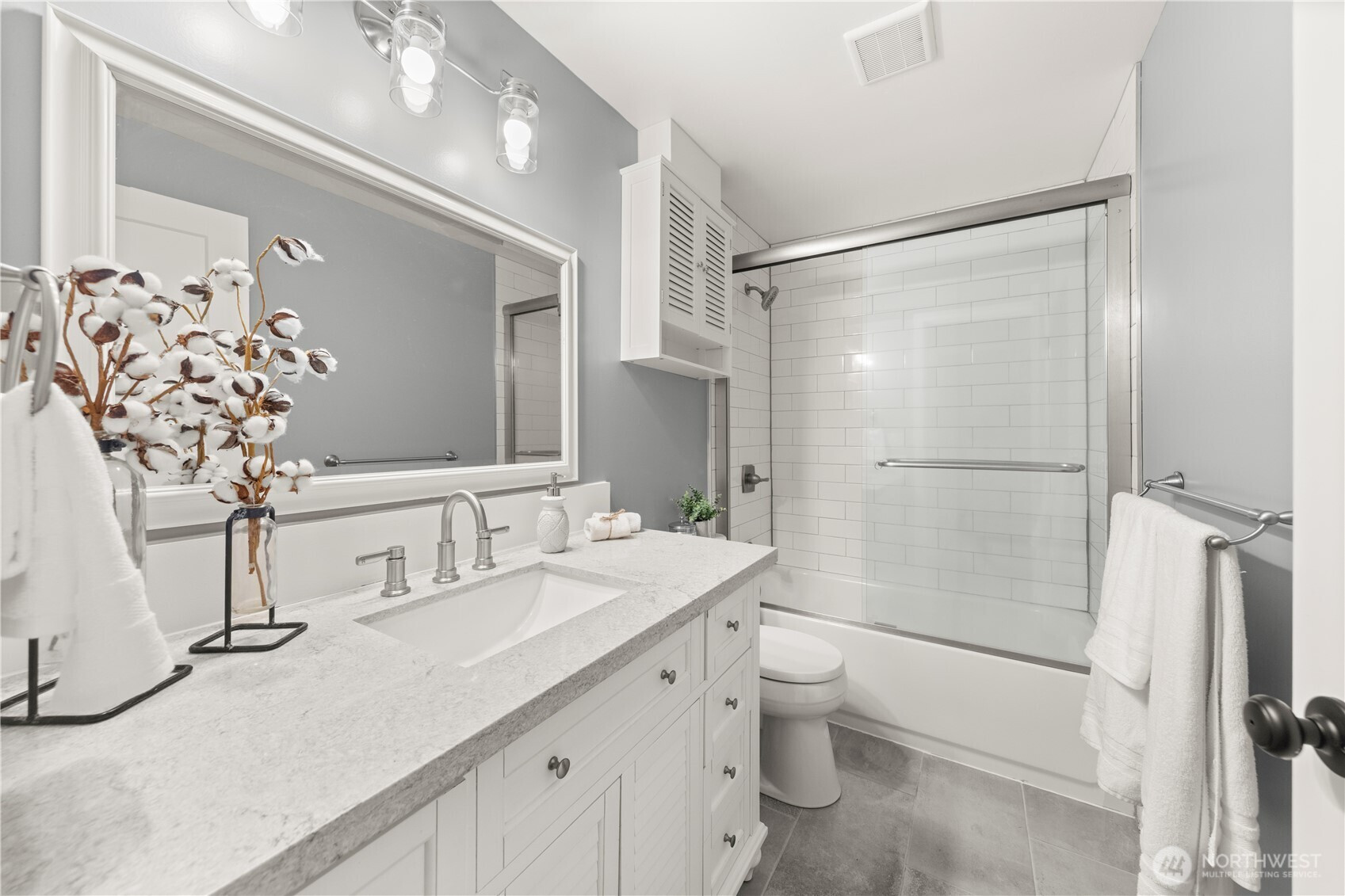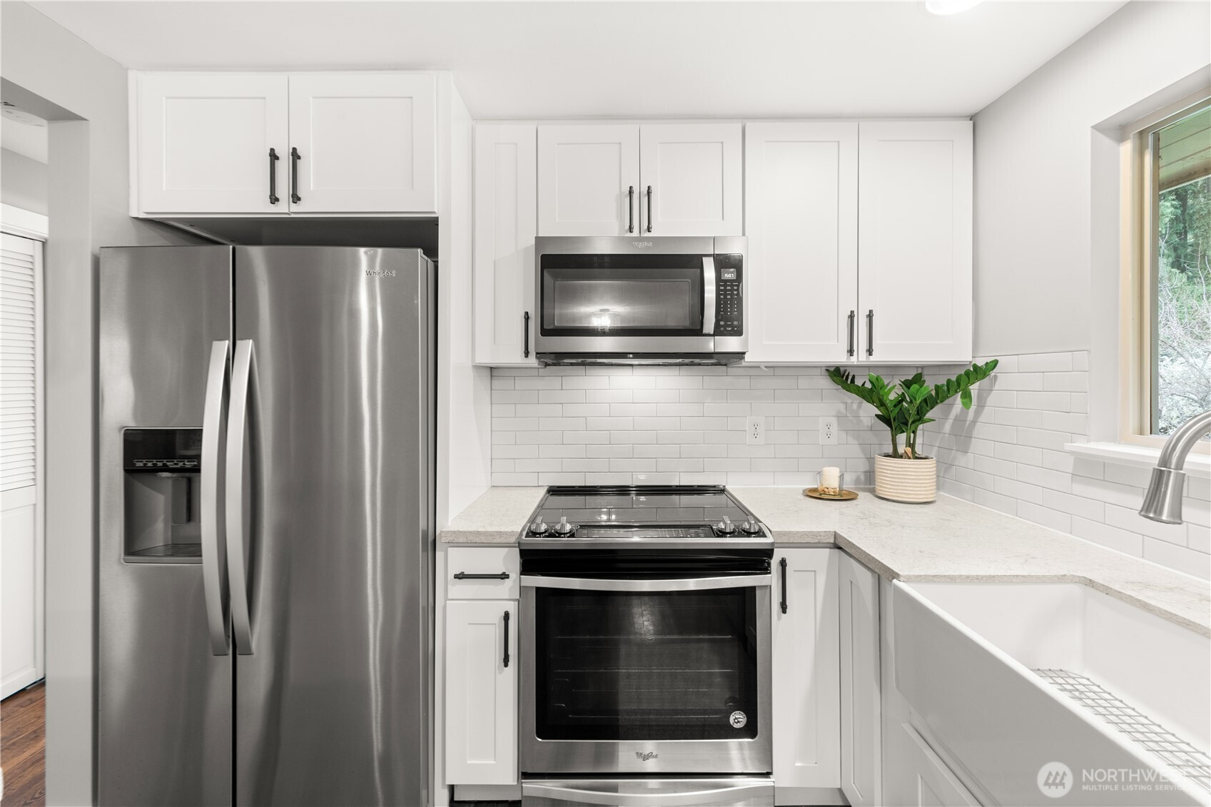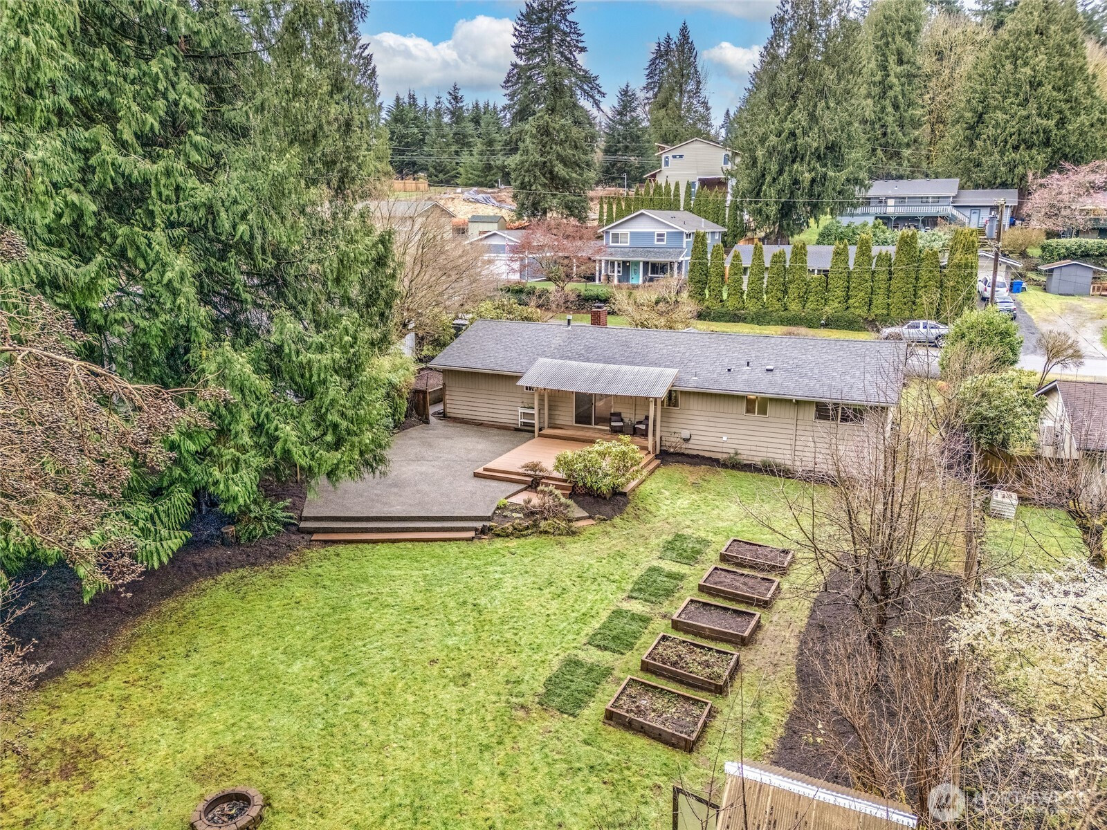 This tastefully updated 3-bed, 2-bath rambler sits on a 10,080 sq ft fully fenced lot with a private backyard retreat featuring fruit trees, raised garden beds, and a peaceful ravine, with no neighbors looking in. The 1,230 sq ft layout blends modern updates with original charm. The bright kitchen has granite counters, white cabinetry, stainless steel appliances, a reverse osmosis water system, and pantry storage. It opens to the living and dining areas, creating a functional space perfect for everyday living and entertaining. A cozy wood-burning fireplace adds warmth and character. Real oak hardwood floors and quality tile run throughout. Both bathrooms are updated with modern cabinetry. The dedicated laundry room includes washer, dryer, and a new utility sink. The freshly painted two-car garage has a new floor coating and water heater, with driveway and off-street parking for up to five vehicles. For added security, the home features a front door Ring doorbell camera. Located in the highly coveted Issaquah School District, close to parks, shopping, dining, and commuter routes including I-405, I-90, and Highway 18. This home is clean, well-maintained, and truly move-in ready. Inquire within for details on the backyard trees and plants.