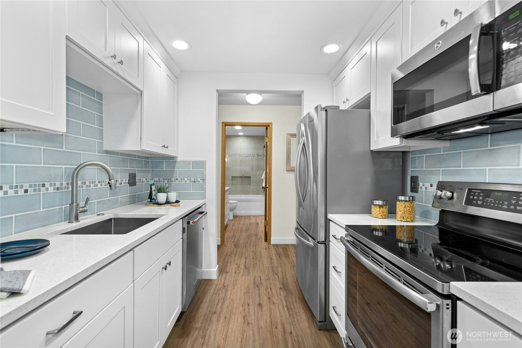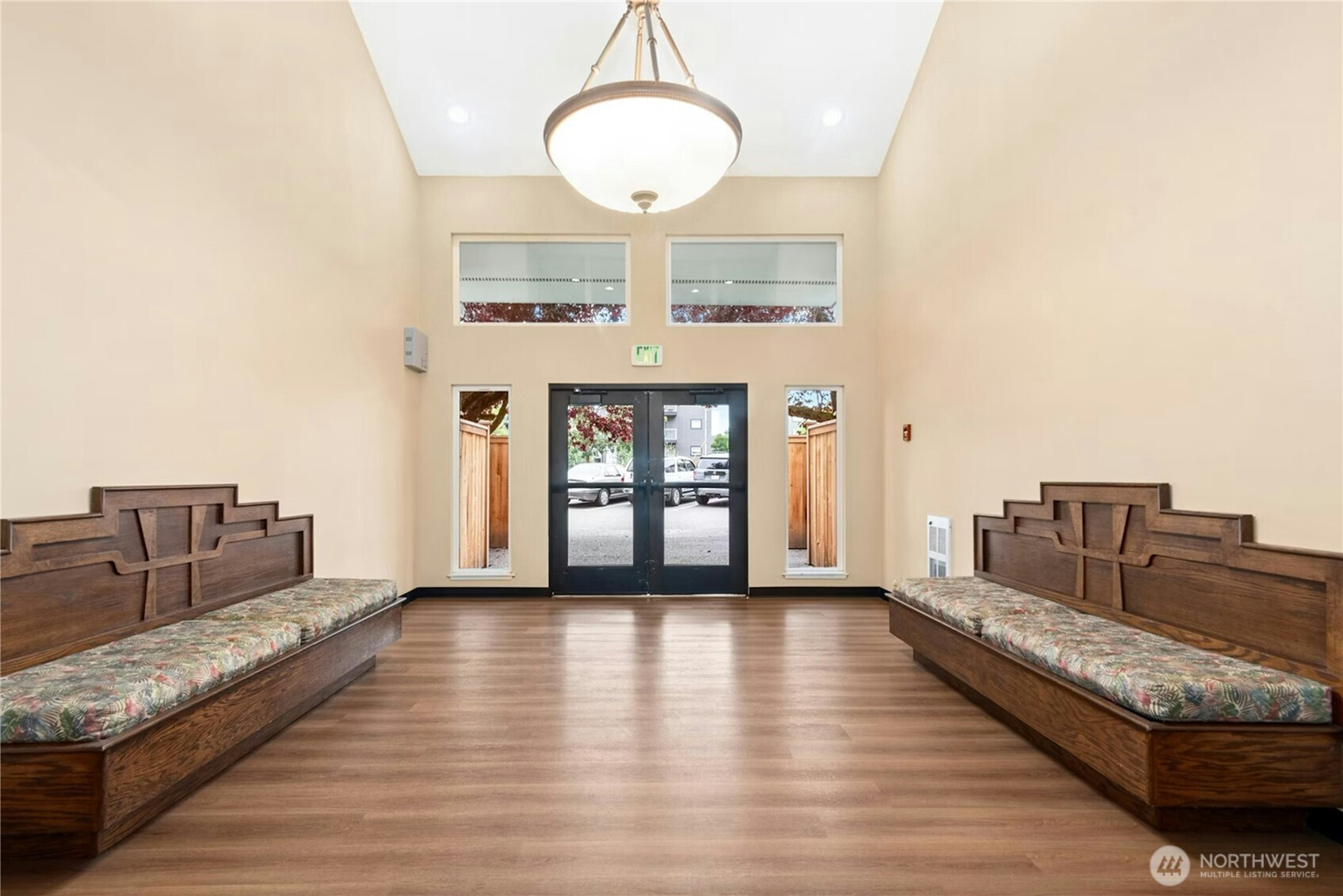 This spacious 999 sqft, 2 bedroom, 1 bathroom, top floor, end unit condo offers remodeled kitchen & bathroom, new carpet, vinyl plank flooring, fresh paint, updated lighting, cozy wood-burning fireplace, full-size washer & dryer in unit, and overlooks the private park. Ideal for investment or personal use (no rental cap, strong HOA reserves, and onsite management). Enjoy secure garage parking with access to new elevators, extra storage, shared covered pavilion, and HOA-covered water, sewer, garbage, earthquake insurance, and common area maintenance. Pet friendly with no size or breed restrictions, plus easy I-5 access, and mins to Bitter Lake great for kayaking and fishing.