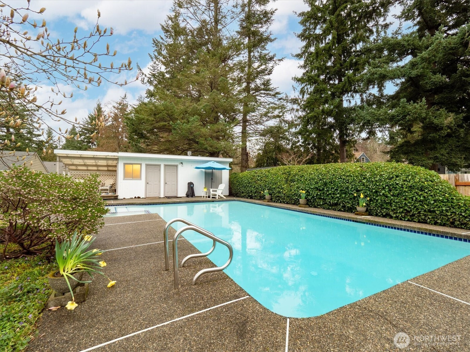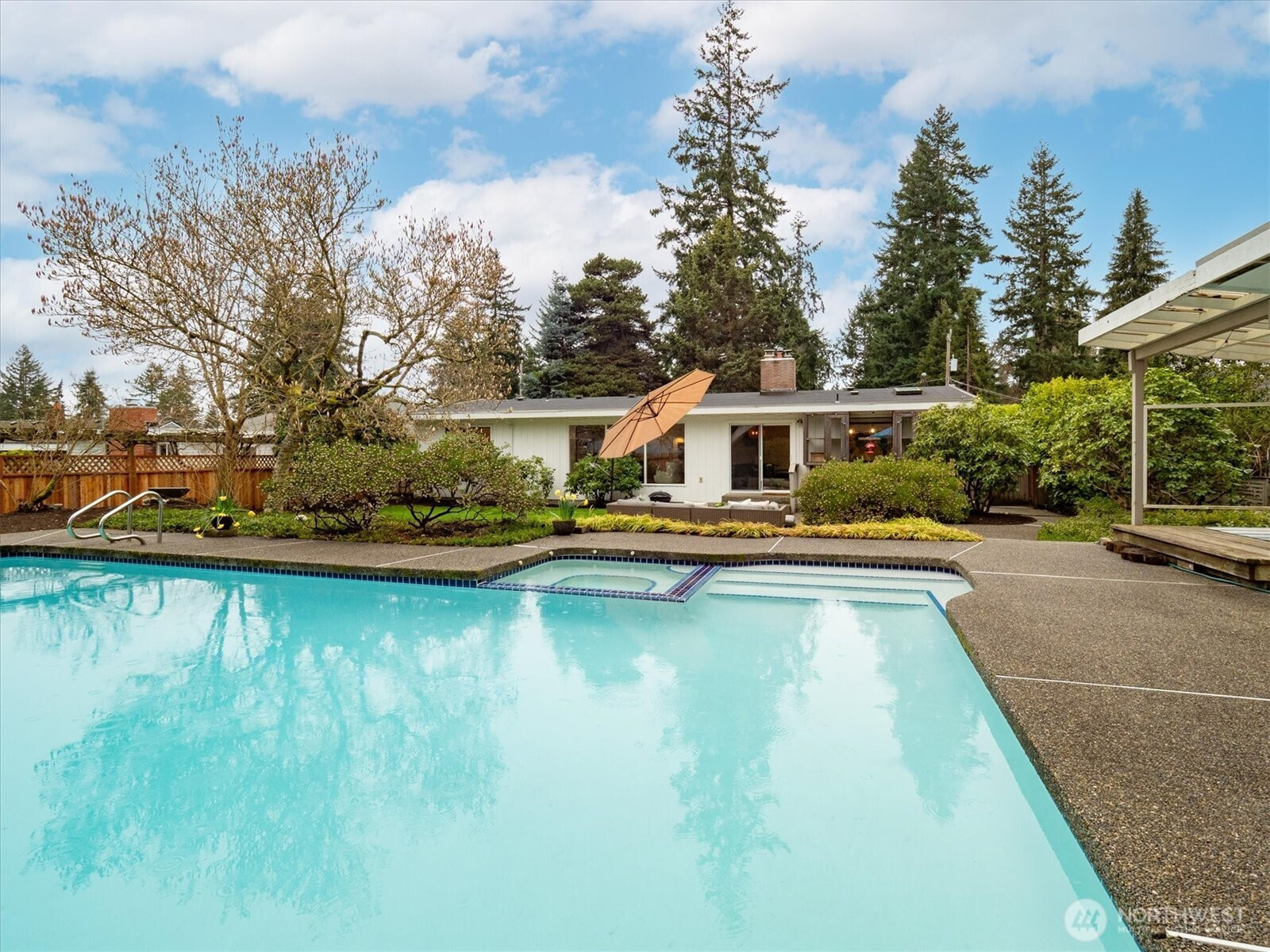 Experience the ultimate in mid-century modern ease in this updated 1956 rambler. Designed for seamless flow, the layout features an open floor plan with two fireplaces that anchor the kitchen, dining, and living areas. This bright, airy heart of the home is bathed in natural light through stunning floor-to-ceiling windows. The thoughtful layout places the bedrooms on a dedicated wing for maximum privacy. The spacious primary en-suite boasts a large picture window, walk-in closet and updated full bathroom. With the two additional bedrooms sharing a centrally located bathroom. Step outside into a professionally landscaped oasis. This level, private retreat is centered around a sparkling in-ground pool and jacuzzi. A stylish cabana with 3/4 bath provides a versatile space for poolside entertaining or quiet unwinding. Tucked away on a tranquil street, yet minutes from I-5 and the Light Rail. This home perfectly balances calm neighborhood with effortless urban connectivity.