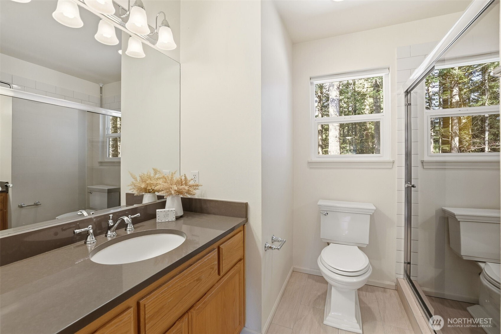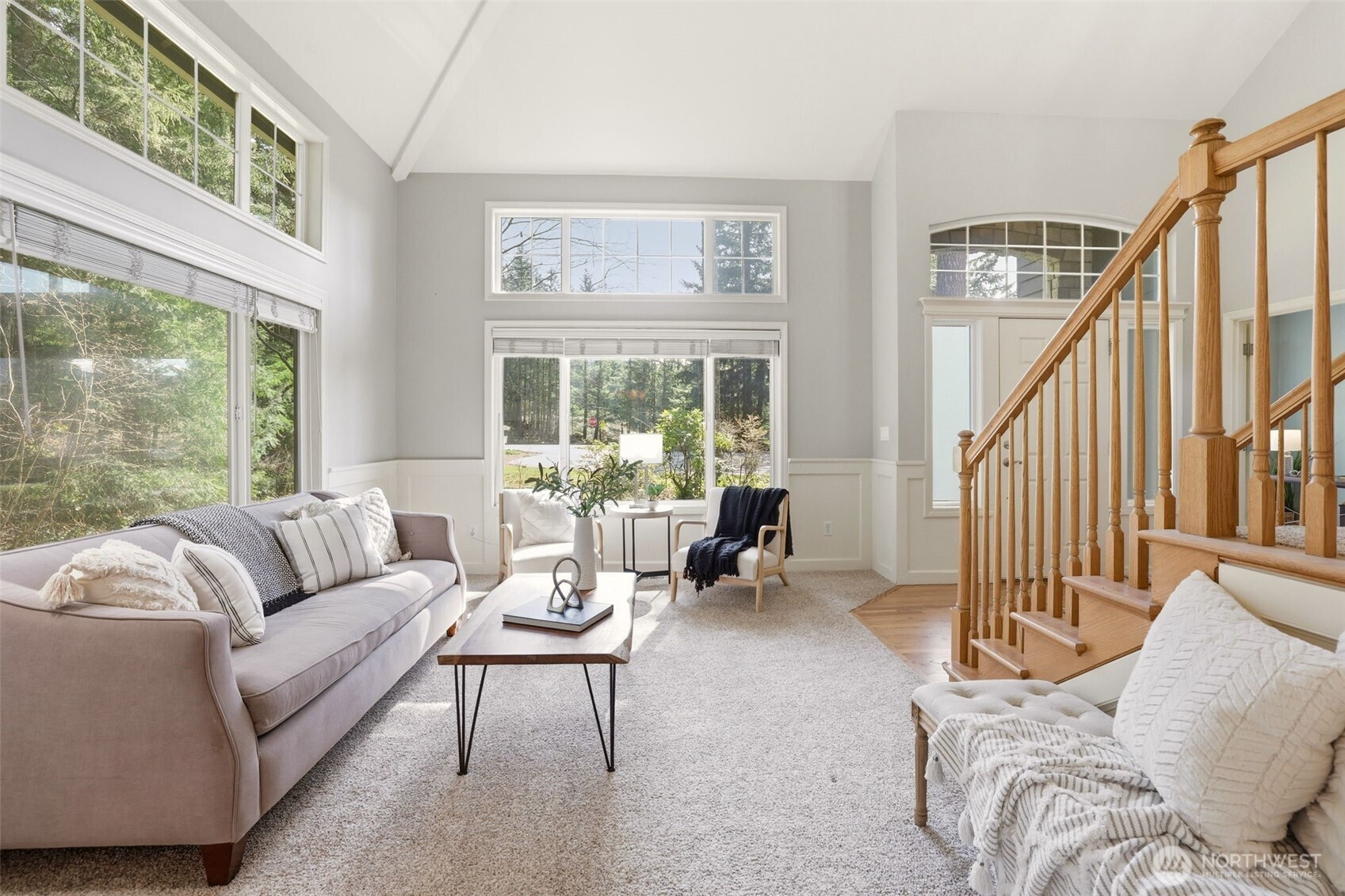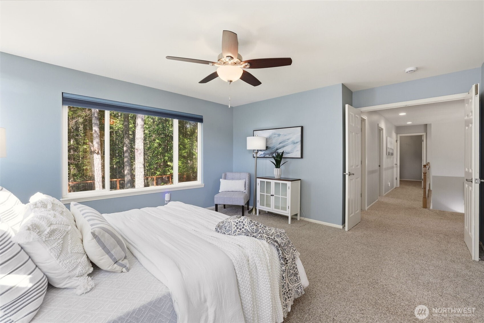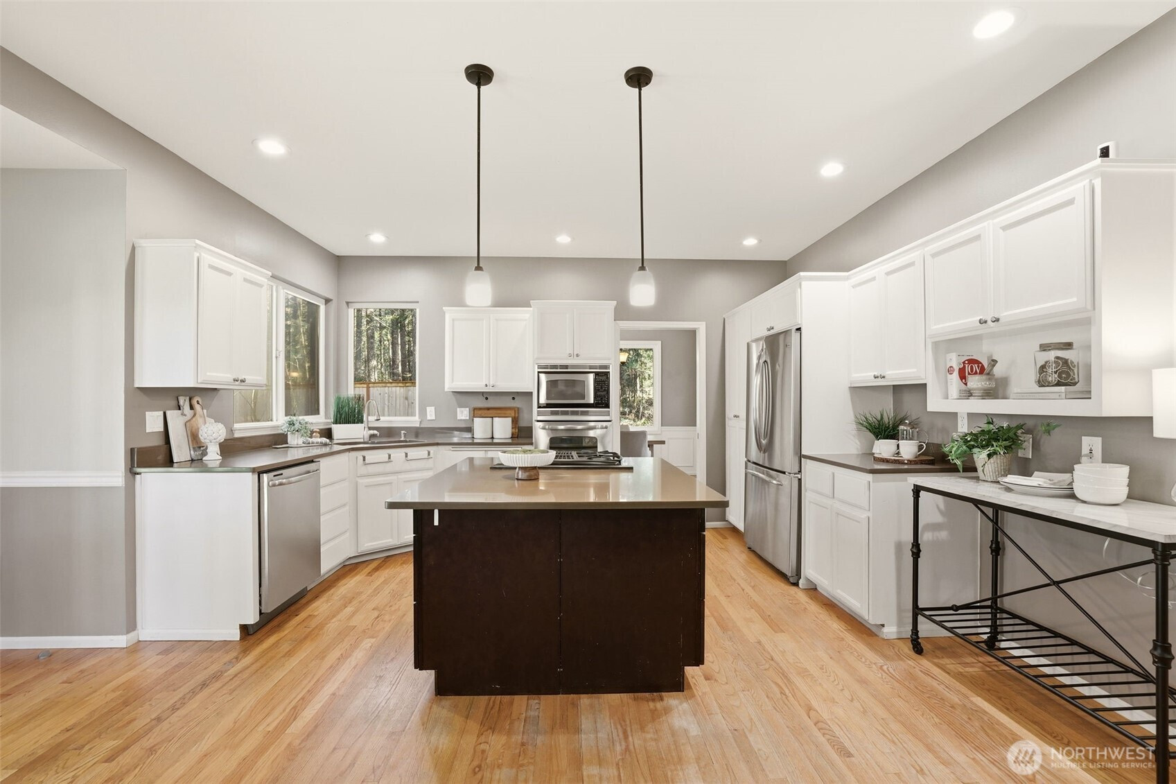North Bend Retreat offers space, privacy, & functionality in a setting that’s increasingly hard to find. Situated on a level, fully fenced shy half-acre at the end of a quiet cul-de-sac with only 1 neighboring home, the property backs and borders protected land ensuring long-term privacy and uninterrupted natural surroundings. Inside, the home is designed for both everyday living and flexibility. The kitchen features quartz countertops & opens directly to the family room w/ a gas fireplace & French doors leading to the backyard. Solid hardwood flooring runs through the entry, kitchen, powder bath, & formal dining. A dramatic entry w/ 20’ ceilings & formal living room creates a strong first impression, while a dedicated office & large main-level bonus room w/ vaulted ceilings offer options for a bedroom, media space & more. Upstairs, the primary suite is positioned to capture mountain views with walls of windows, French doors, & an spacious 5-piece bath. All bedrooms are generously sized, w/ ample storage throughout. The outdoor space is an expansive, level yard featuring a covered cabana with pull-down screen for outdoor movie nights, playhouse, storage shed, and open yard space framed by evergreens and mountain views. Addl highlights include a massive 4-car tandem garage w/ side entry, EV-ready 240V circuit, generator wiring, & quick access to I-90 just blocks away, connecting you to Bellevue, Redmond, & Seattle while living at the base of trailheads & year-round recreation