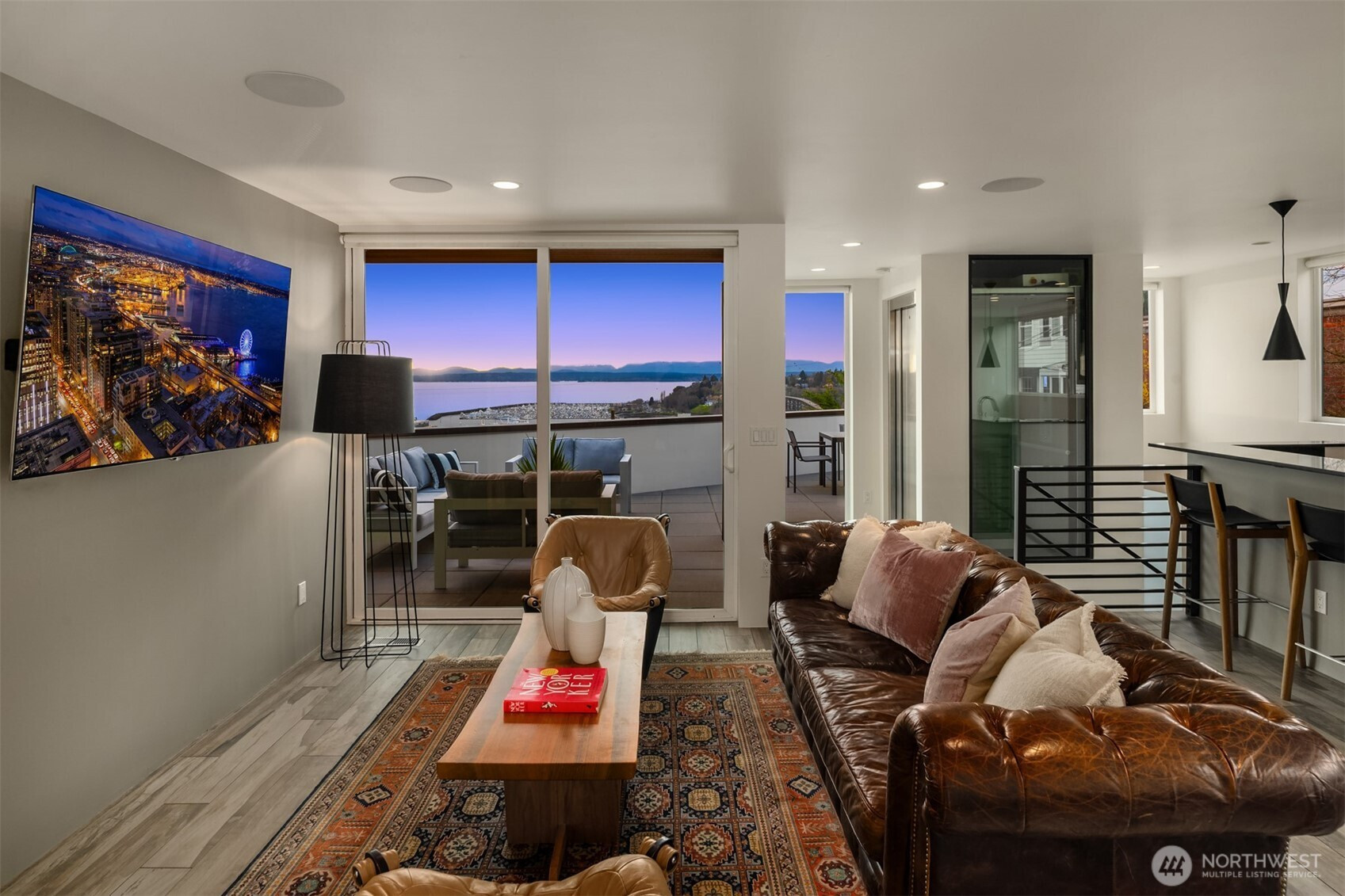 With a premier Queen Anne location, this extraordinary residence offers a bold expression of modern design while showcasing breathtaking views. Savor unobstructed Sound, sunset + mountain panoramas from four levels + spacious outdoor living areas. Expansive windows maximize natural light. Open concept living area is ideal for entertainment with fireplace + gorgeous dining room. Two chef’s kitchens feature Wolf, Bosch + Sub-Zero appliances + wet bar. Bonus rooms include wine cellar + den/home office. Each of the five bedrooms is a private retreat, with some boasting ensuite baths + walk-in closets. Advanced soundproofing throughout for extra comfort. Enjoy Control4 smart-home automation, powering control of lighting, climate, blinds + integrated Sonos audio. In-home elevator for convenience + attached garage with EV charger. Near public transit + vibrant dining options.
