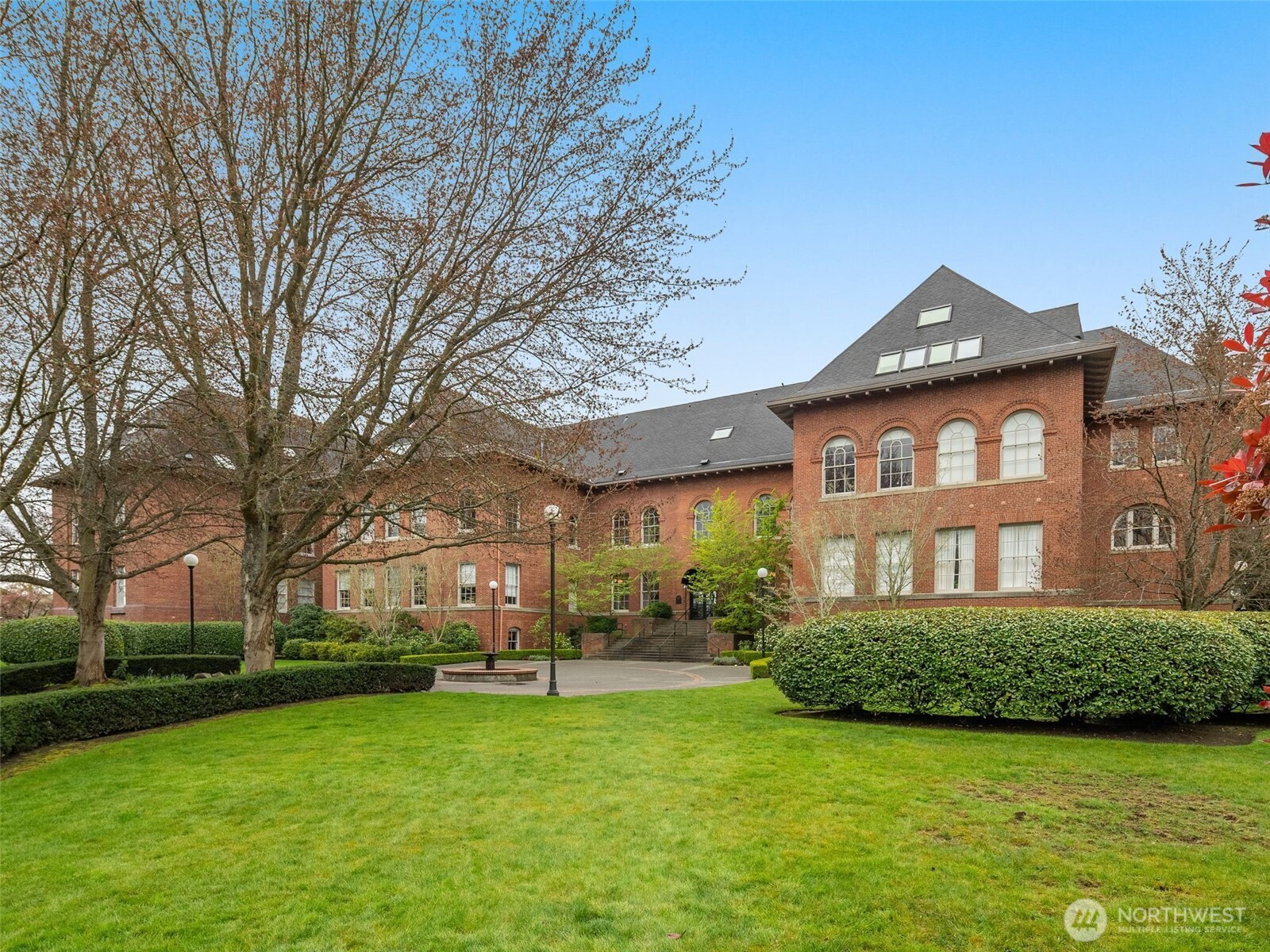 This unique artist’s studio, situated in an ideal location, transforms the former Queen Anne Elementary School into an exceptional “Pied-a-Terre.” The building’s rich history extends beyond its exterior, revealing an arched window salvaged from Pike Place Market and a Georgian Revival column reclaimed from the Governor’s Mansion in Olympia during its 1970's renovation. Thoughtfully remodeled, this studio offers an abundance of efficiency, providing everything necessary for a weekend stay or a full-time residence. Charming details from the building’s storied past, such as exposed brick and soaring ceilings, have been preserved. A private patio provides ample space for gardening enthusiasts and a welcoming area for guests to enter through the backdoor. In-unit laundry, additional storage in the hallway, and a secure parking spot in the garage (with an additional storage shed) ensure all your needs are met. The top-of-hill location places everything you could desire within walking distance. You and your Buyer will fall in love with this unique unit, along with the community that has grown over years of low turnover and strong cohesion in this extraordinary building.