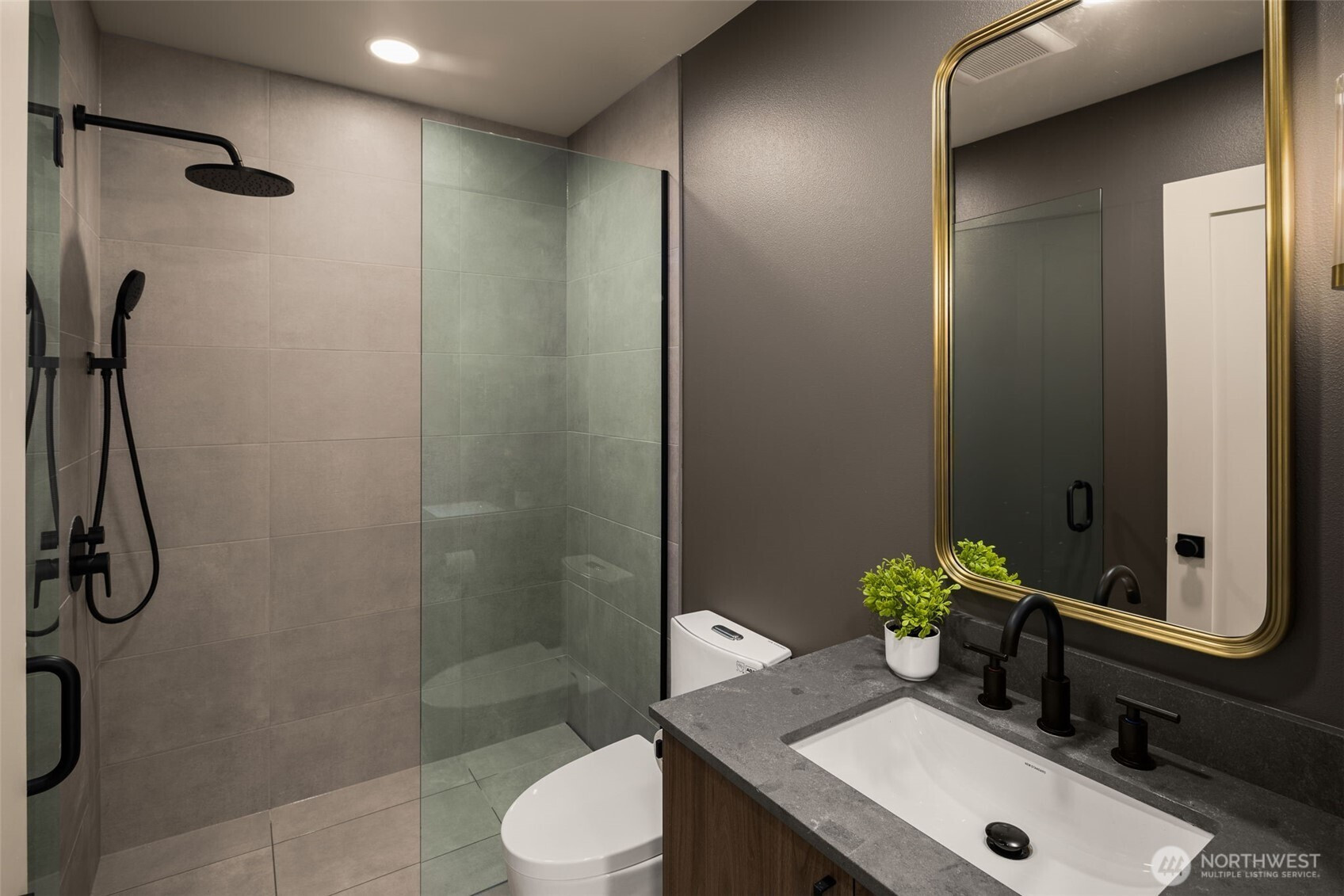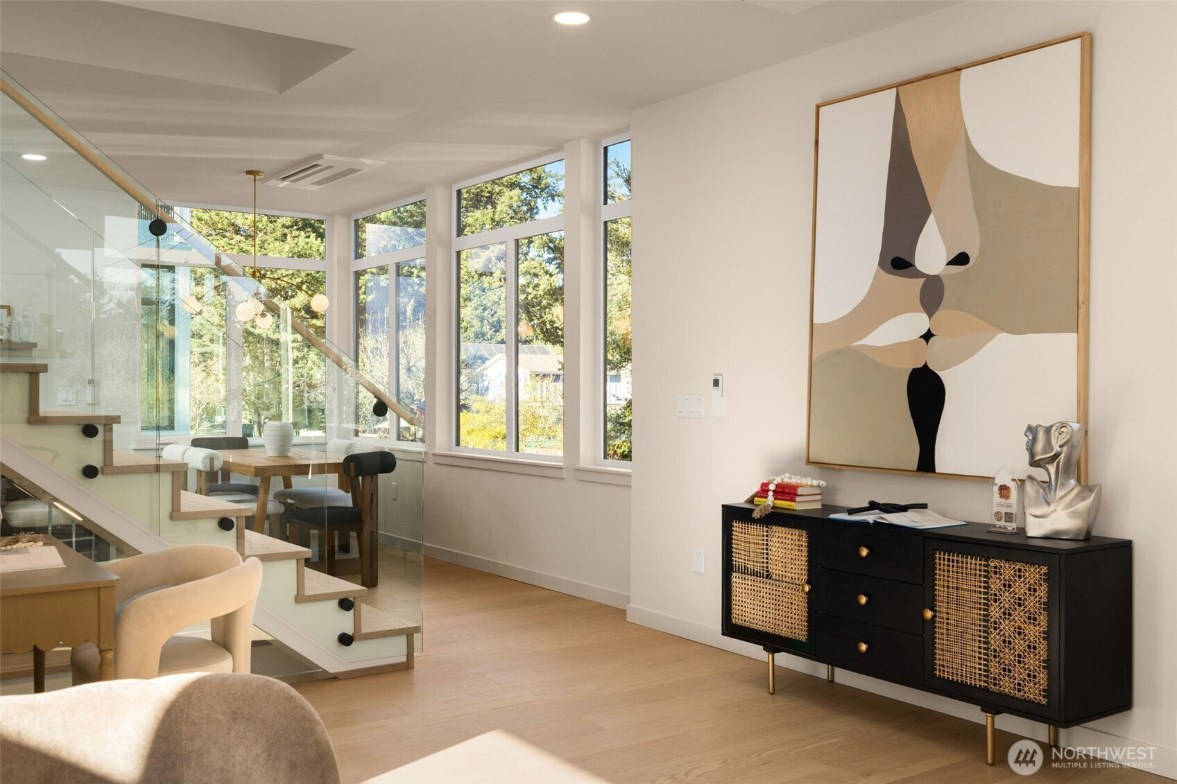 Make every evening feel like a getaway in a primary suite that offers more than just a place to sleep, featuring a private morning deck and a rainfall shower wrapped in floor-to-ceiling slate. This brand-new home offers a polished retreat where sharp architectural lines are softened by warm, organic textures and abundant natural light. At the center of the main level, the kitchen features rich walnut cabinetry and waterfall quartz countertops that transition seamlessly into an airy living space. A sleek, linear fireplace serves as a grounded focal point, while a striking wood-and-glass staircase reinforces the home's open, transparent design. The upper level is dedicated to comfort and flexibility, anchored by the primary suite and supported by additional well-appointed bedrooms that offer the perfect setup for a sophisticated home office or guest quarters. Throughout the residence, white oak hardwoods and matte black hardware provide a cohesive, high-end feel that remains approachable and inviting. Large windows on every level ensure the space feels connected to its surroundings while maintaining a sense of private sanctuary. Practicality is woven into the design, from the fenced entryway and professional landscaping to the convenience of the spacious garage. Every detail has been thoughtfully considered to provide a functional, beautiful space that fits a modern lifestyle in one of North Seattle's most sought-after pockets.