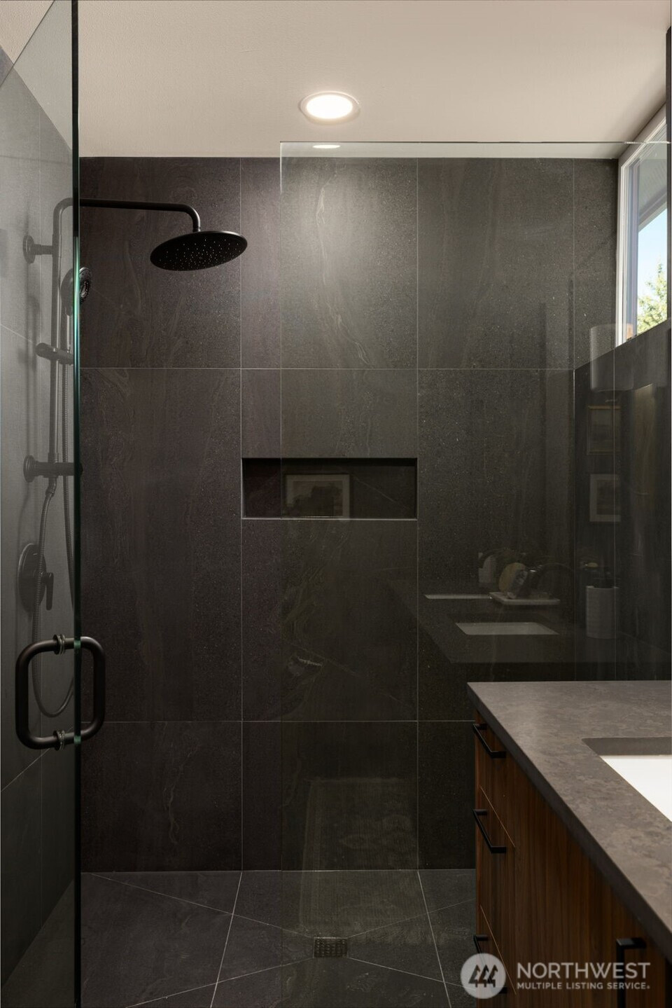 Make every evening feel like a getaway in a primary suite that offers more than just a place to sleep, featuring a private morning deck and a rainfall shower wrapped in floor-to-ceiling slate. This brand-new home offers a polished retreat where sharp architectural lines are softened by warm, organic textures and abundant natural light. At the center of the main level, the kitchen features rich walnut cabinetry and waterfall quartz countertops that transition seamlessly into an airy living space. A sleek, linear fireplace serves as a grounded focal point, while a striking wood-and-glass staircase reinforces the home's open, transparent design. The upper level is dedicated to comfort and flexibility, anchored by the primary suite and supported by additional well-appointed bedrooms that offer the perfect setup for a sophisticated home office or guest quarters. Throughout the residence, white oak hardwoods and matte black hardware provide a cohesive, high-end feel that remains approachable and inviting. Large windows on every level ensure the space feels connected to its surroundings while maintaining a sense of private sanctuary. Practicality is woven into the design, from the fenced entryway and professional landscaping to the convenience of the spacious garage. Every detail has been thoughtfully considered to provide a functional, beautiful space that fits a modern lifestyle in one of North Seattle's most sought-after pockets.