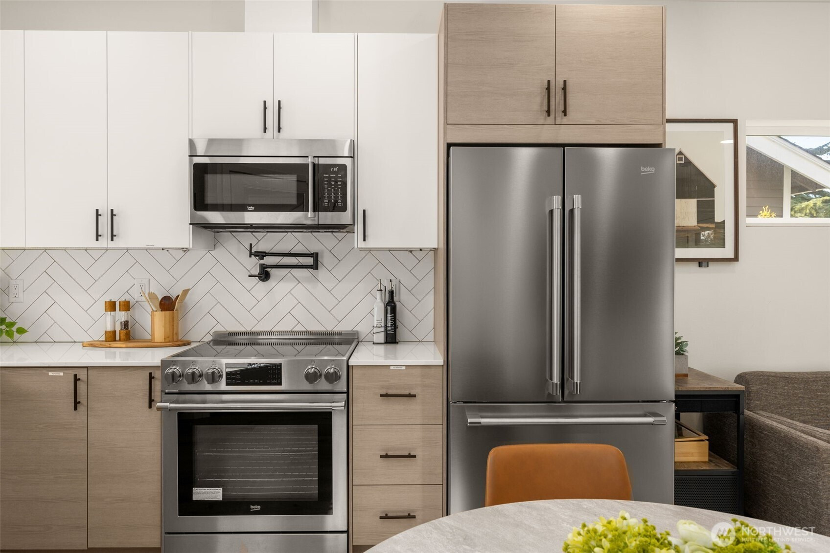 Move-in ready and built in 2023, this modern townhouse blends thoughtful design with high-end finishes. Luxury vinyl plank flooring and custom tile work elevate the interior, while oversized windows bring in natural light throughout. The chef-inspired kitchen shines with stainless steel appliances, a French door refrigerator, and sleek contemporary finishes. Upstairs, the primary suite occupies its own private level, featuring a designer accent wall, walk-in closet, ensuite bath, and a secluded deck perfect for unwinding at the end of the day. Two additional bedrooms and a full bath with a deep soaking tub provide flexible living space on the second level. Modern essentials are already in place, including EV-ready off-street parking, heat pump with A/C, and full-size laundry. Located minutes from Northgate Station, shopping, and dining. This home offers walkability and seamless access to downtown Seattle and beyond. Furniture included if buyer requests!