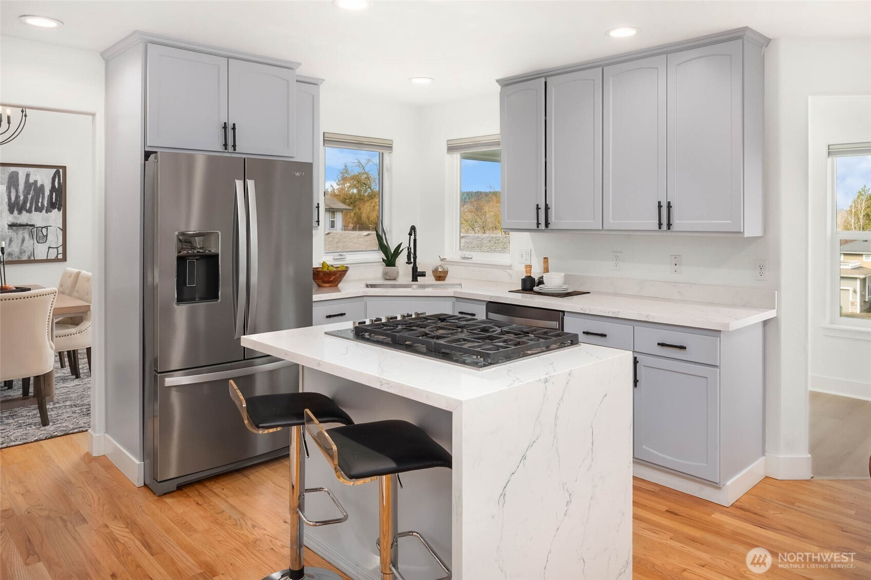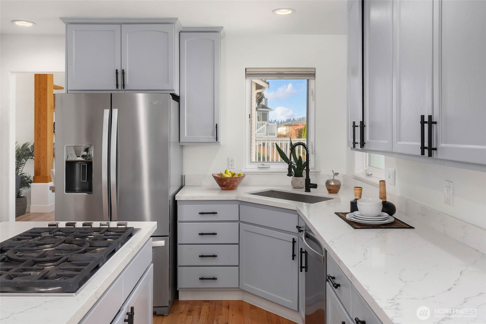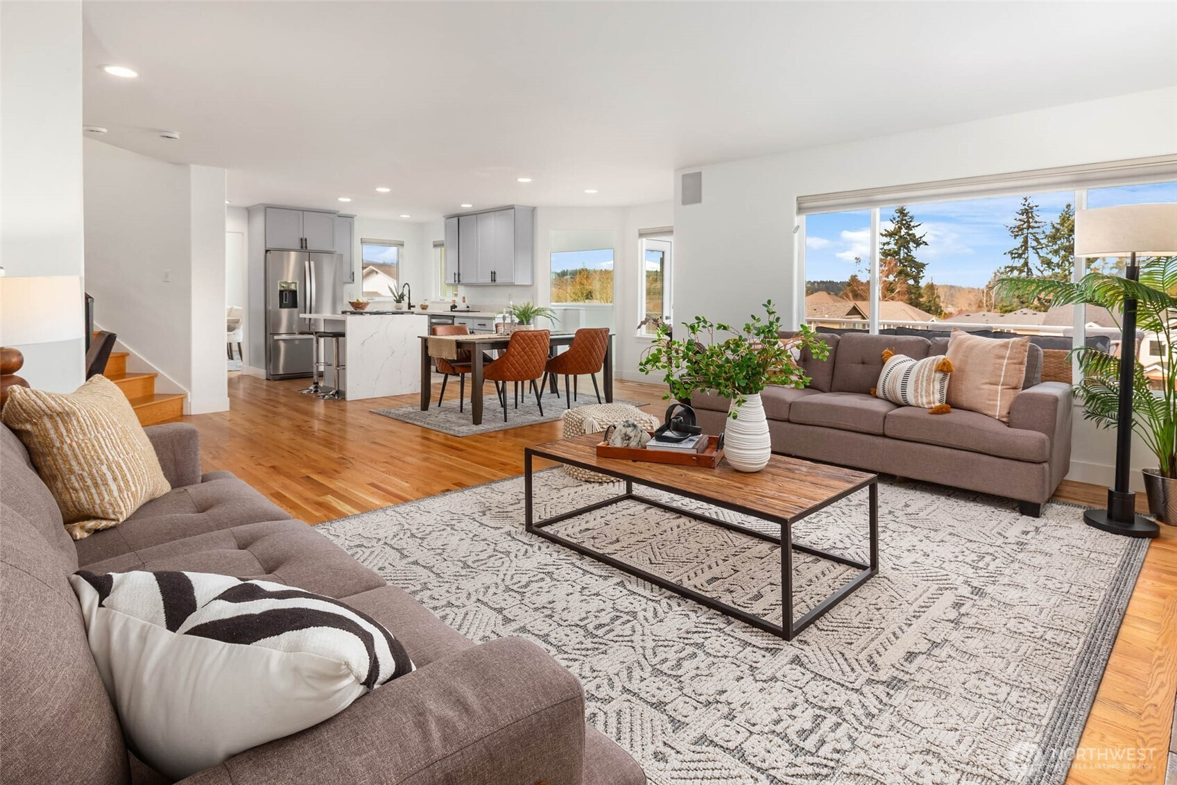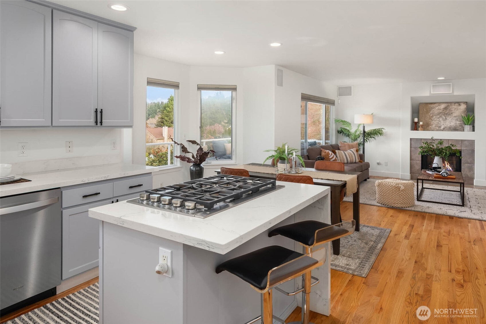 Move right in and enjoy sought-after Lower Kennydale living, where lake views and a versatile layout offer flexibility and room for everyone. A bright two-story foyer welcomes you into a thoughtfully updated traditional home with a modern touch. Sun-filled interiors and a functional floor plan offer effortless everyday living and entertaining, with formal living and dining spaces anchored by expansive windows and natural light. The updated kitchen opens to the inviting family room, creating a comfortable gathering space. The main level also includes a bedroom and ¾ bath for guests or a home office. Upstairs features three generously sized bedrooms, including a spacious primary suite with a luxurious 5-piece bath and view deck. Upgrades include hardwood floors, a new roof, fresh interior and exterior paint, A/C, on-demand hot water, and a dedicated server room for tech-ready living. The lower level offers a fully independent space with a kitchen, 5th bedroom, full bath, full W/D, and dual-sided fireplace—ideal as an ADU, recreation room, or flexible living space for multi-generational living or potential rental income. A 3-car garage and abundant storage throughout add everyday convenience. Enjoy a fully fenced backyard and multiple oversized decks for entertaining or relaxing while taking in the views. Conveniently located near I-405, The Landing, parks, and trails.