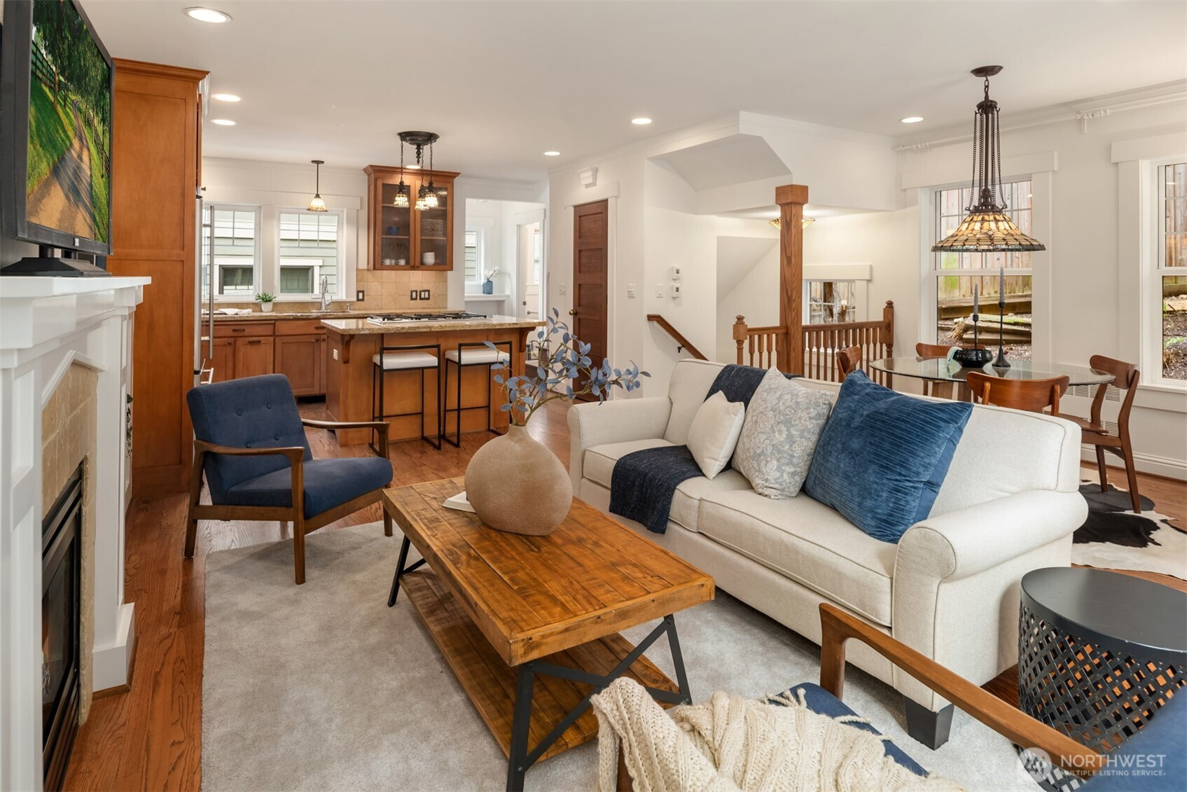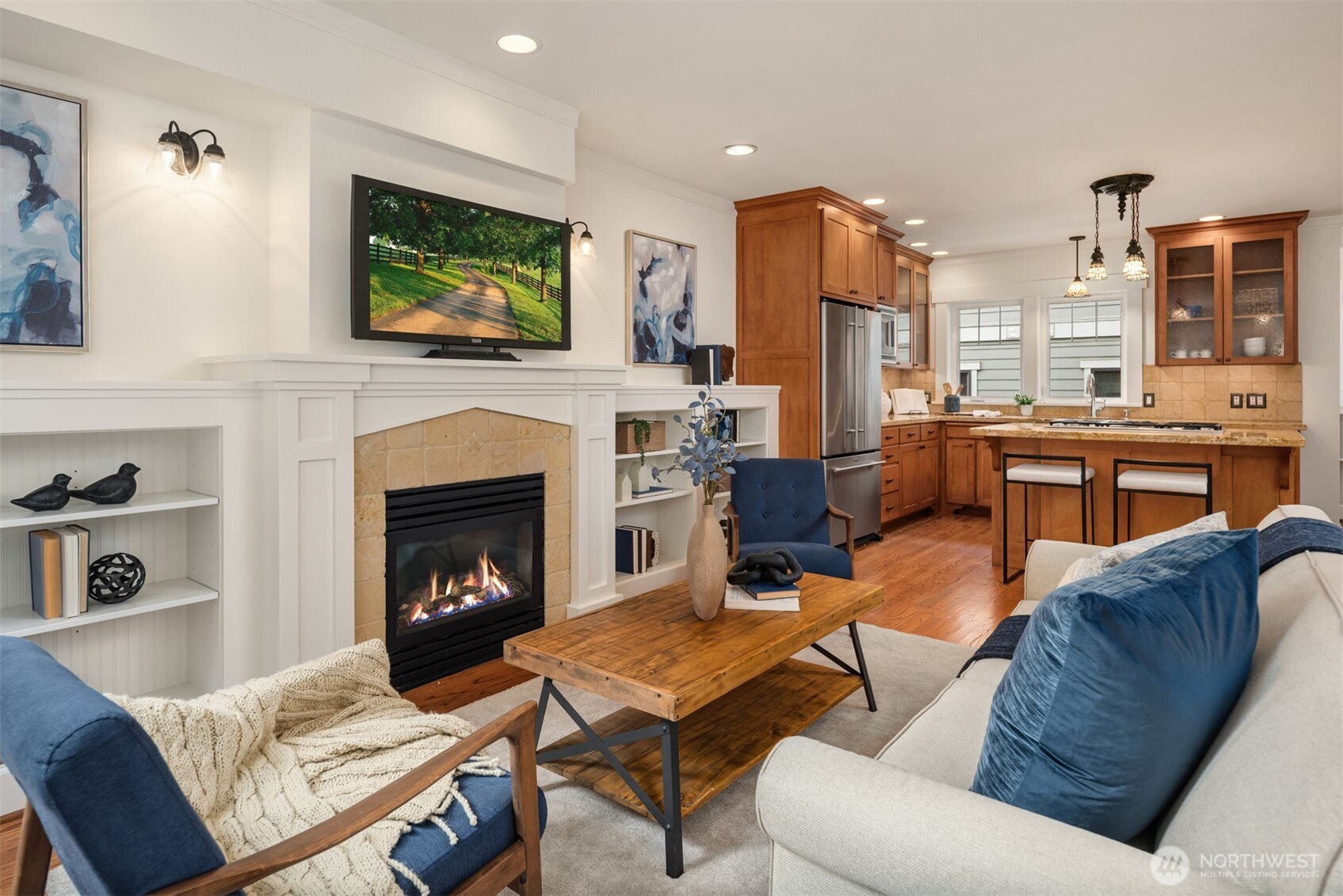 Impeccably crafted end-unit Craftsman townhome by Avalon NW in Wallingford, walking distance to both Wallingford and Fremont. Extensive woodwork and molding throughout, solid hardwood doors, custom light fixtures, and hardwood floors across the main living level. Chef's kitchen with full appliance suite opens to living and dining space, flowing out to a private fenced backyard with stone patio, rare indoor-outdoor living for a Seattle townhome. Upper-level primary suite with vaulted ceilings, skylights, fireplace, and en-suite bath featuring Italian-tiled shower and heated floors. Entry level offers flexible den/office plus oversized attached garage. Two fireplaces, high-tech cabling, and thoughtful finishes top to bottom. Corner lot end-unit layout provides extra natural light and privacy. Steps to the Burke-Gilman Trail, Fremont Brewing, Paseo, PCC, and the Fremont Sunday Market. Wallingford cafes and restaurants along N 45th also within easy reach. Woodland Park Zoo, Gas Works Park, and Green Lake nearby. Near top-rated John Stanford International Elementary (Spanish/Japanese immersion) and Hamilton International Middle School. Bus routes 31, 32, 40, and 62 serve the area with connections to South Lake Union, downtown Seattle, and UW. Bike commute to Amazon/SLU is a flat ride on the Burke-Gilman. SR-520 accessible for Eastside commuters. Built 2006, corner lot, 1,600 sq ft, 2 bed, 3 bath, oversized attached garage. Craftsmanship and location that don't come together often.