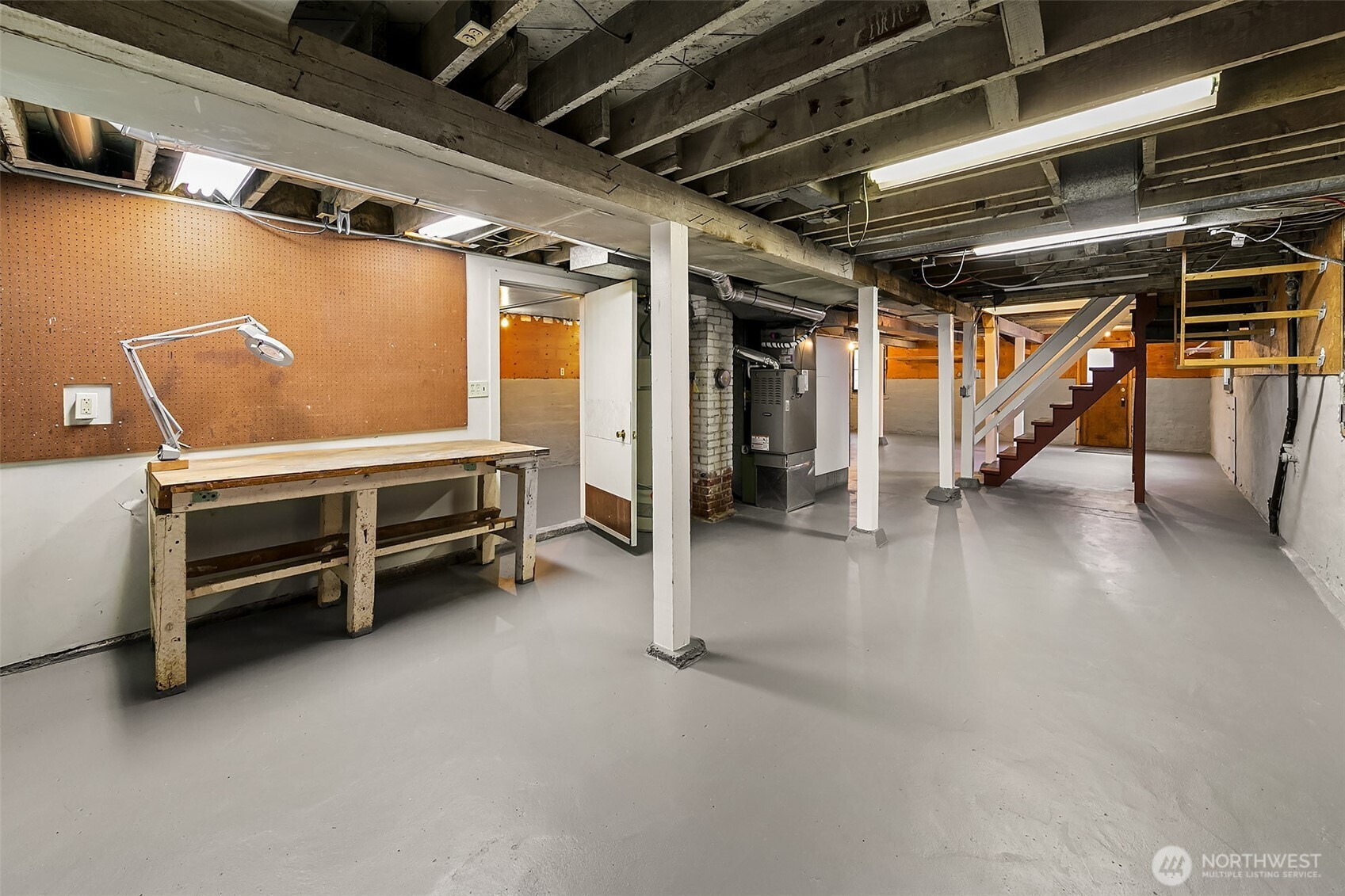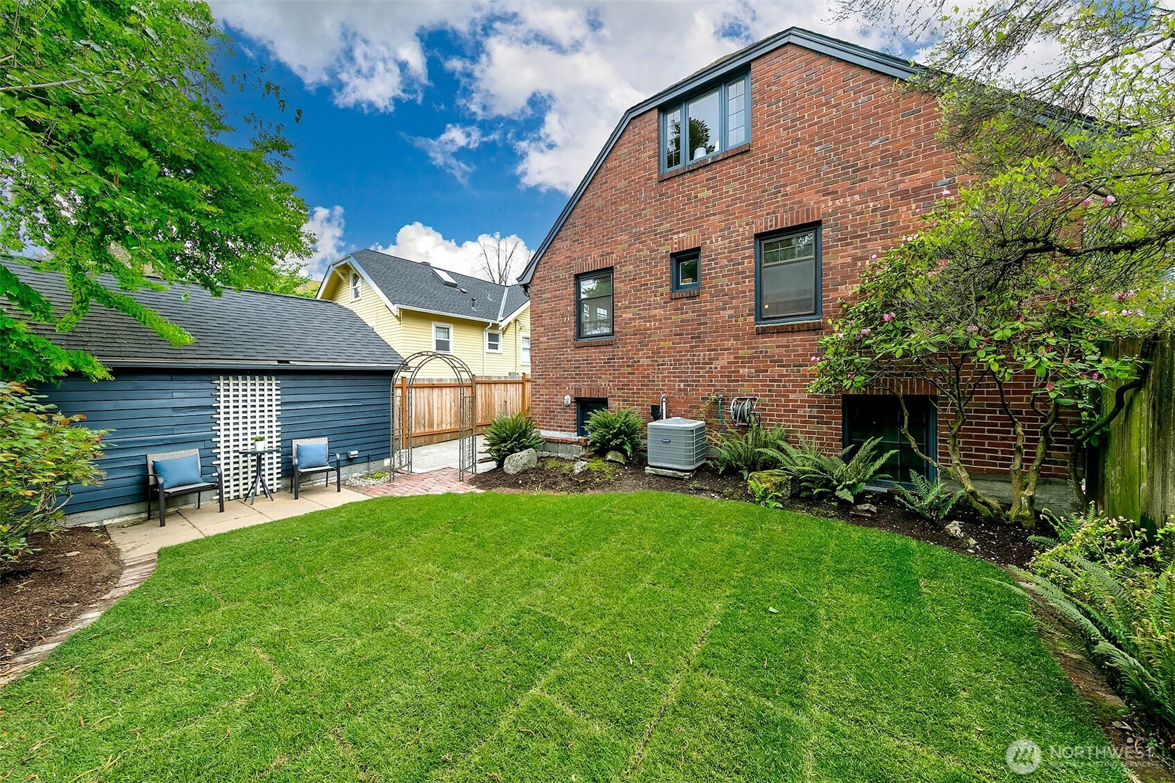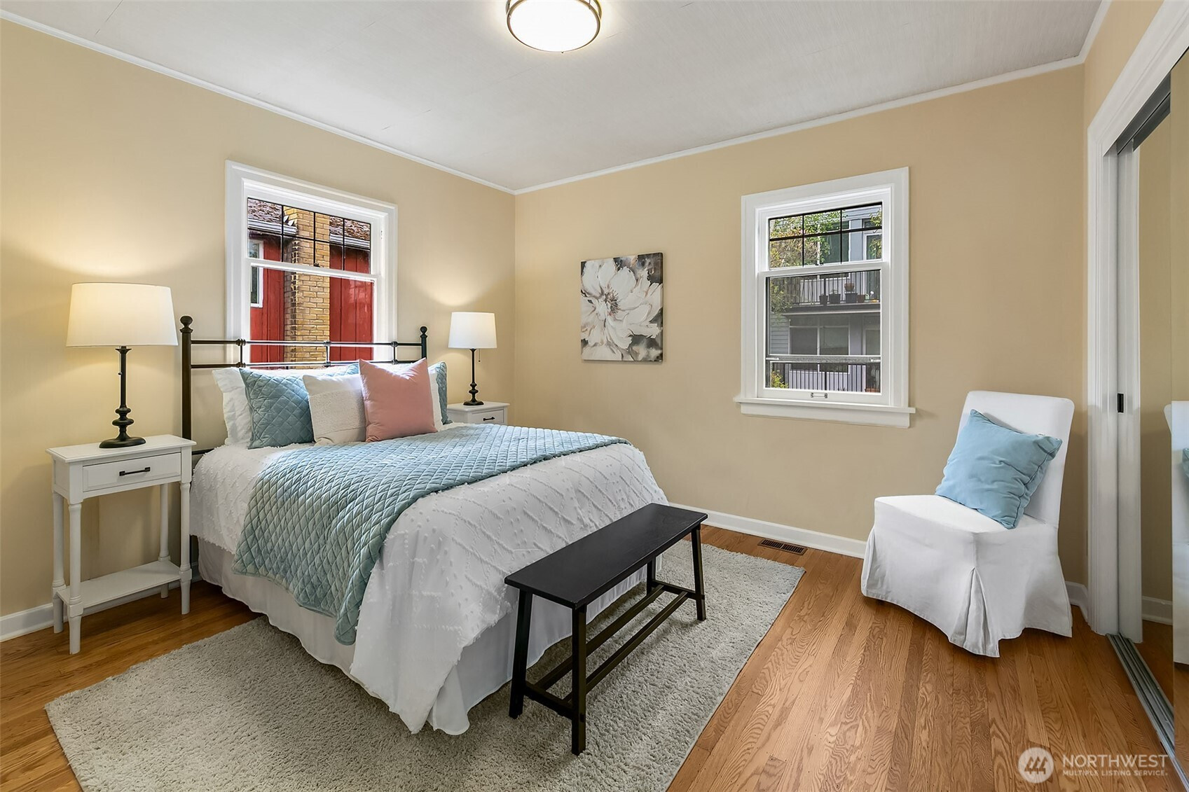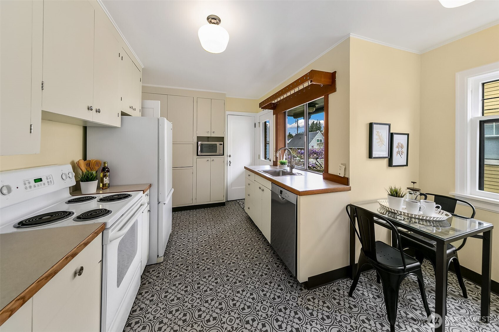Located in the highly desirable Green Lake/Wallingford neighborhood is this 5 bed, 1.75 bath Tudor rich with timeless elegance. Natural light entering through the leaded windows, shining upon the refinished hardwood floors, cozy 1920s fireplace, original light fixtures and classic trim.Bright, clean, and move-in ready, the main floor features a living room, dining room, kitchen with eating space, 3 bedrooms and a bath. Upstairs is 3 more rooms upstairs connected by a common space. Downstairs is a huge open basement with 7-foot ceilings, a bath, and and 1 car garage. This floor is ideal for a home projects, arts and crafts space, a home gym and extra storage. Outside, enjoy a private brick patio and fully fenced yard. This home also has a secure detached garage particularly good for storage, and a parking pad.This home is conveniently located near bike and public transportation, and within a half mile of many restaurants, stores, shops, cafe's and pubs. Come check out this gem.