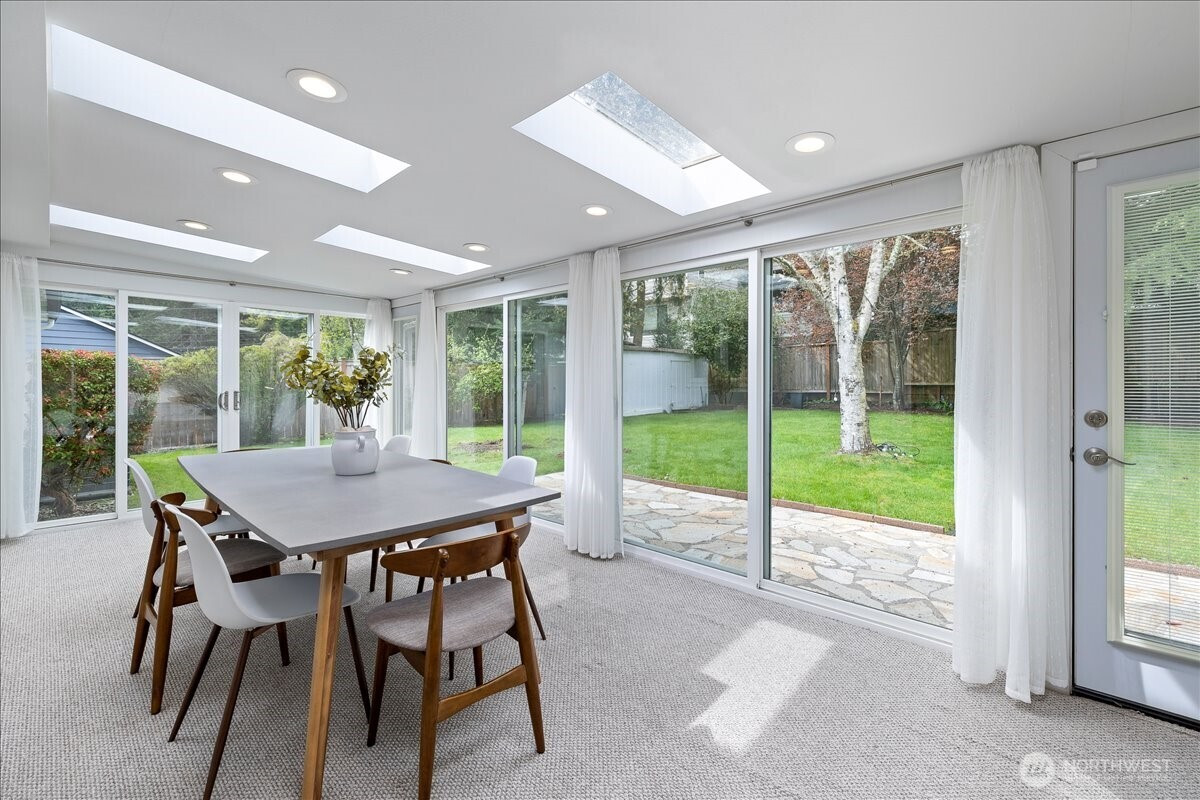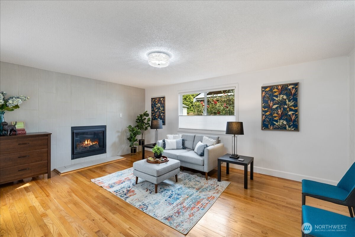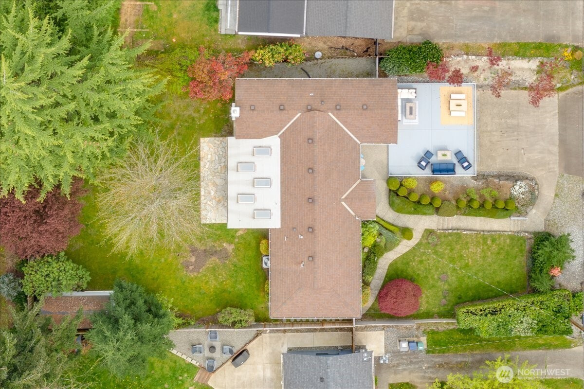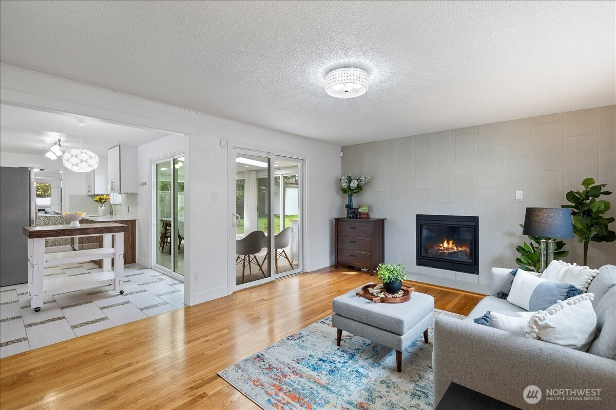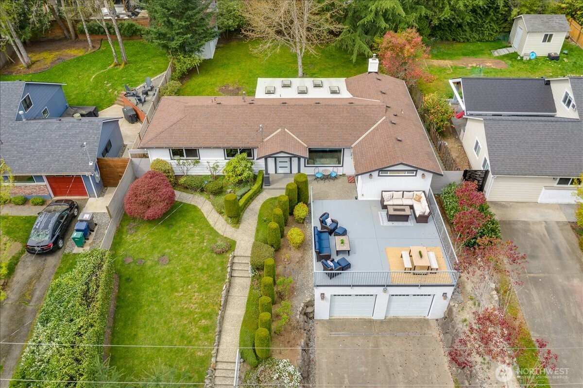 Presenting a truly one-of-a-kind rambler on a large, wide lot offering exceptional space, privacy, and versatility. Thoughtfully designed with three bedrooms on one wing and a private primary suite on the other. A unique feature is the expansive front patio above the 2-car garage, creating an incredible outdoor living space with endless possibilities. Picture an outdoor lounge with BBQ for hosting gatherings, morning coffee just steps from your bedroom, or sipping your evening tea while enjoying pink-sky sunsets. Inside, you will find real hardwood floors, beautiful tilework, & elegant light fixtures that create a warm, inviting feel throughout. The fully enclosed sunroom is a standout feature, complete with sliding doors, skylights, recessed lighting, offering great flexibility as an additional living area. The backyard is fully fenced and landscaped with mature trees, including an apple tree and cherry blossom tree, along with lush greenery that create a peaceful, private outdoor retreat or a great space for pets to play. It's a 3-min walk to Inglewood Village, where QFC, coffee shops, and restaurants are conveniently located. Within a 5-mins drive are St Edward State Park with beach access and The Lodge, Bastyr University, OO Denny Park with Mt Rainier views on clear days, Big Finn Hill Park, and several scenic trails nearby. The highly rated schools in this district make this home and location even more desirable.
