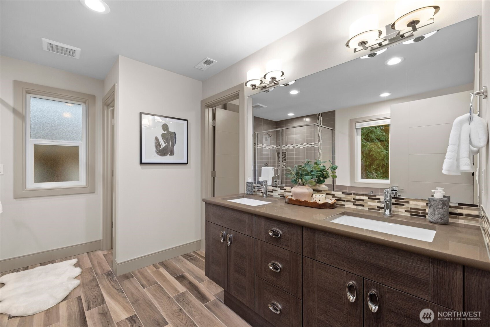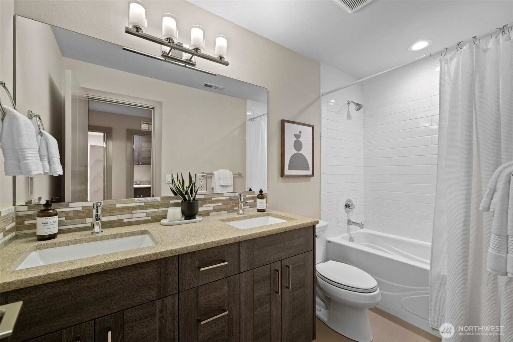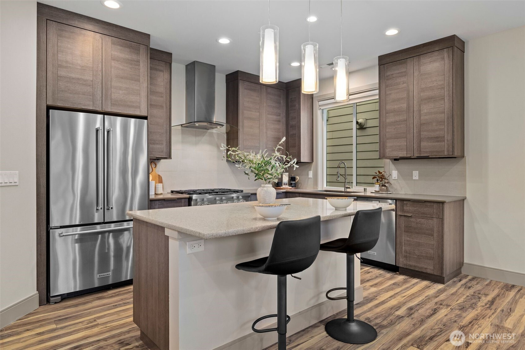 Life unfolds beautifully in this contemporary 5-bedroom Juanita home where light, modern design, and calming treetop views seamlessly come together. Sunlight pours through the open-concept main level where the kitchen, dining, and living space with cozy fireplace connect effortlessly. The chef’s kitchen complete with oversized island, quartz countertops, and KitchenAid appliances, becomes the hub for hosting friends or casual breakfasts. Sliding glass doors extend to an elevated deck framed by tranquil views, an inviting place to sip morning coffee or unwind under open skies. Upstairs, the vaulted primary suite offers a calming escape with spa-inspired bath featuring dual vanities, soaking tub and generous walk-in closet. A spacious lower level adds incredible flexibility with direct access to the private patio and fully fenced backyard. With fresh interior paint, brand-new carpeting throughout, and easy access to Kirkland amenities, walking trails & coveted Lake Washington Schools, this move-in ready retreat blends comfort, style, and everyday livability.