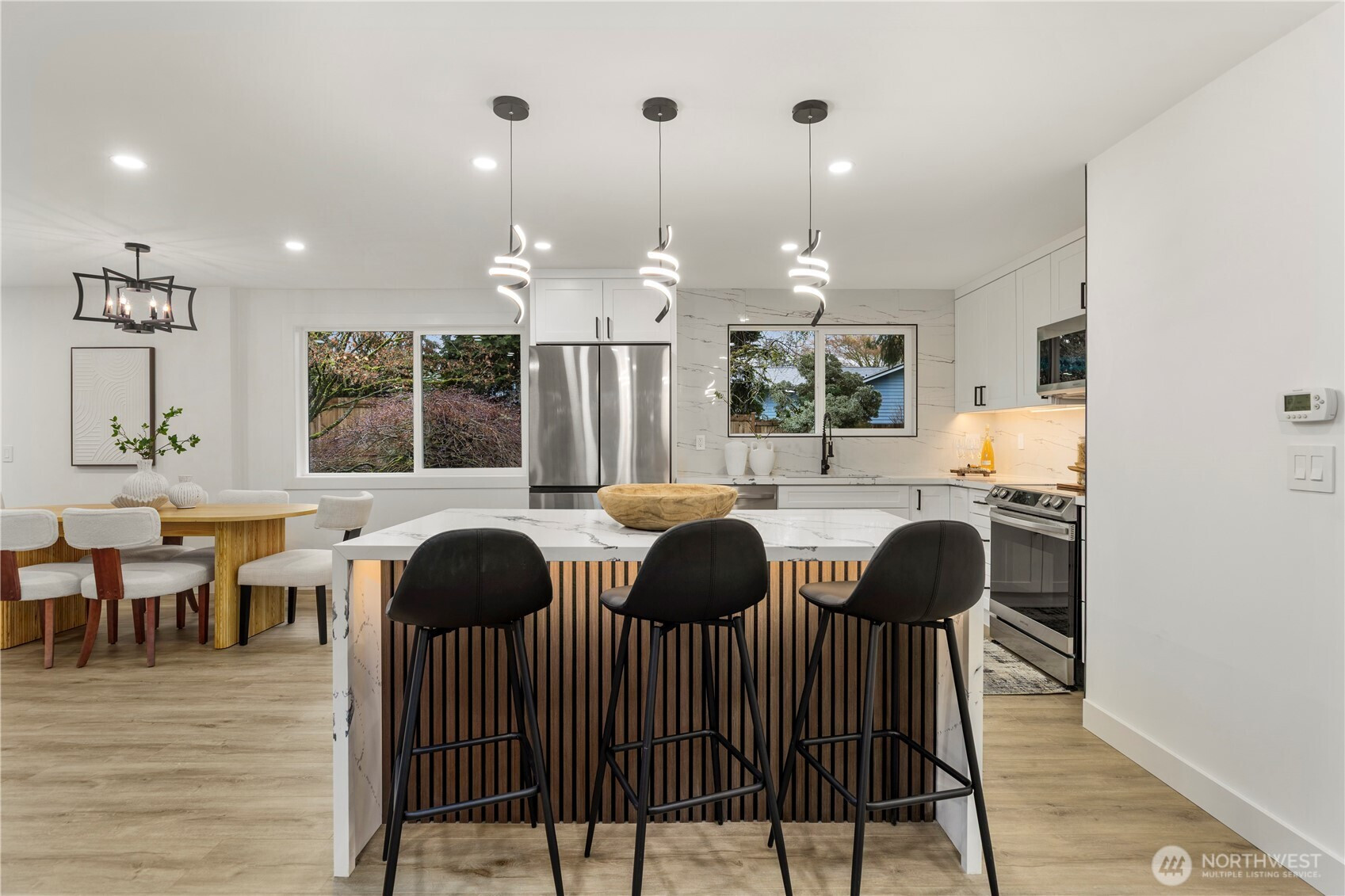 Welcome to this fully reimagined rambler in the heart of Finn Hill - where thoughtful design, quality upgrades, and an spectacular location come together. Set on a quiet street just minutes from highly rated schools, this home delivers both convenience and a true neighborhood feel. Inside, the home has been completely transformed with a bright, open layout, new flooring throughout, and a stunning kitchen featuring Samsung appliances and clean, modern finishes that make everyday living and entertaining effortless. Both bathrooms have been beautifully finished with heated floors, adding a level of comfort you’ll appreciate every day. Beyond the finishes, key improvements like new insulation in the attic and crawlspace bring year-round efficiency. The garage is dialed with epoxy floors and an EV outlet in place. The exterior boasts in striking Nichiha siding, and stands out with a sleek, modern edge. Out back, a lush, private yard creates your own peaceful oasis - perfect for unwinding or hosting. Tour today!