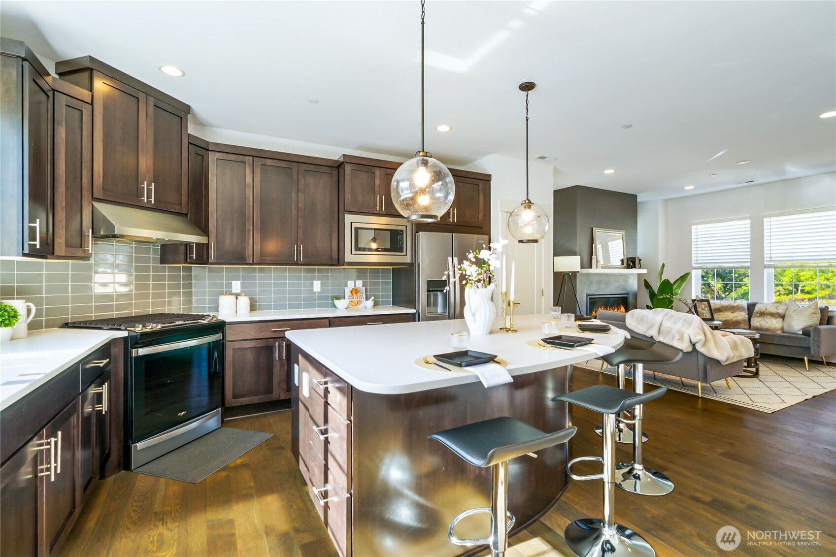 Bright 2-bedroom, 2.5-bath corner-unit townhome with open-concept living, hardwood floors, and modern kitchen with quartz countertops. Enjoy seamless flow from the kitchen to dining and living areas, a cozy gas fireplace, and a convenient main-floor powder room. Upstairs, find two spacious bedroom suites, each with a private en-suite bathroom, ideal for guests, roommates, or a home office. Additional highlights include central air conditioning, an attached 2-car garage, low-maintenance living, and access to a community clubhouse. Located in downtown Duvall, this home offers easy access to shops, restaurants, parks, and walking trails—perfect for buyers seeking comfort, style, and a walkable lifestyle.