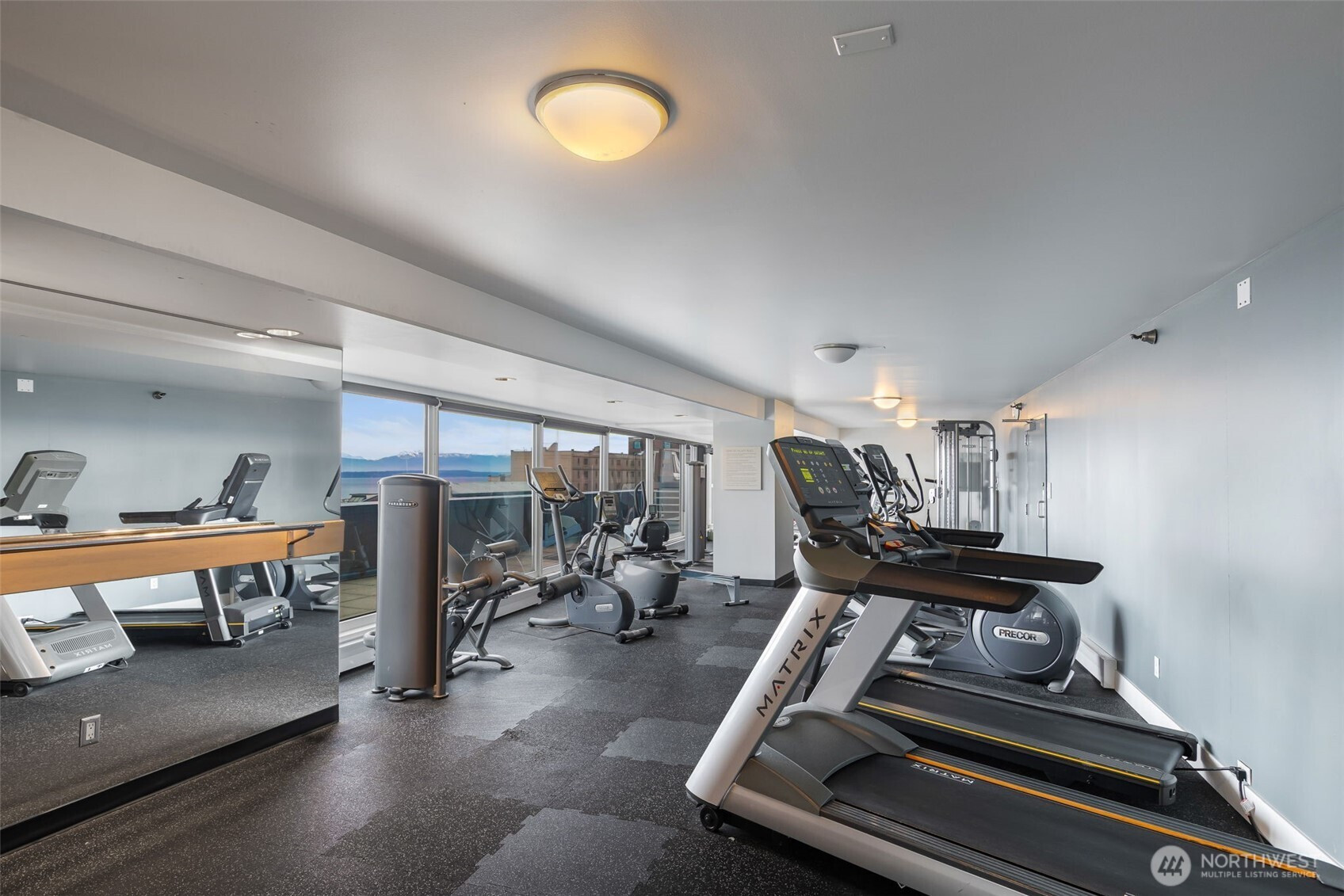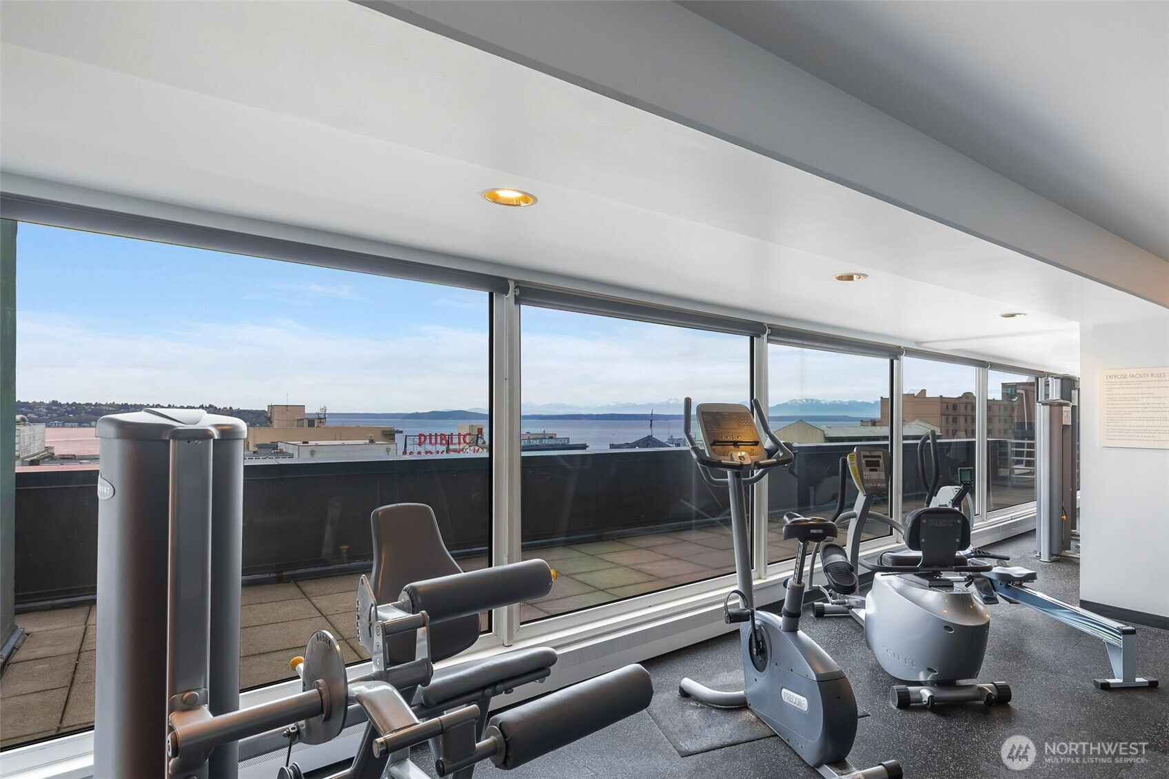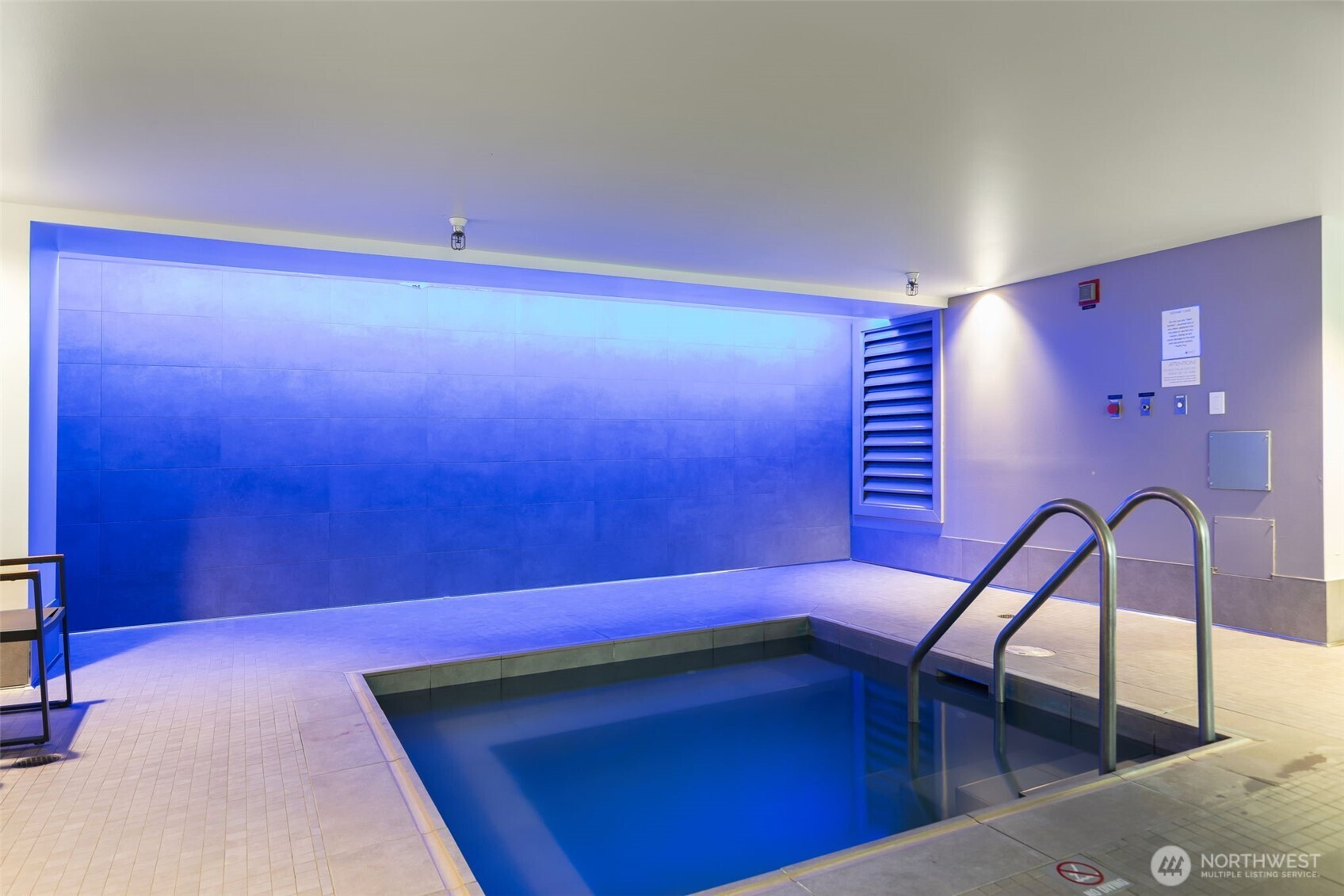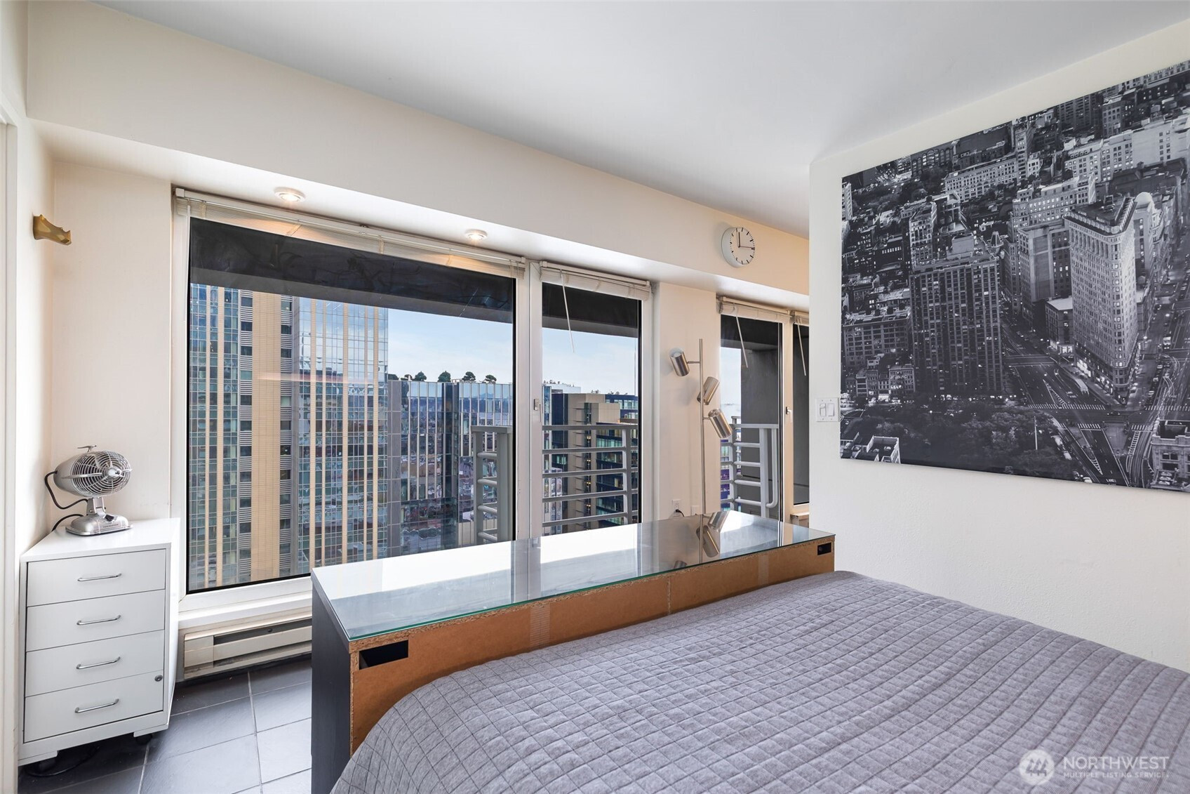 High on the 21st floor of Newmark Tower, a block from Pike Place Market and the Seattle waterfront, this 1-bedroom, 1-bath condo features south-facing, floor-to-ceiling windows with city and partial Puget Sound views. Investor and part time-owner-friendly building with short-term stays allowed and no rental cap. Efficient layout with black slate floors and Juliet balcony. Resort-style amenities include 24-hour concierge, indoor pool, hot tub, sauna, fitness center, outdoor decks, party room, guest suite, business center, storage and garage parking. With Target on the ground floor, daily essentials await. Two blocks from light rail. In time for the 2026 World Cup, this home captures easy living and downtown energy in one exceptional address.