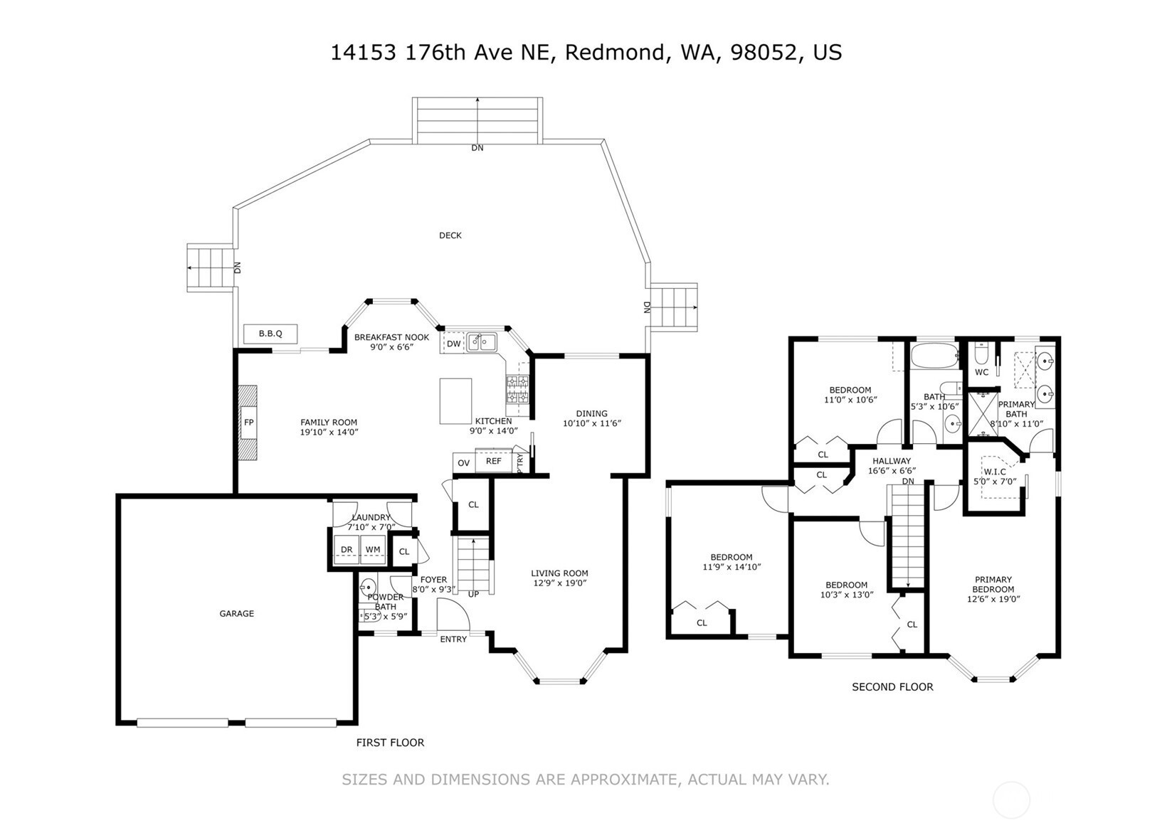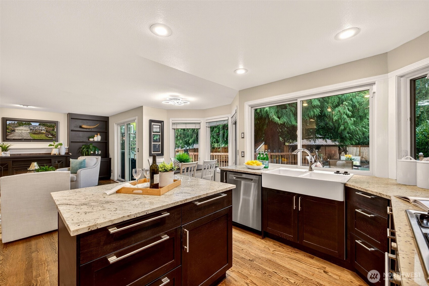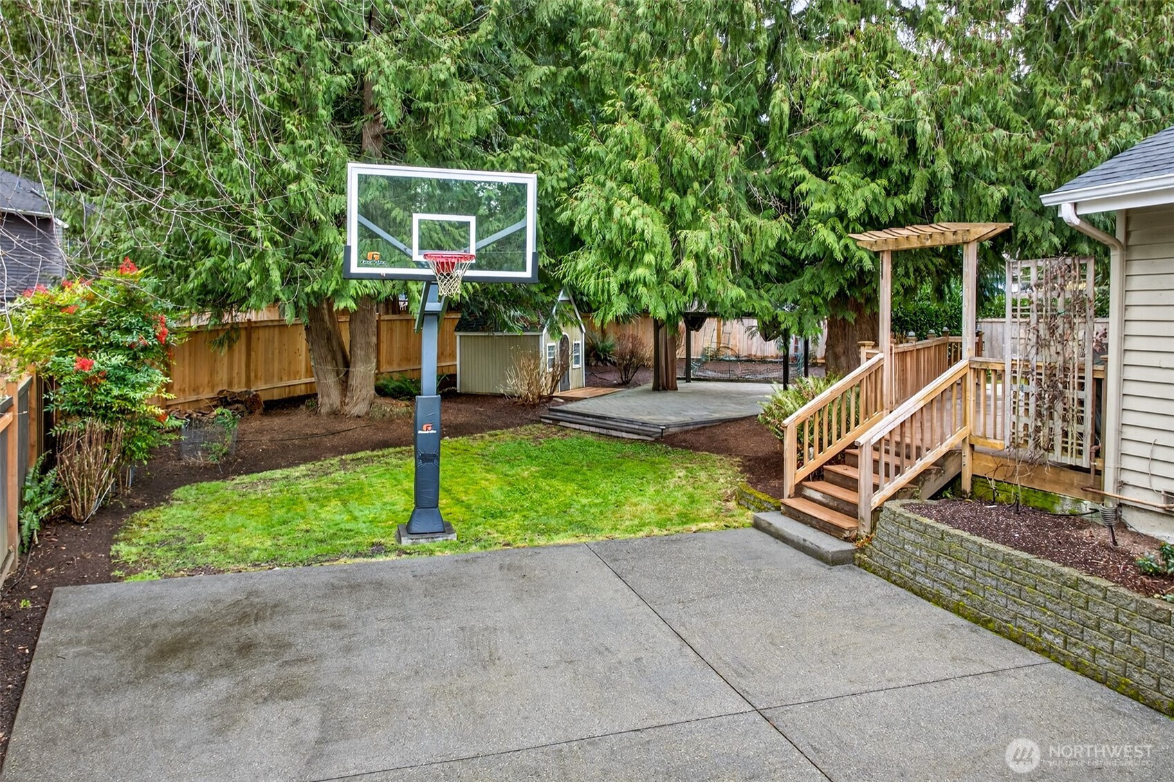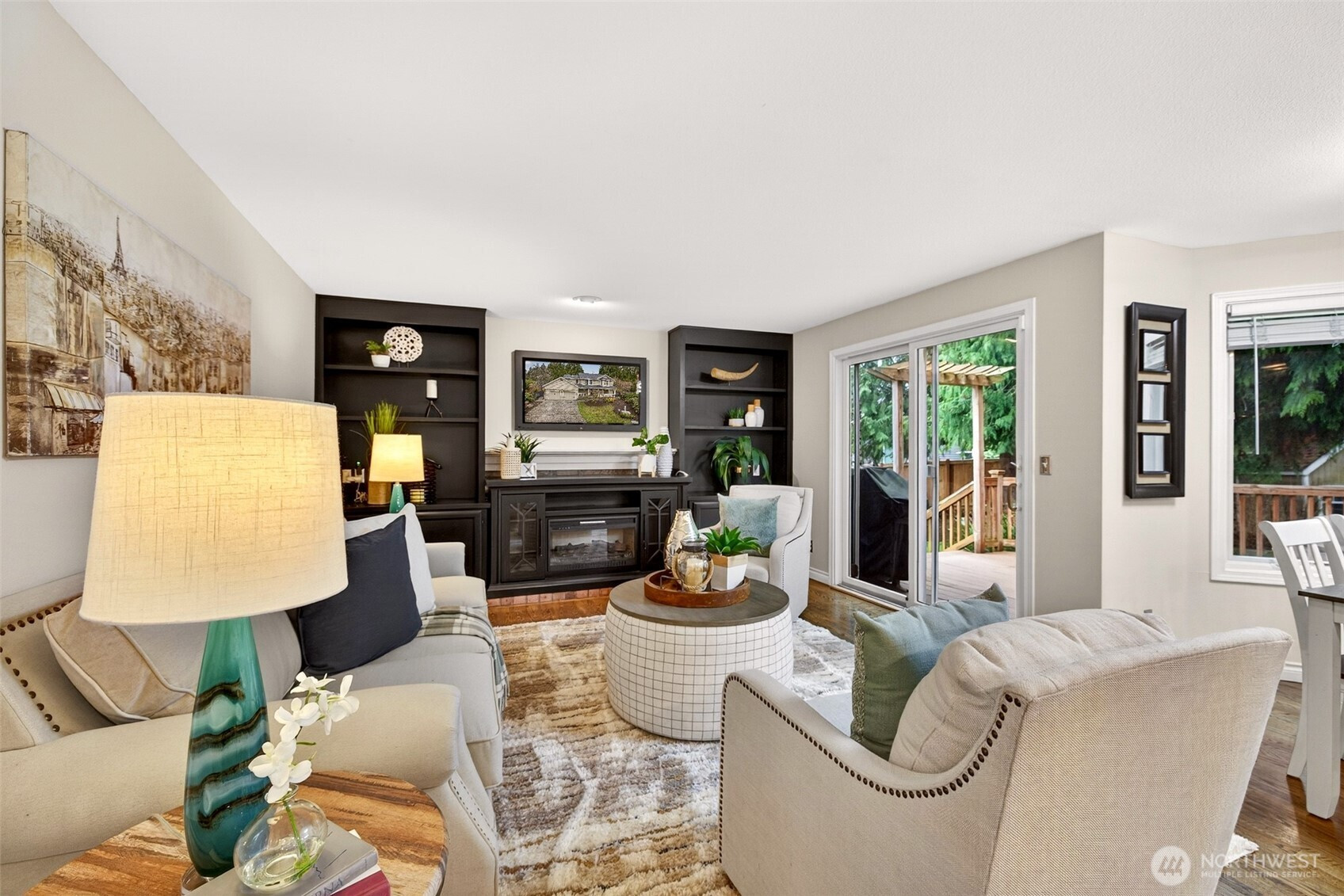 Tucked at the back of a quiet cul de sac in Redmond’s highly desirable English Hill, this beautifully updated two story home blends comfort, privacy, and everyday functionality. Set on a 10,543 sq ft lot in the award winning Northshore School District, including Sunrise Elementary, the 2,090 sq ft layout offers 4 bedrooms, 2.25 baths, and inviting light filled living and dining spaces. The remodeled kitchen features slab granite, a farmhouse sink, newer stainless appliances, a gas cooktop, and an island for easy gathering. The adjoining family room includes an electric fireplace (wood fireplace intact) and built ins, opening to an expansive low maintenance deck, paver patio, and a private backyard retreat with sport court, covered gazebo lounge, playhouse, and lush lawn. Primary suite includes vaulted ceilings, bay window, dual vanity, double shower heads, and custom walk in closet. Murphy bed included. Major updates include roof and furnace (2024), central A/C (2023), high quality windows, and EV charging. Seller to include gas BBQ grill and electric fireplace.