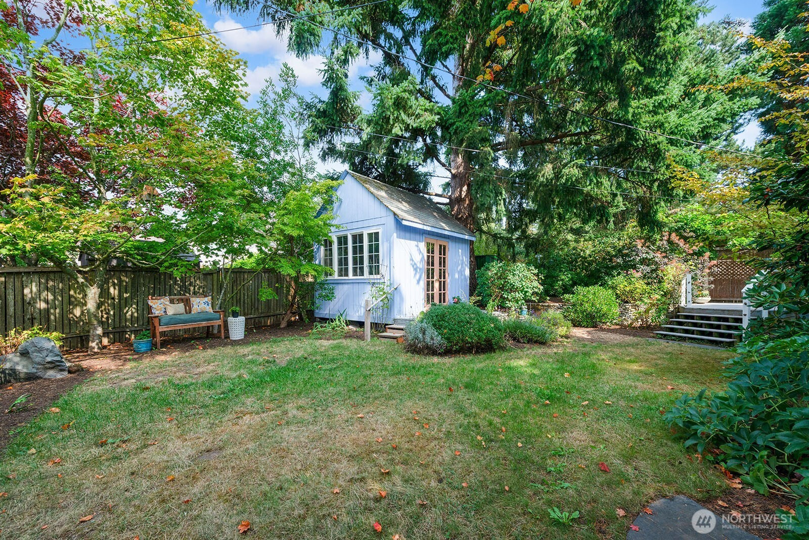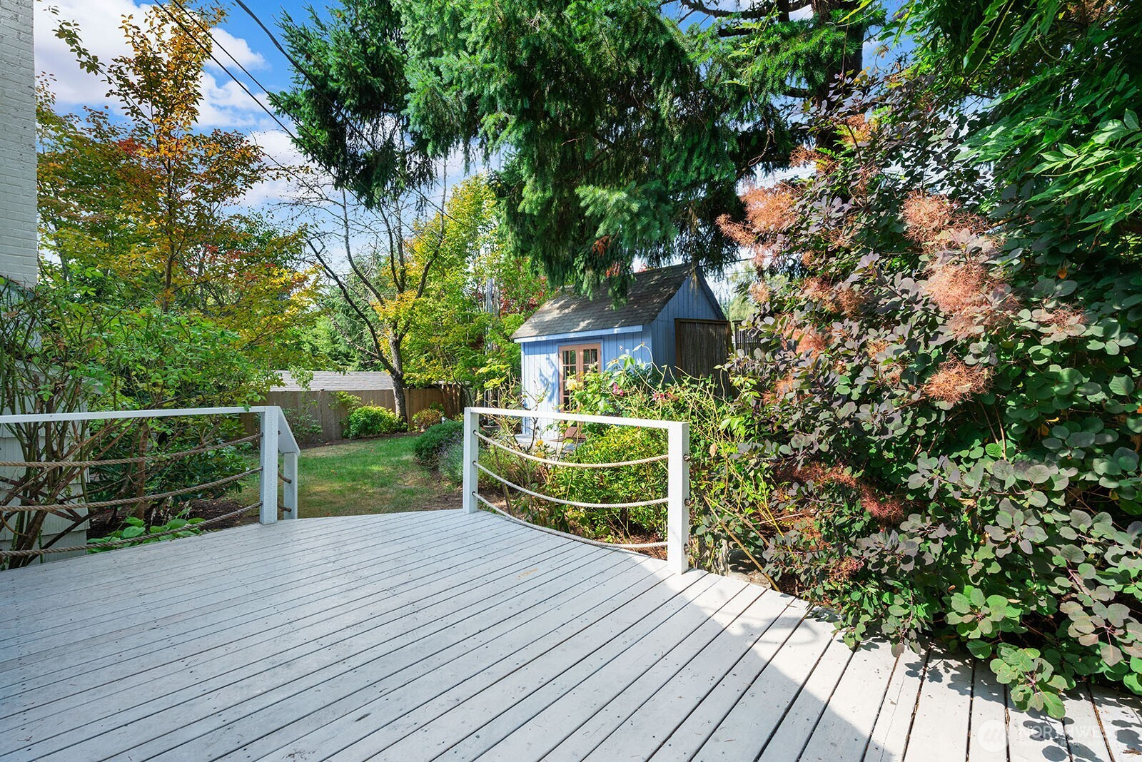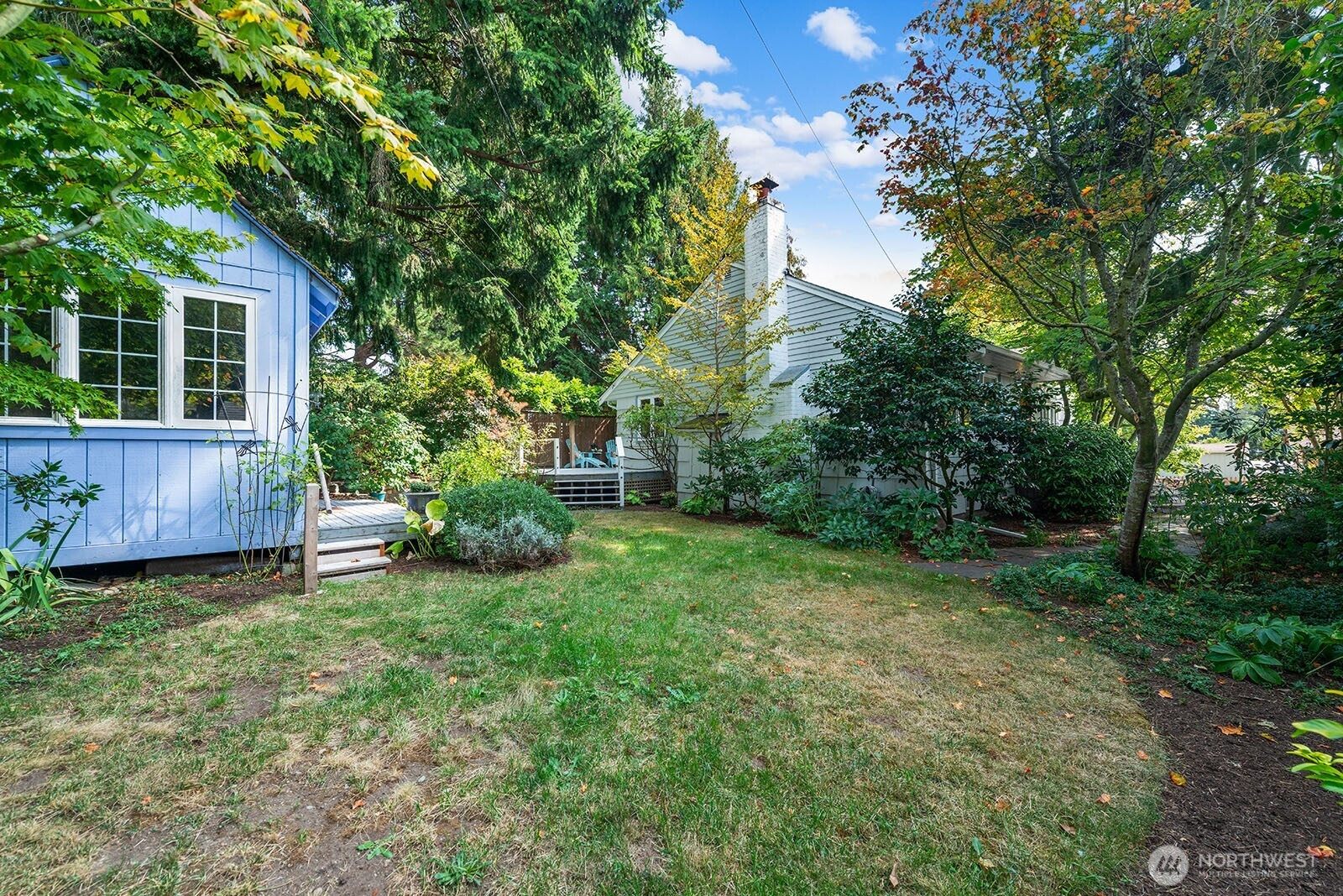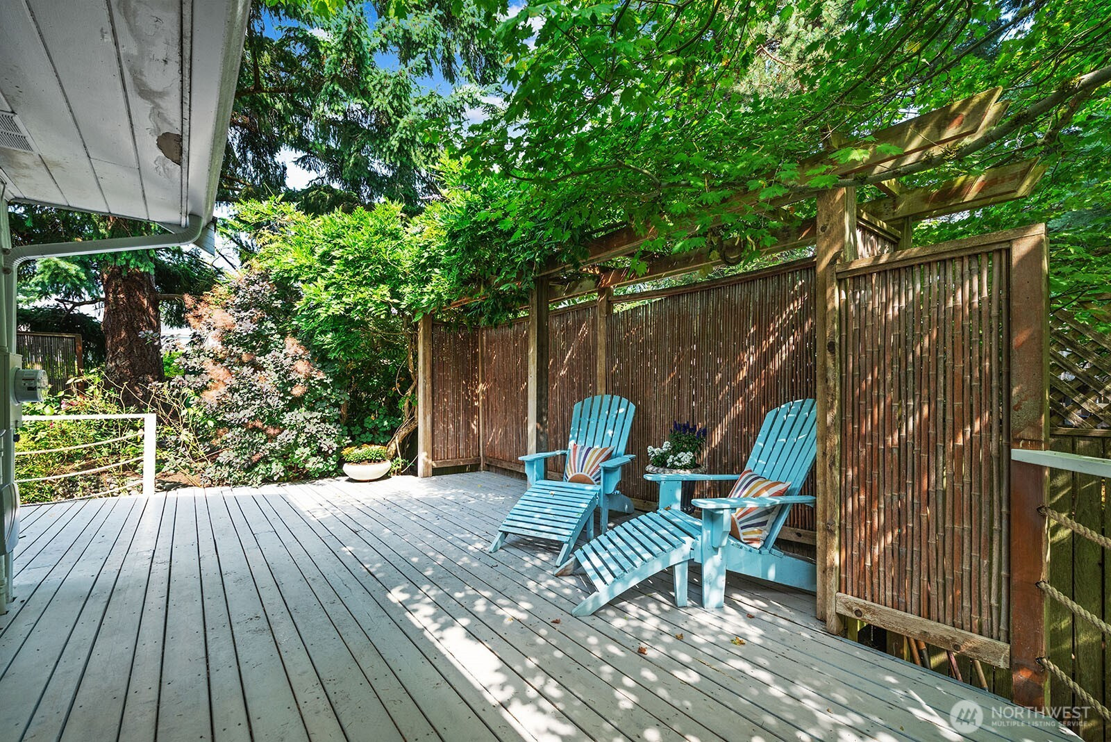 Tucked down a private lane, this 1930's Richmond Beach home offers a spacious LR w/hardwoods, oversized brick fireplace w/adjacent dining area that leads to the entertainment-sized deck. Sunny kitchen with oak cabinetry, granite counters, skylight and updated appliances. 3 bedrooms on the main floor along with 3/4 bath. Lower level could be a separate apartment with 800 sq. ft of functional space: living room, bedroom, cute kitchen and outside access (previously rented). Laundry machines on each floor of the home. Features: comp. roof, vinyl windows and detached artist's studio. There is a private, terraced yard with an abundance of mature plantings & landscape. Slate pavers lead you up to the home from the off-street parking.