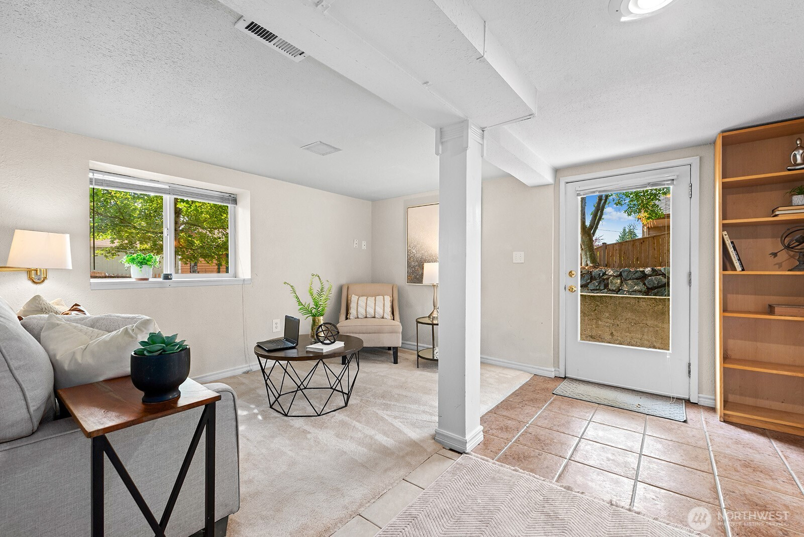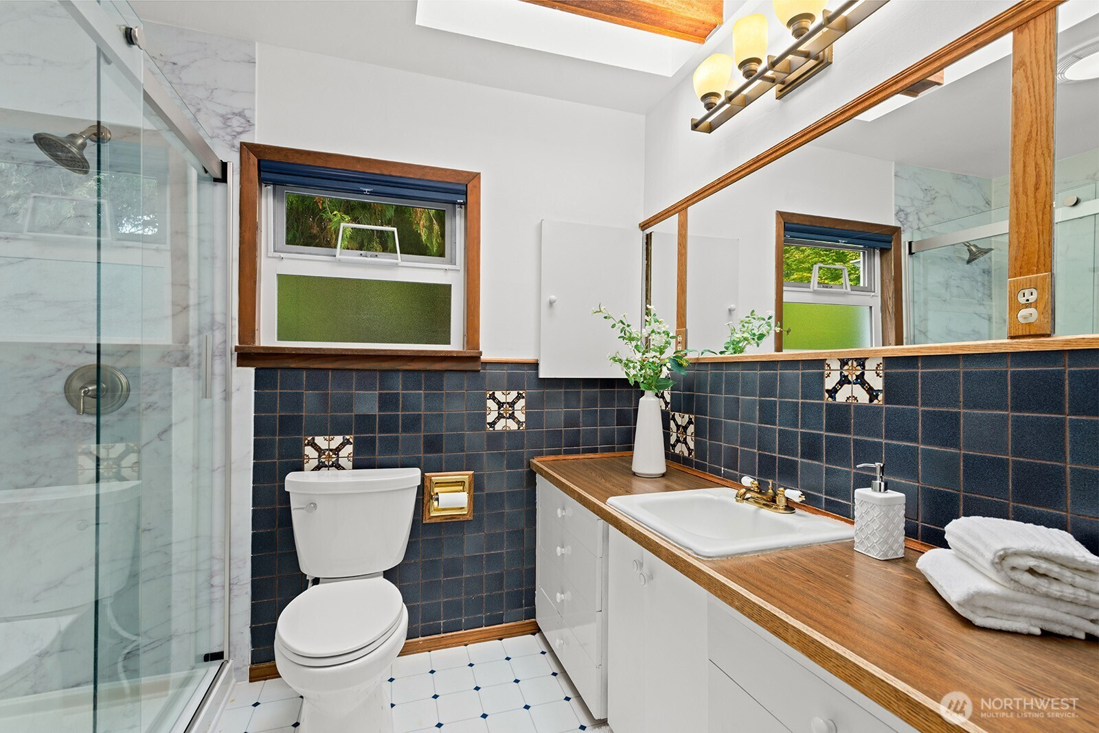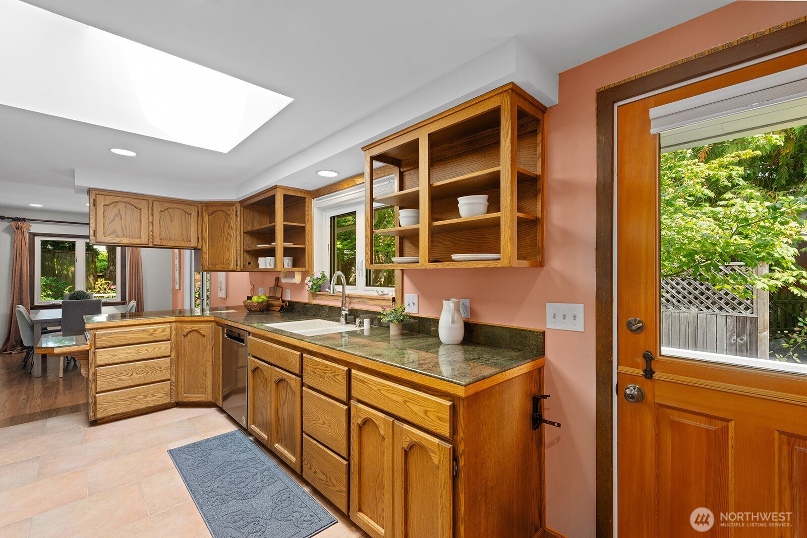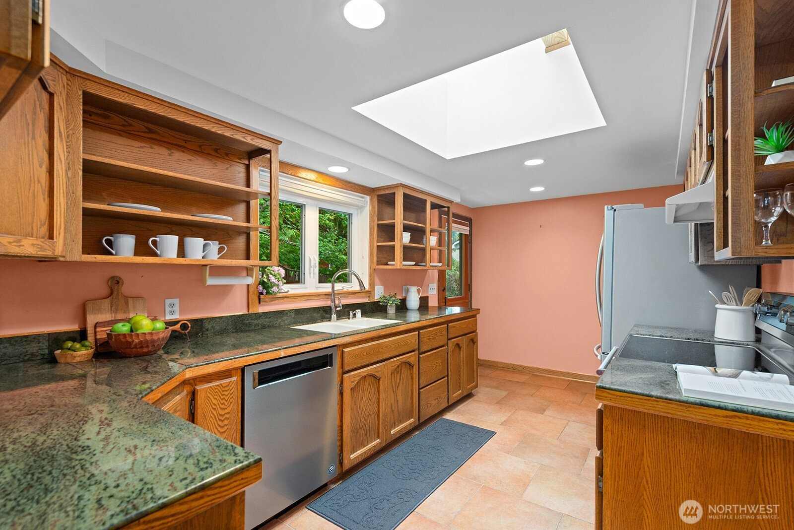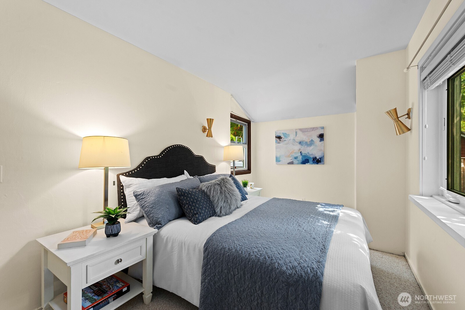 Tucked down a private lane, this 1930's Richmond Beach home offers a spacious LR w/hardwoods, oversized brick fireplace w/adjacent dining area that leads to the entertainment-sized deck. Sunny kitchen with oak cabinetry, granite counters, skylight and updated appliances. 3 bedrooms on the main floor along with 3/4 bath. Lower level could be a separate apartment with 800 sq. ft of functional space: living room, bedroom, cute kitchen and outside access (previously rented). Laundry machines on each floor of the home. Features: comp. roof, vinyl windows and detached artist's studio. There is a private, terraced yard with an abundance of mature plantings & landscape. Slate pavers lead you up to the home from the off-street parking.