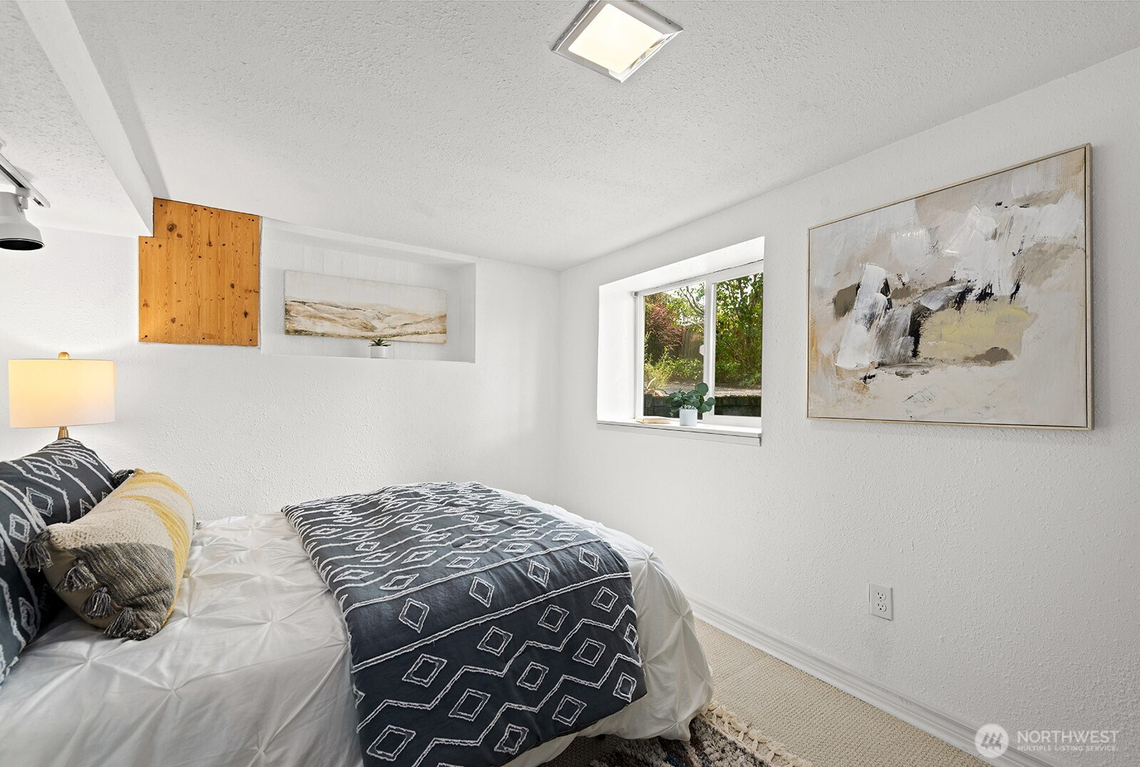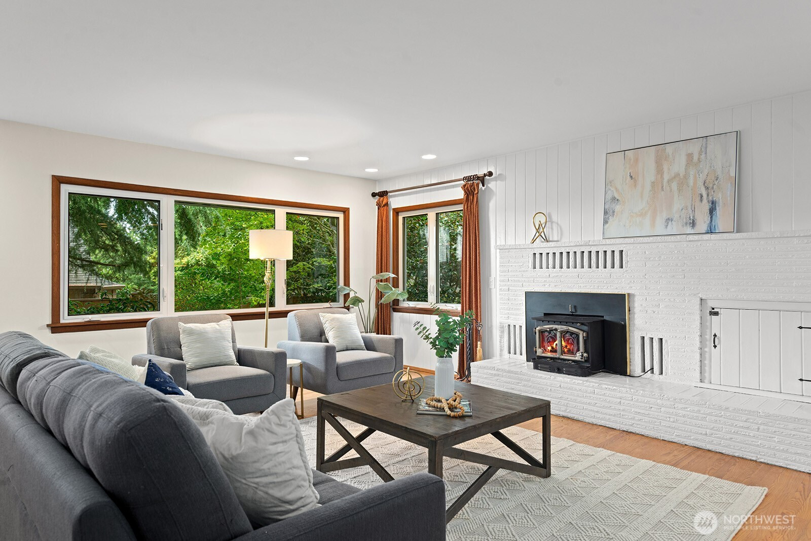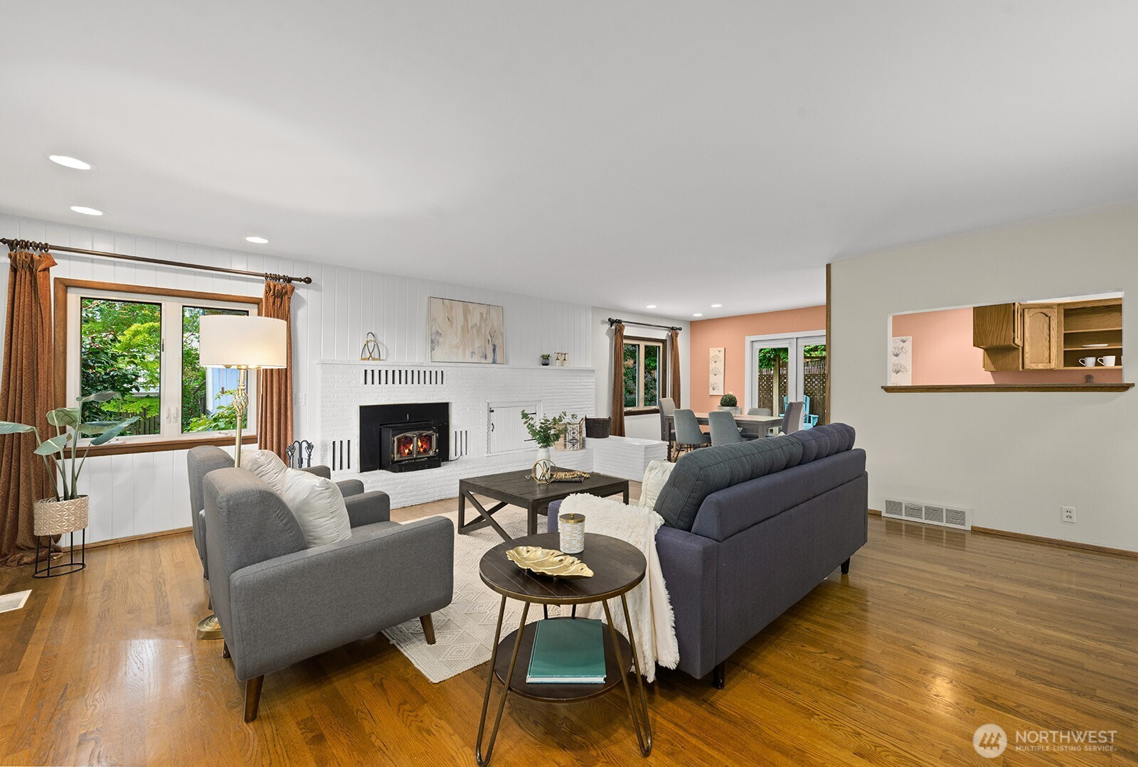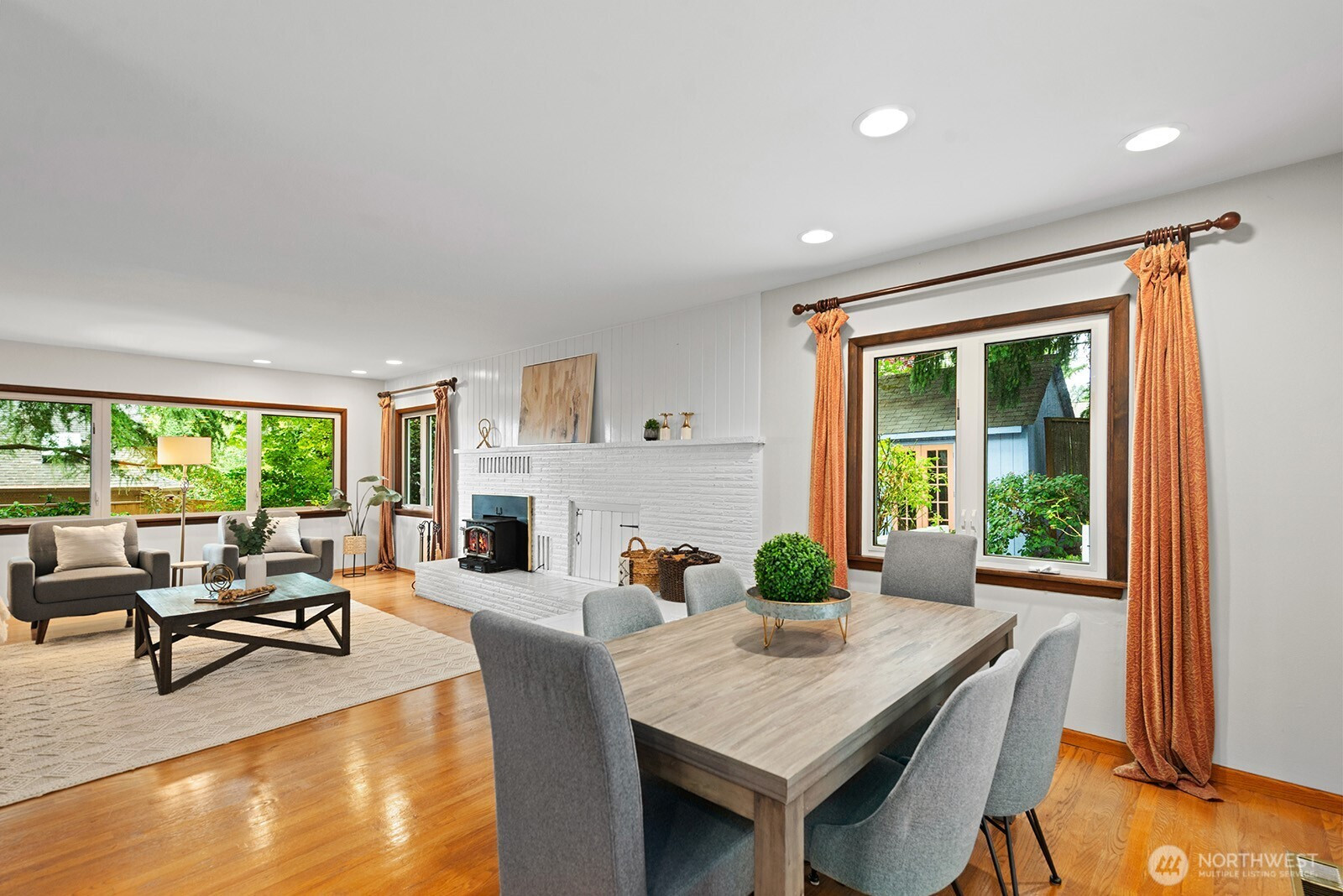 Tucked down a private lane, this 1930's Richmond Beach home offers a spacious LR w/hardwoods, oversized brick fireplace w/adjacent dining area that leads to the entertainment-sized deck. Sunny kitchen with oak cabinetry, granite counters, skylight and updated appliances. 3 bedrooms on the main floor along with 3/4 bath. Lower level could be a separate apartment with 800 sq. ft of functional space: living room, bedroom, cute kitchen and outside access (previously rented). Laundry machines on each floor of the home. Features: comp. roof, vinyl windows and detached artist's studio. There is a private, terraced yard with an abundance of mature plantings & landscape. Slate pavers lead you up to the home from the off-street parking.