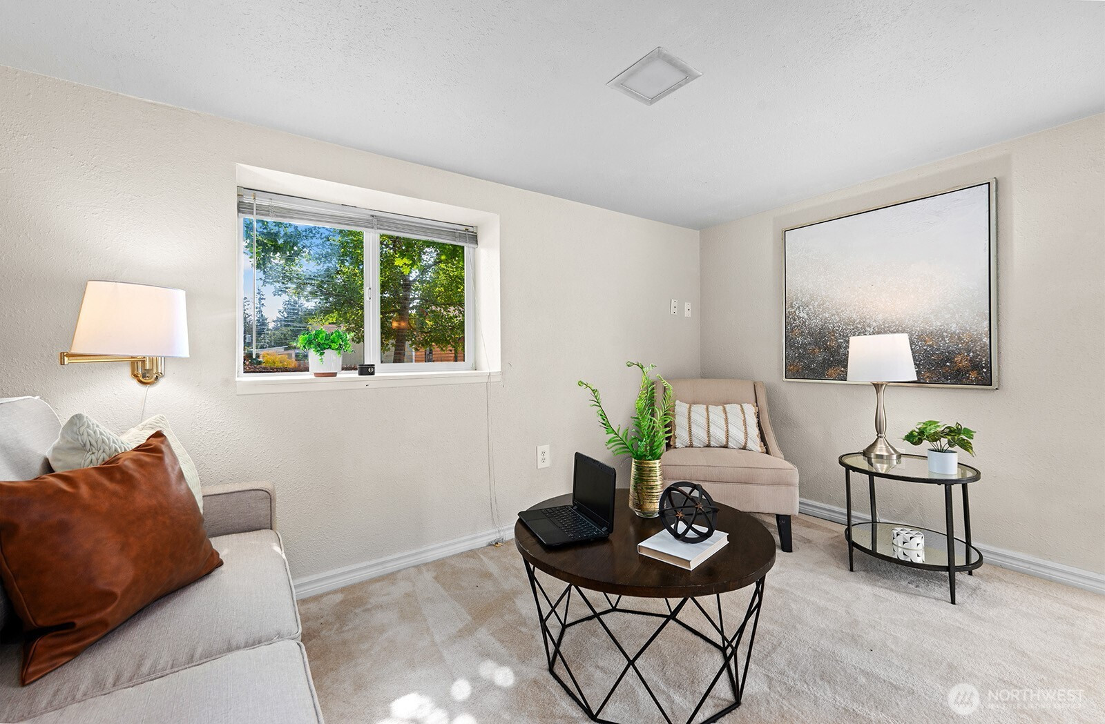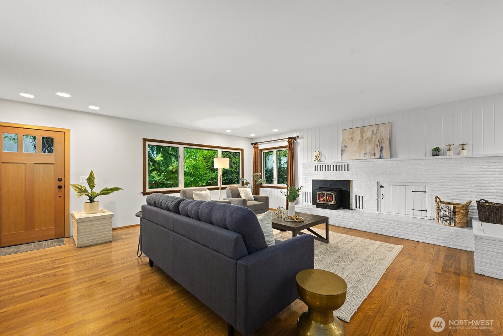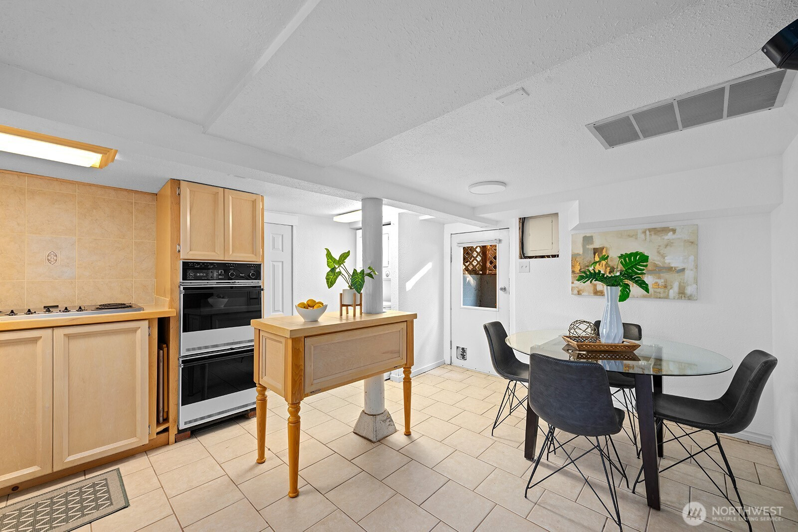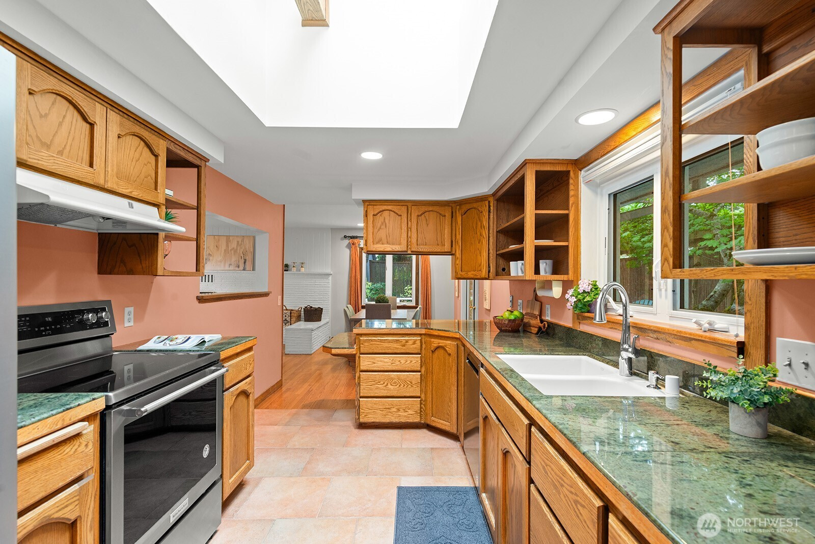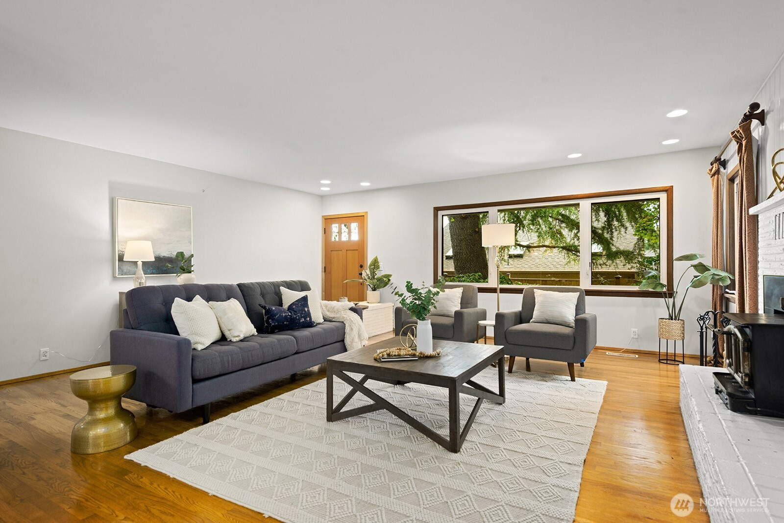 Tucked down a private lane, this 1930's Richmond Beach home offers a spacious LR w/hardwoods, oversized brick fireplace w/adjacent dining area that leads to the entertainment-sized deck. Sunny kitchen with oak cabinetry, granite counters, skylight and updated appliances. 3 bedrooms on the main floor along with 3/4 bath. Lower level could be a separate apartment with 800 sq. ft of functional space: living room, bedroom, cute kitchen and outside access (previously rented). Laundry machines on each floor of the home. Features: comp. roof, vinyl windows and detached artist's studio. There is a private, terraced yard with an abundance of mature plantings & landscape. Slate pavers lead you up to the home from the off-street parking.