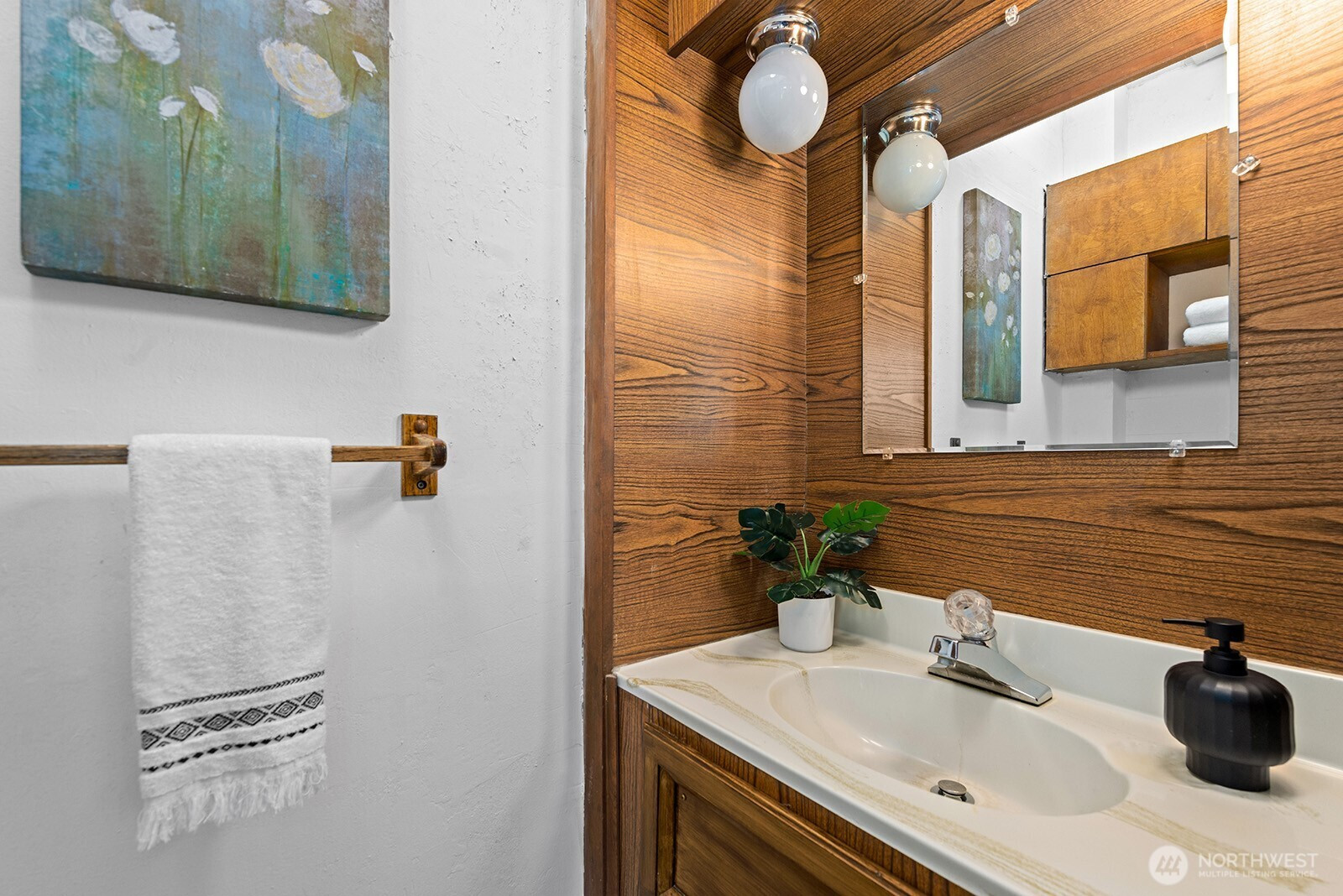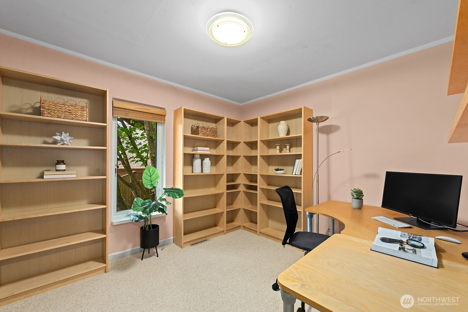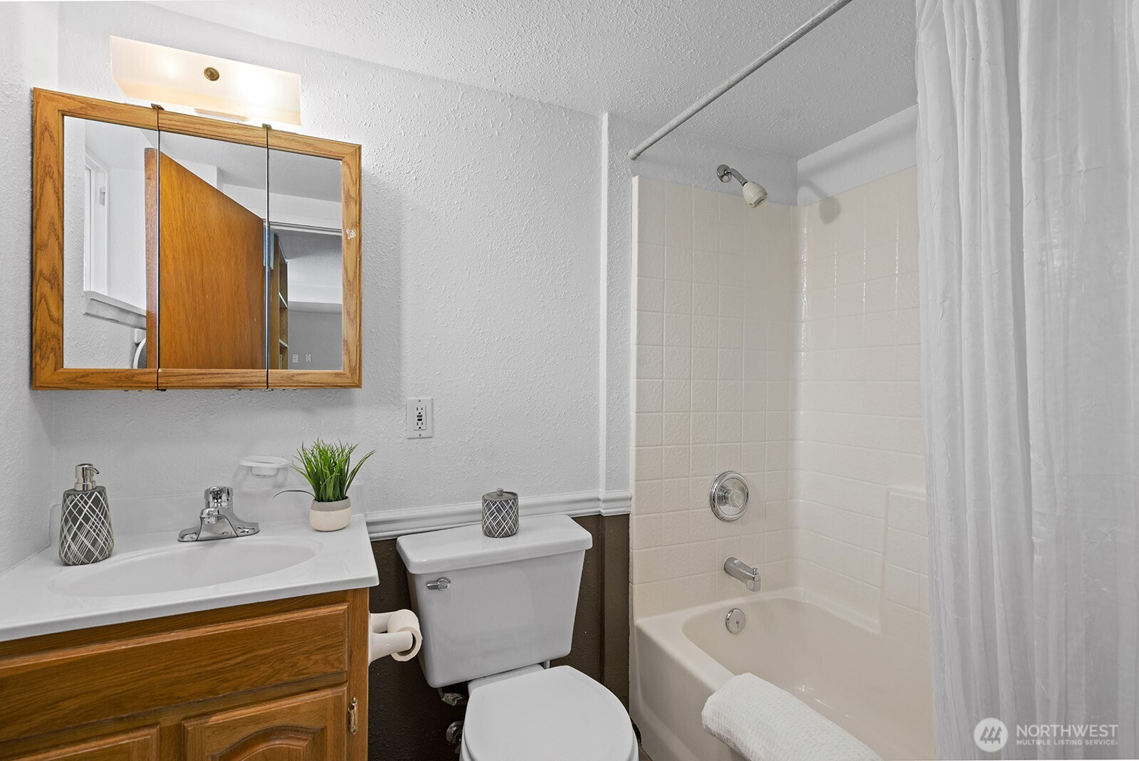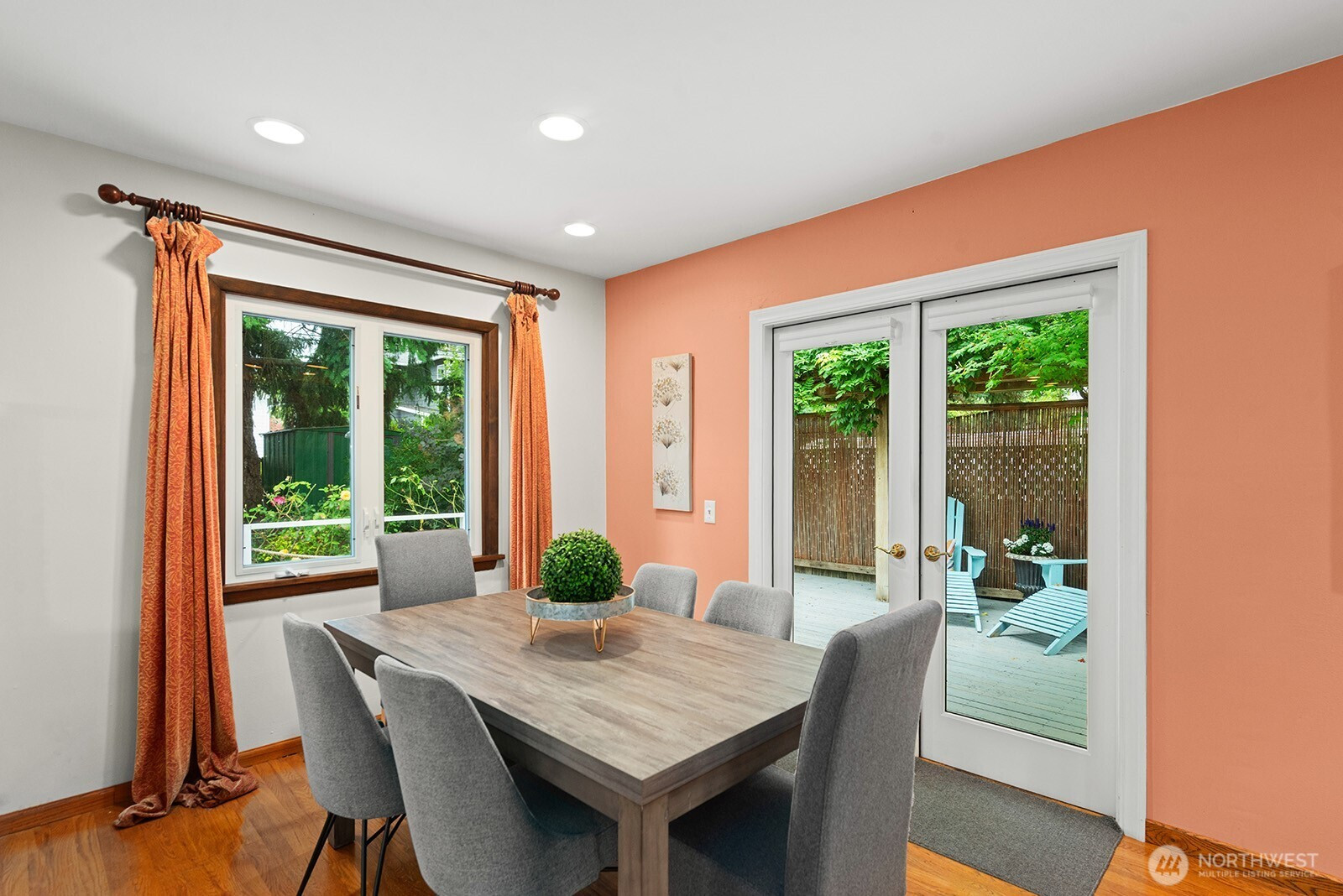 Tucked down a private lane, this 1930's Richmond Beach home offers a spacious LR w/hardwoods, oversized brick fireplace w/adjacent dining area that leads to the entertainment-sized deck. Sunny kitchen with oak cabinetry, granite counters, skylight and updated appliances. 3 bedrooms on the main floor along with 3/4 bath. Lower level could be a separate apartment with 800 sq. ft of functional space: living room, bedroom, cute kitchen and outside access (previously rented). Laundry machines on each floor of the home. Features: comp. roof, vinyl windows and detached artist's studio. There is a private, terraced yard with an abundance of mature plantings & landscape. Slate pavers lead you up to the home from the off-street parking.