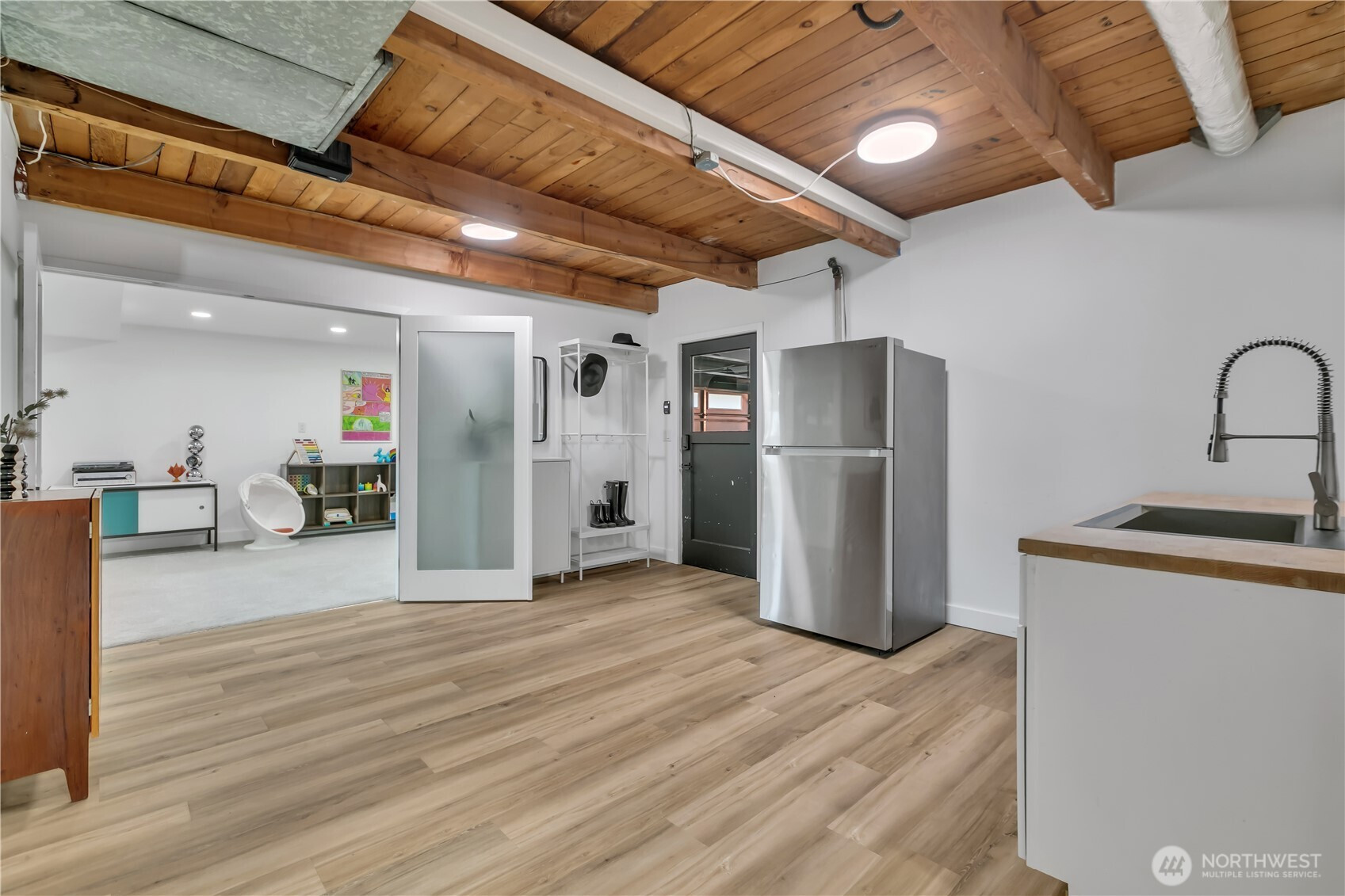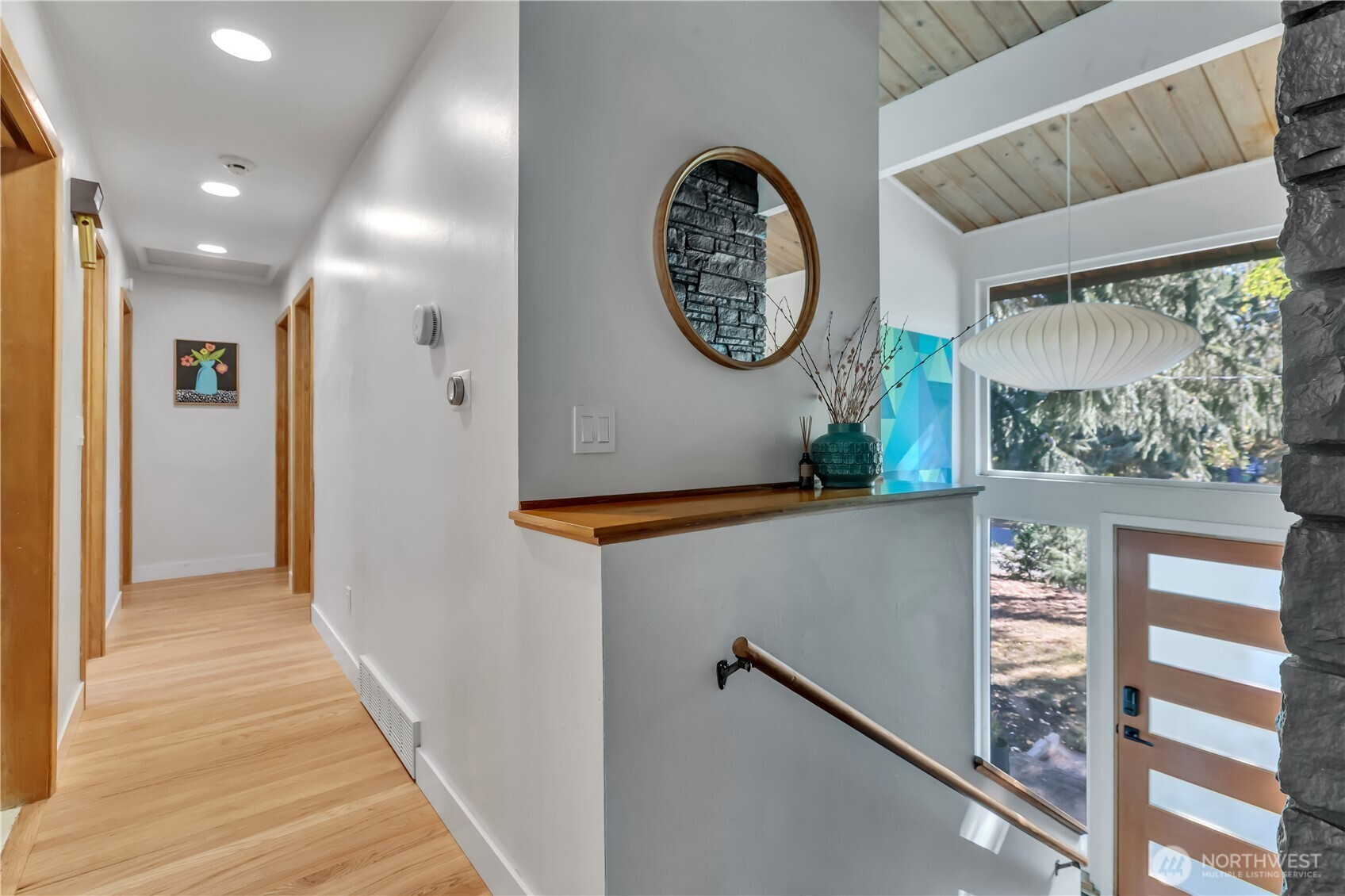 (503) 893-8874Effortlessly cool, this mid-century modern home showcases vaulted ceilings, exposed beams, and a bold stone-wrapped gas fireplace that anchors the living space. The stylish kitchen opens to a large, covered deck & private patio amid lush landscaping. Authentic George Nelson lighting and wide windows flood the home with light, highlighting beautiful hardwood floors. While the upstairs offers an exceptionally functional layout with 3 bedrooms and 1.5 baths, downstairs maintains the home’s cohesive aesthetic. Ideal for multi-gen living or a MIL/ADU, it features an oversized family room, bedroom, office, full bath, laundry, wet bar, & add’l storage. A cleverly designed carport with full-sized automatic garage door completes this mid-century gem