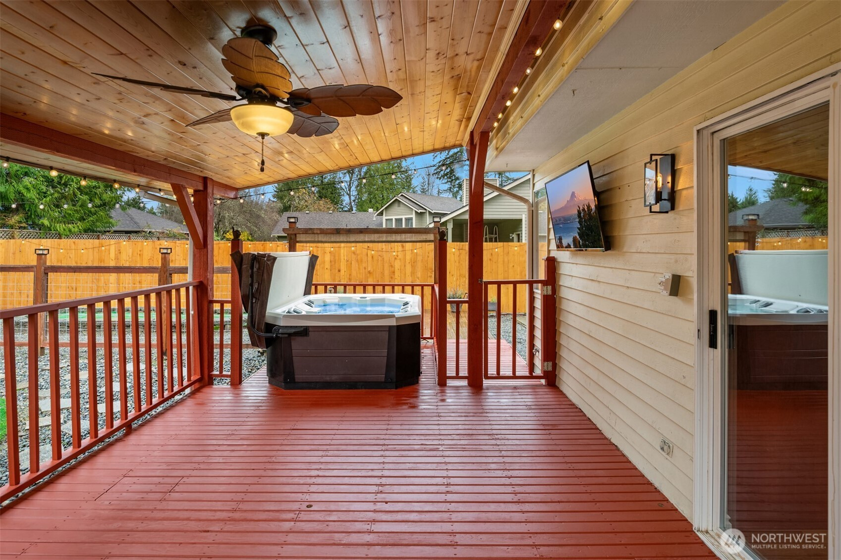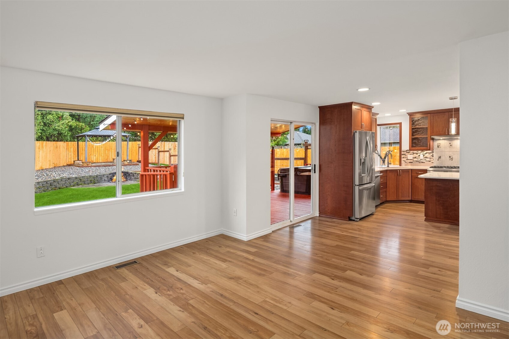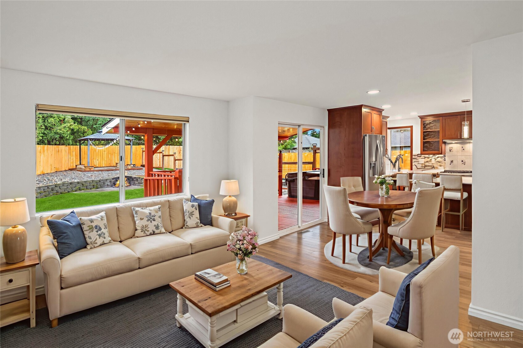 Located on a quiet Sammamish street within the award-winning Lake WA Schools, this well maintained home offers open layout for everyday living and entertaining. Updated kitchen features sleek cabinetry, ample counter space, and high-end Thermador wall oven and cooktop. Living areas flow easily to the outdoors, where a fully fenced backyard creates an entertainer’s dream: a covered patio for year-round gatherings, cozy fire pit, hot tub, outdoor TV, dog run, and extra storage sheds. Rare third car garage opens on both sides for added convenience, ideal for projects or extra parking. Enjoy A/C in the summer months and generator wiring through storm season. Located near parks, shopping, and dining. Stylish and move-in ready!