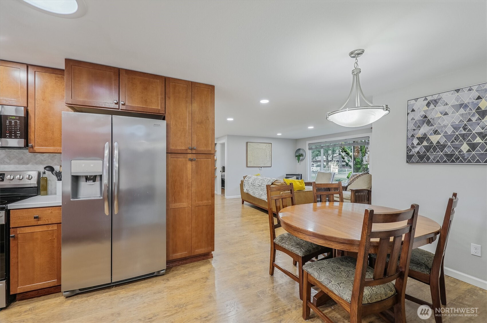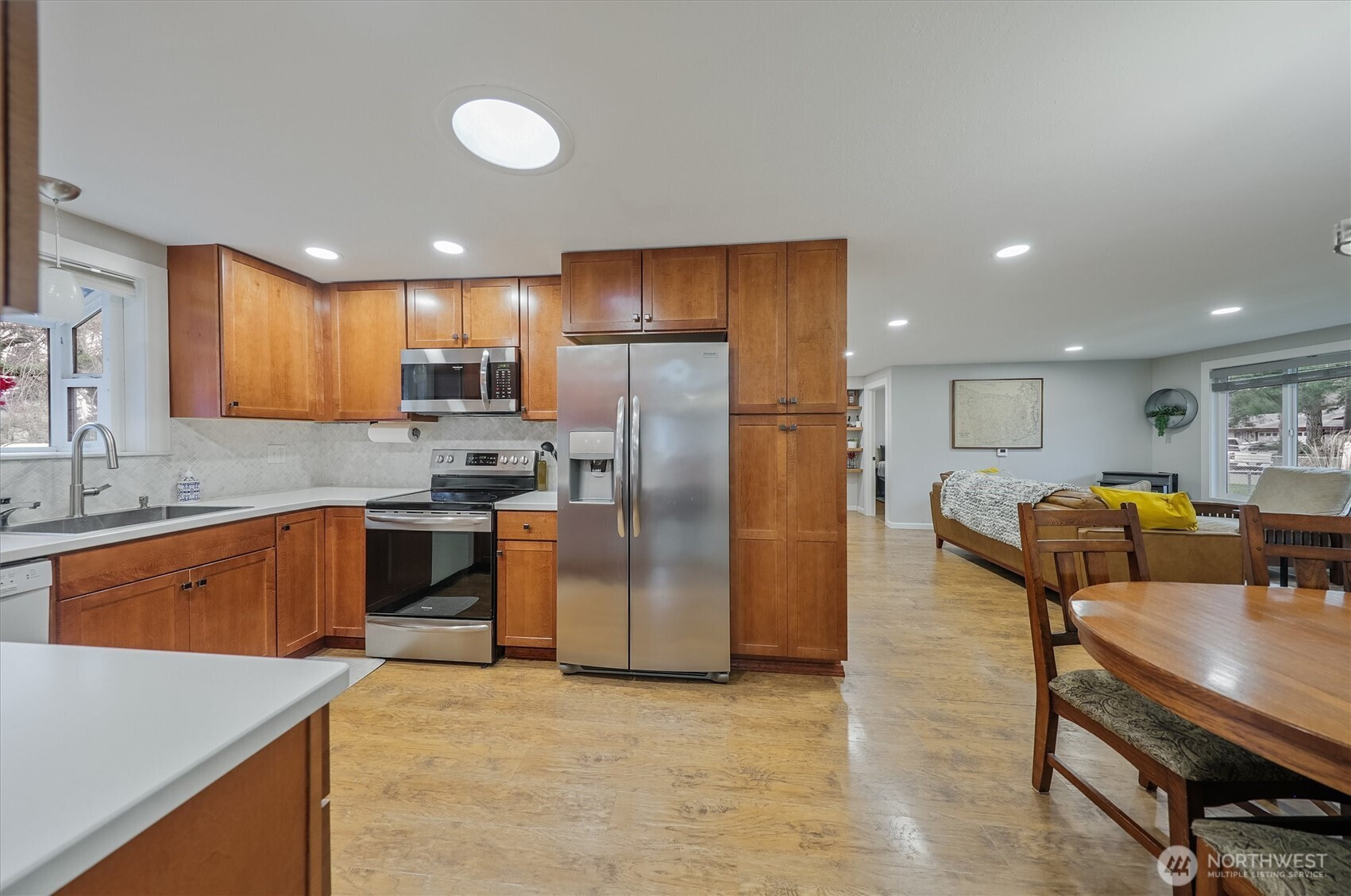Discover comfort, convenience, & charm in this beautifully maintained 4-bedroom rambler located in the desirable Eastridge Park neighborhood. Thoughtfully updated & move-in ready, this inviting home features a bright & open floor plan designed for easy everyday living & effortless entertaining. Durable vinyl plank flooring flows through the main living areas, complemented by plush carpeting that adds warmth & comfort to the bedrooms & family room. The primary suite is setup perfectly to be a retreat in your own home w/full bath, walk in closet and slider to the deck. The spacious kitchen offers attractive cabinetry w/convenient pull-out drawers, providing both style & functionality for cooking & storage. Newer roof and siding adds peace of mind & long-term value. Step outside & enjoy the welcoming front yard w/full fence. Continue to the backyard & enjoy your entertainers deck. There’s even RV parking, offering flexibility for recreational vehicles, trailers, or additional storage. Ideally situated, this home provides easy access to Lake Meridian Park, the scenic Soos Creek Trail, & a variety of nearby shopping, dining, & everyday conveniences. Commuters will also appreciate the quick connections to major highways for an easy trip throughout the region. Best of all, this property comes w/ NO HOA, giving you the freedom to truly make the space your own! This is a wonderful opportunity to enjoy comfortable single-level living in a fantastic location.