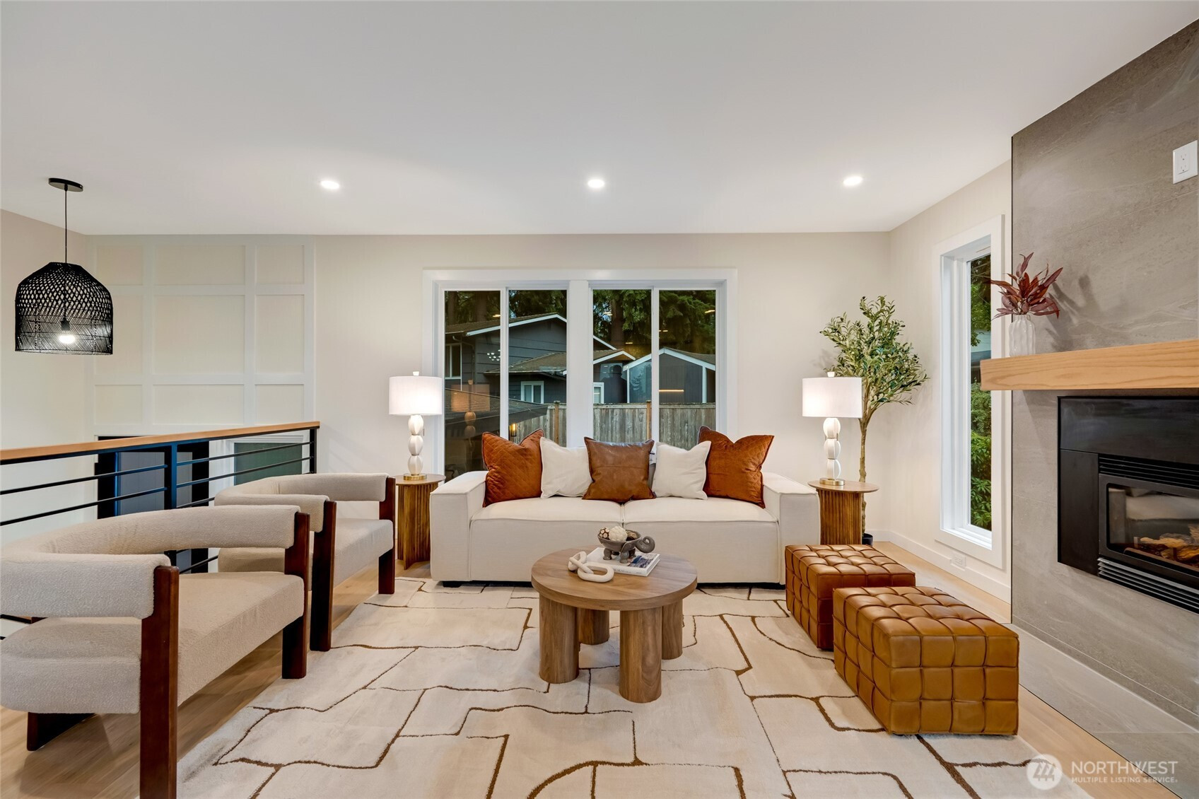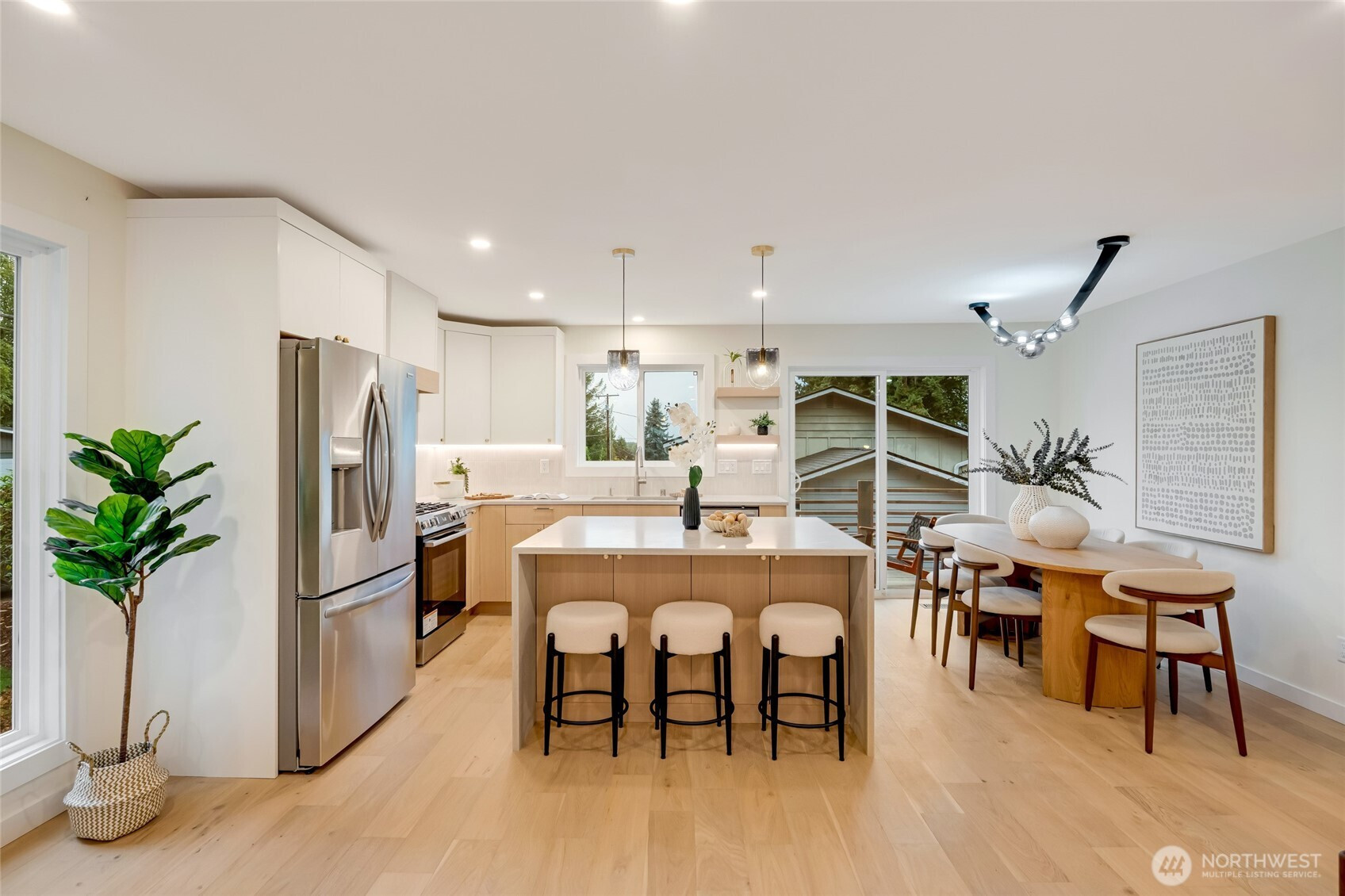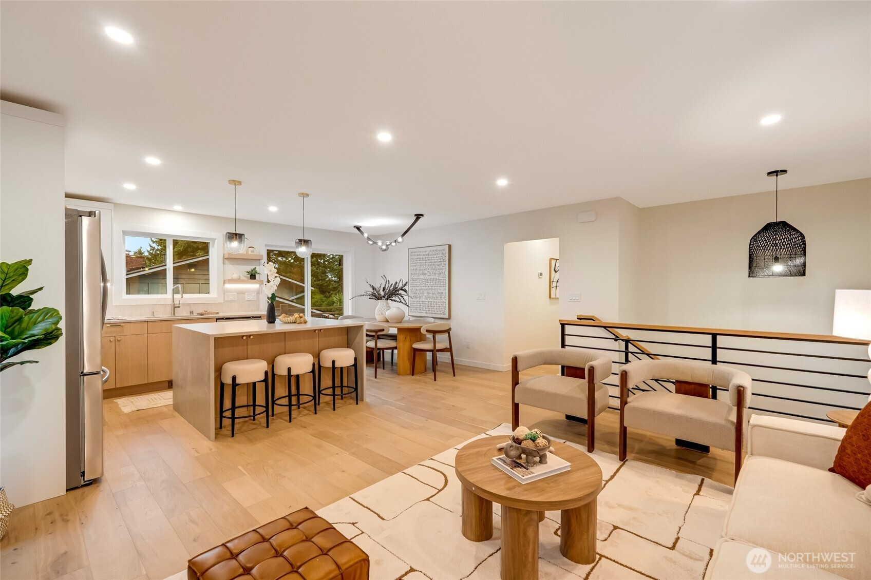 Move-in ready in Bellevue and located within the highly rated Bellevue School District! This beautifully updated home features an open-concept main level with engineered hardwood floors, a stunning new kitchen with custom cabinets, quartzite countertops with waterfall on island, under-cabinet lighting. Enjoy gas fireplaces on both levels. The main floor offers a spacious primary suite with ¾ bath and walk-in closet, a second bedroom, and full bath. Downstairs includes a large family room with dry bar (wired for a stove), two additional bedrooms, a full bath, and a spacious utility room. Walk out to a peaceful backyard retreat with a pergola and patio. Two-car garage. Ideal location with a quick commute to downtown. Tankless WH and AC!