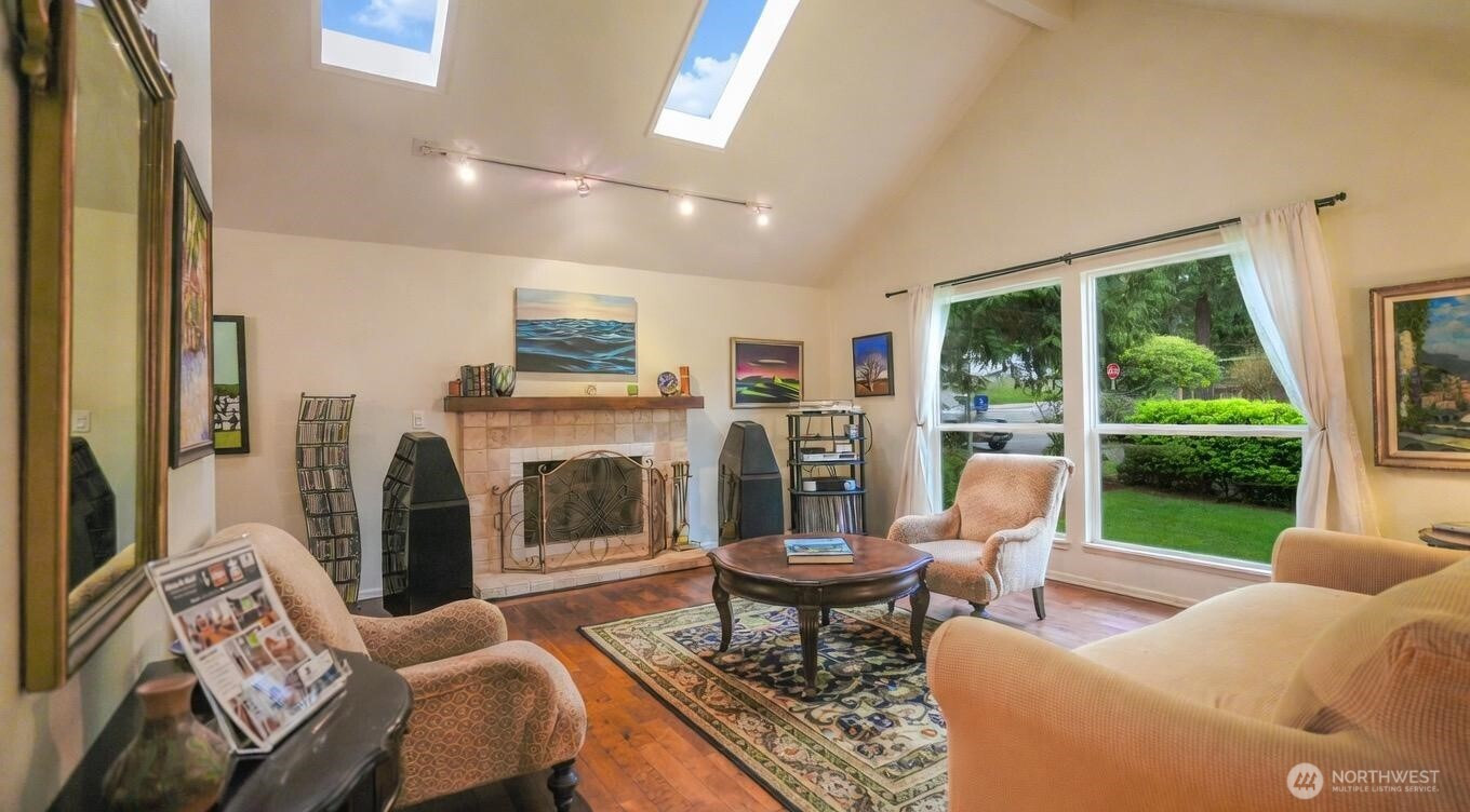 Move right in to this stylish NW Contemporary split w/Dutch gable roof, near shopping & restaurants! 2 suites, one on each floor! Sophisticated upgrades, new oversized Trex entertainment deck. Tile entry, cathedral ceiling in open living room, skylights, & formal dining room, heat pump-A/C. Lodge like engineered hardwood floors. Interior painted 2025, newer front door, upgraded lighting, closet organizers. Beautiful eat-in kitchen has all the bells and whistles, dark cherry tone soft close cabinets, slab granite counters, glass tile splash, gas range, stainless appliances. Dining room & deck overlook park-like fenced yard! Primary suite w/dual closets. A masonry fireplace on each floor. 3 showers! Big garage for workshop. Newer furnace & water heater. Large, corner lot.