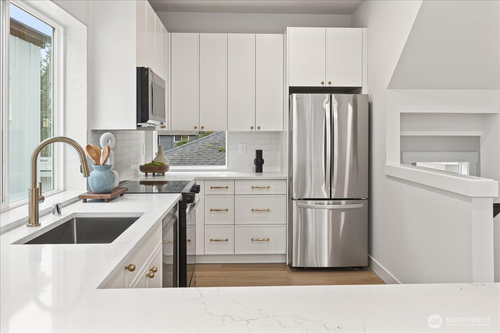 Discover refined modern living in this stunning new construction two bedroom home in North Seattle. Thoughtfully designed with clean lines and abundant natural light, the open-concept main level flows seamlessly from a stylish living area to a chef’s kitchen featuring sleek quartz countertops, stainless steel appliances, and a generous island perfect for entertaining. Custom touches, including a show-stopping accent wall in the living area, and warm wood tones add depth and character throughout. Retreat to the luxurious primary suite, where soaring vaulted ceilings create an airy ambiance, complemented by a spa-inspired en suite bath designed for relaxation. A lower level bedroom and bonus room provide plenty of options for the buyer's needs. Enjoy year-round climate control with energy-efficient heating and cooling. Dedicated parking included.