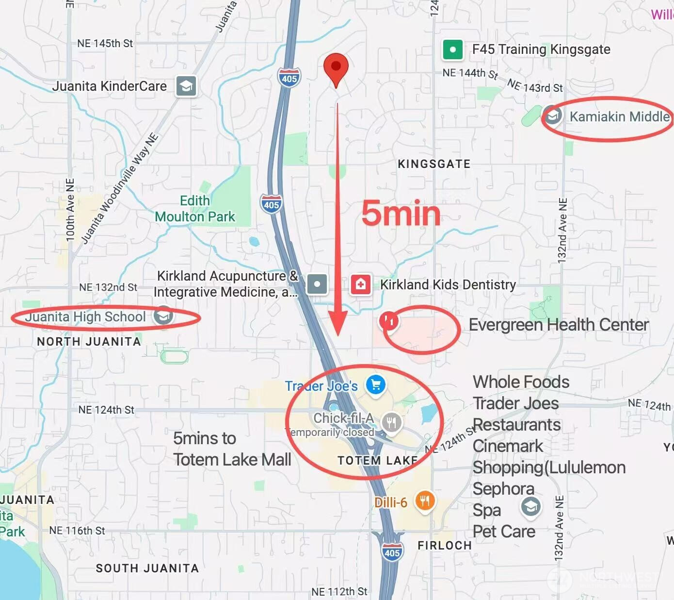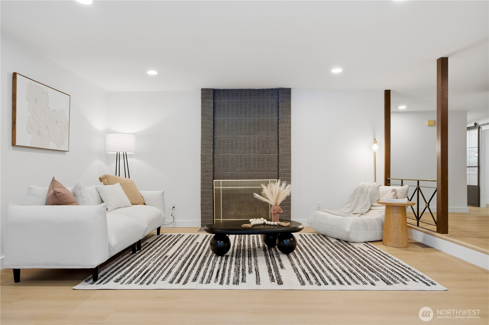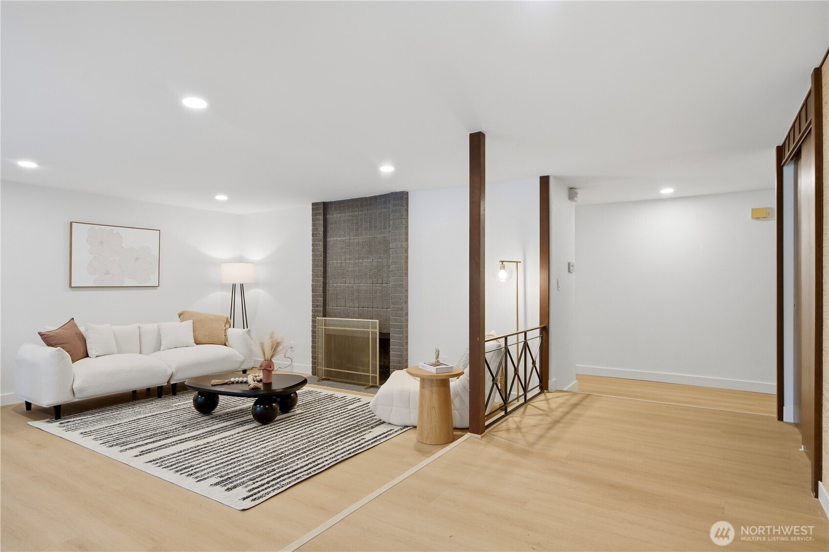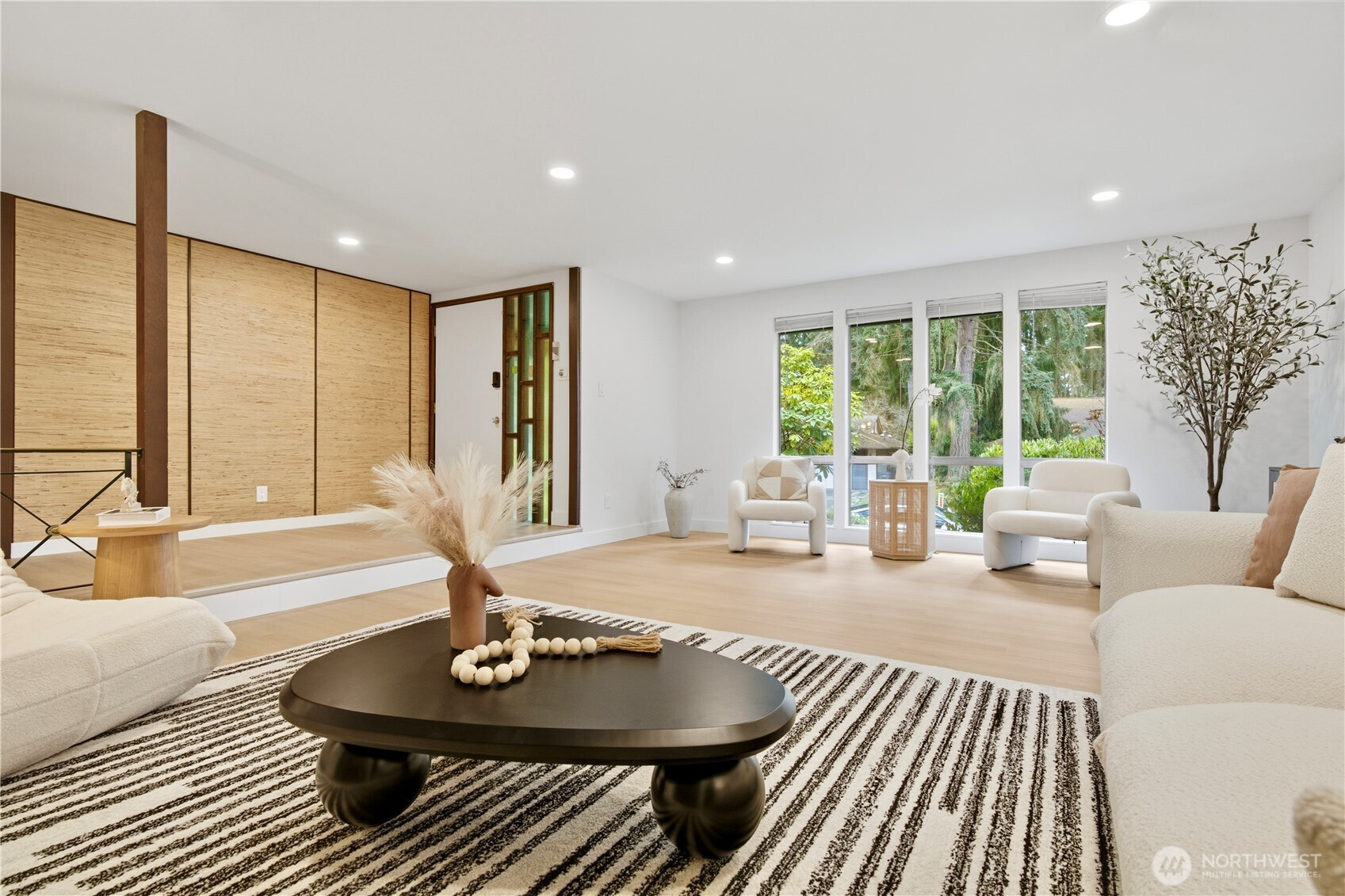 Rare find 2310 sqft luxury updated rambler situated on a premier 10000+ sqft lot in an unbeatable Kirkland location. Just 5 minutes to Totem Lake Village and 15 minutes to Downtown Bellevue, this home has been meticulously reimagined with a curated design. This turnkey residence features a permitted 200-amp electrical panel upgrade with EV charger, new windows and sliding doors, new water heater, and new attic insulation. Step inside to discover seamless wide-plank flooring and a sunny living room with fireplace. The open space kitchen boasts custom cabinetry with solid brass hardware, a stunning quartz waterfall island with a matching full-height slab backsplash, a professional 36" 6-burner Thor range, and Bosch dishwasher. Dining area, accented by a signature West Elm chandelier, flows to a massive deck and a private, fully-fenced backyard. The thoughtful layout offers three oversized bedrooms and a dedicated home office, with each bedroom featuring its own generous walk-in closet. The primary suite is a true retreat with standalone tub, double vanity, custom solid-wood walk-in closet. Designer Bedrosians tile in all bathrooms. Complete with extra RV/boat parking space, this home is nestled in a quiet community with a private pool, playground, and tennis courts. Don’t miss this one-of-a-kind Kirkland masterpiece!
