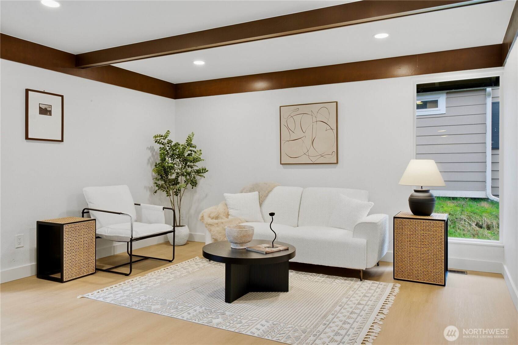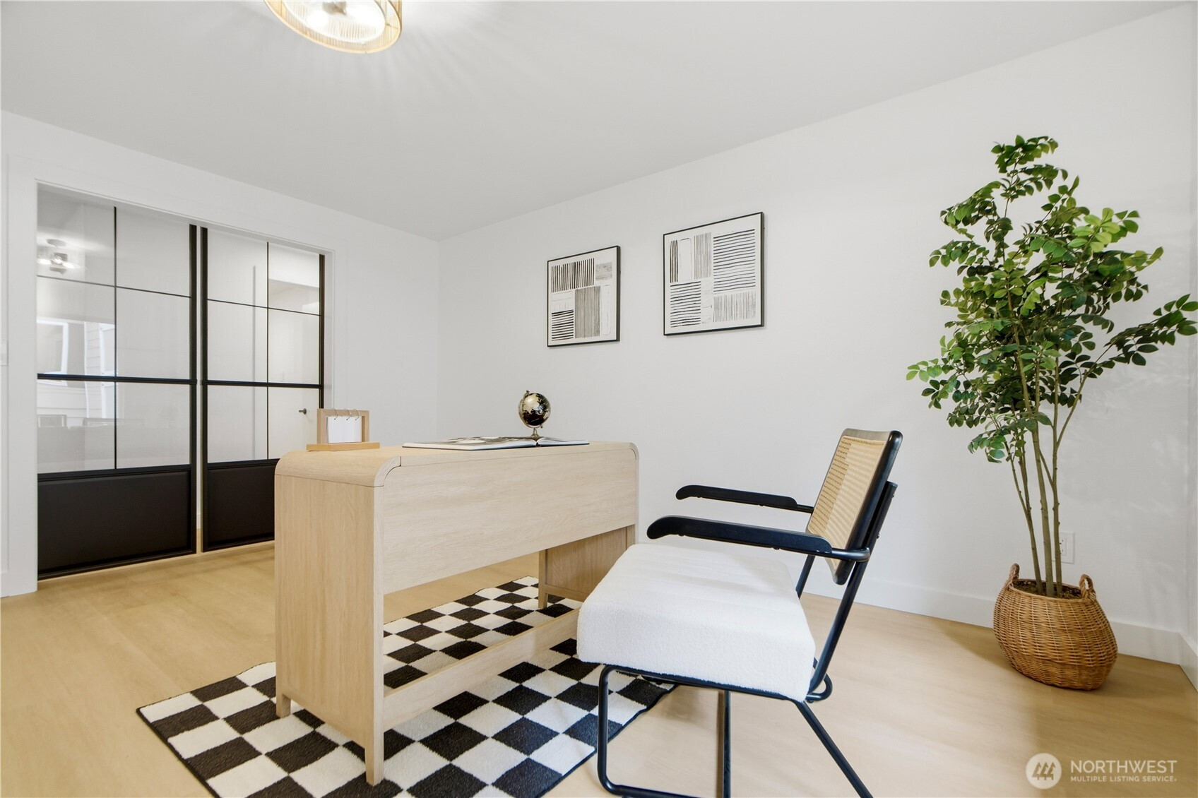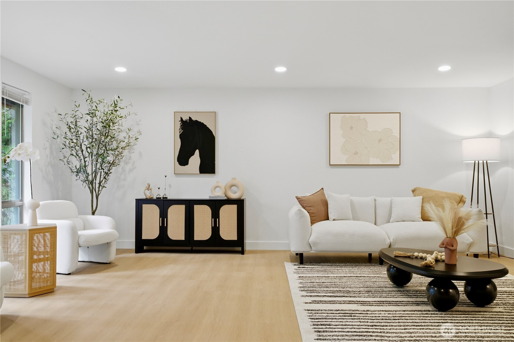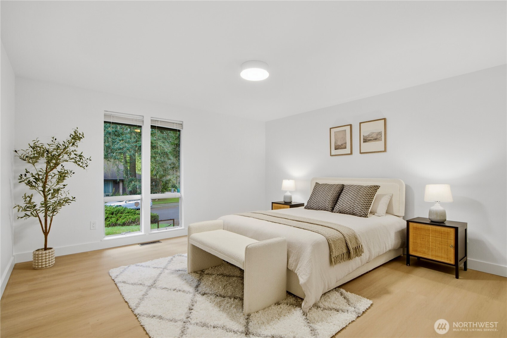 Rare find 2310 sqft luxury updated rambler situated on a premier 10000+ sqft lot in an unbeatable Kirkland location. Just 5 minutes to Totem Lake Village and 15 minutes to Downtown Bellevue, this home has been meticulously reimagined with a curated design. This turnkey residence features a permitted 200-amp electrical panel upgrade with EV charger, new windows and sliding doors, new water heater, and new attic insulation. Step inside to discover seamless wide-plank flooring and a sunny living room with fireplace. The open space kitchen boasts custom cabinetry with solid brass hardware, a stunning quartz waterfall island with a matching full-height slab backsplash, a professional 36" 6-burner Thor range, and Bosch dishwasher. Dining area, accented by a signature West Elm chandelier, flows to a massive deck and a private, fully-fenced backyard. The thoughtful layout offers three oversized bedrooms and a dedicated home office, with each bedroom featuring its own generous walk-in closet. The primary suite is a true retreat with standalone tub, double vanity, custom solid-wood walk-in closet. Designer Bedrosians tile in all bathrooms. Complete with extra RV/boat parking space, this home is nestled in a quiet community with a private pool, playground, and tennis courts. Don’t miss this one-of-a-kind Kirkland masterpiece!