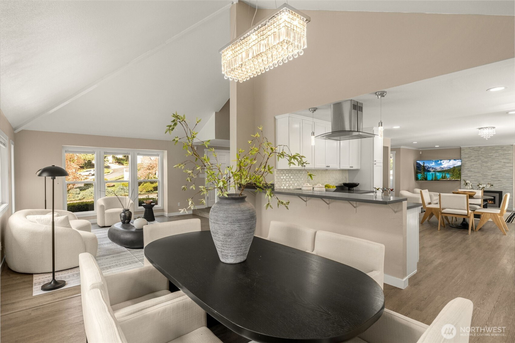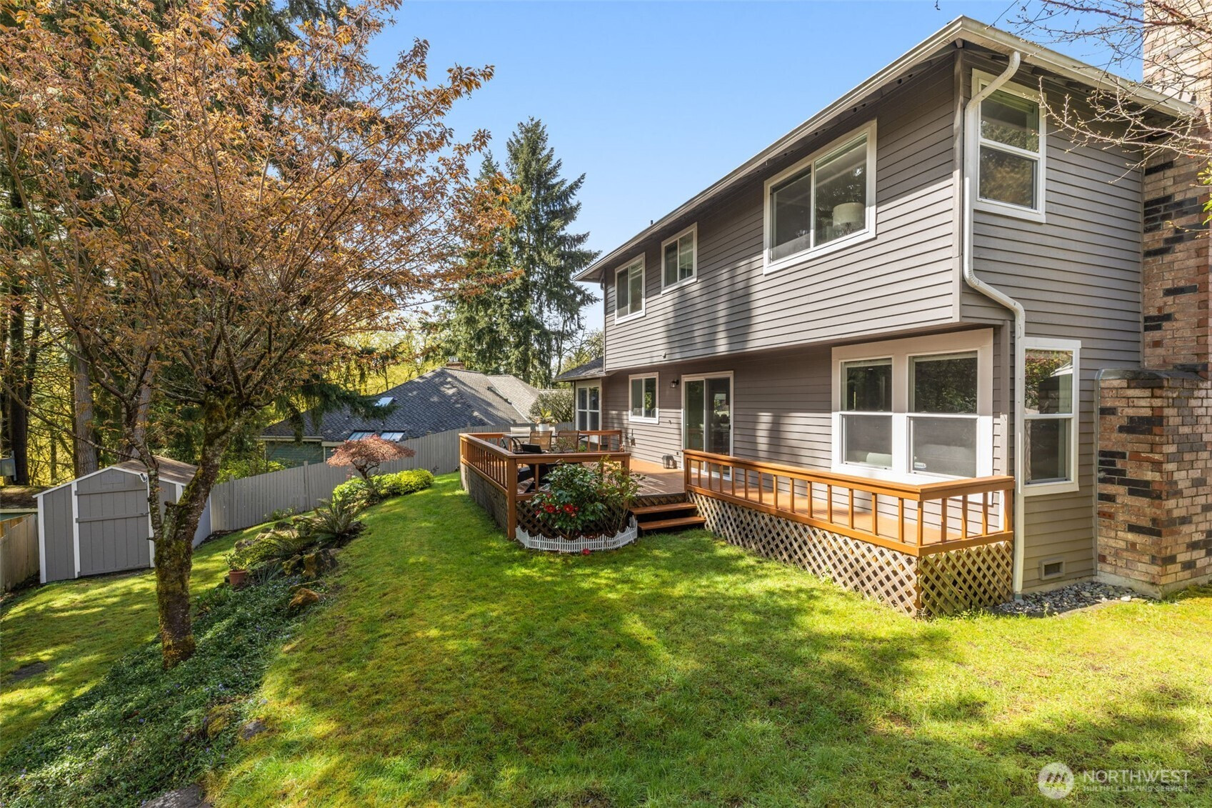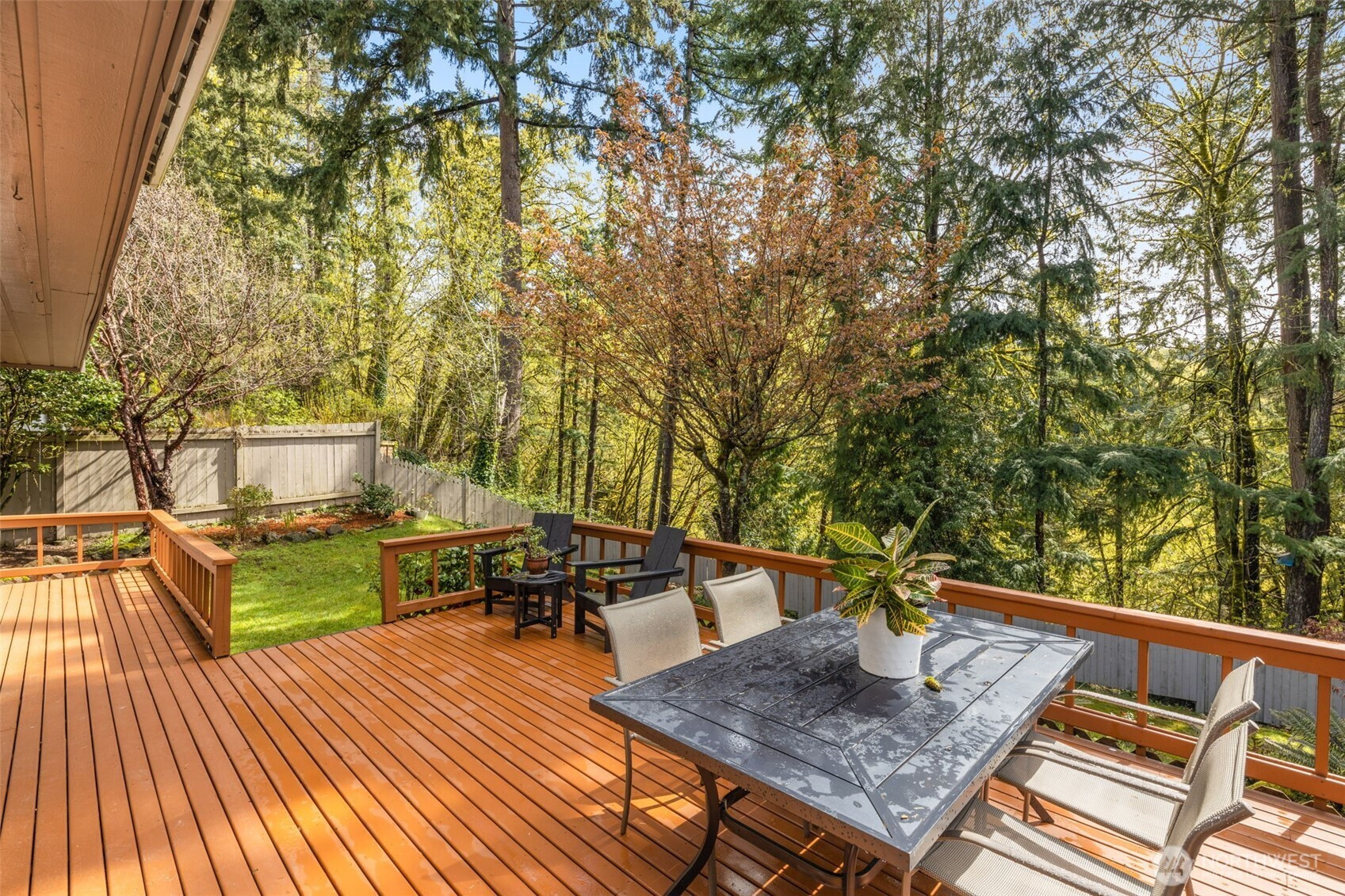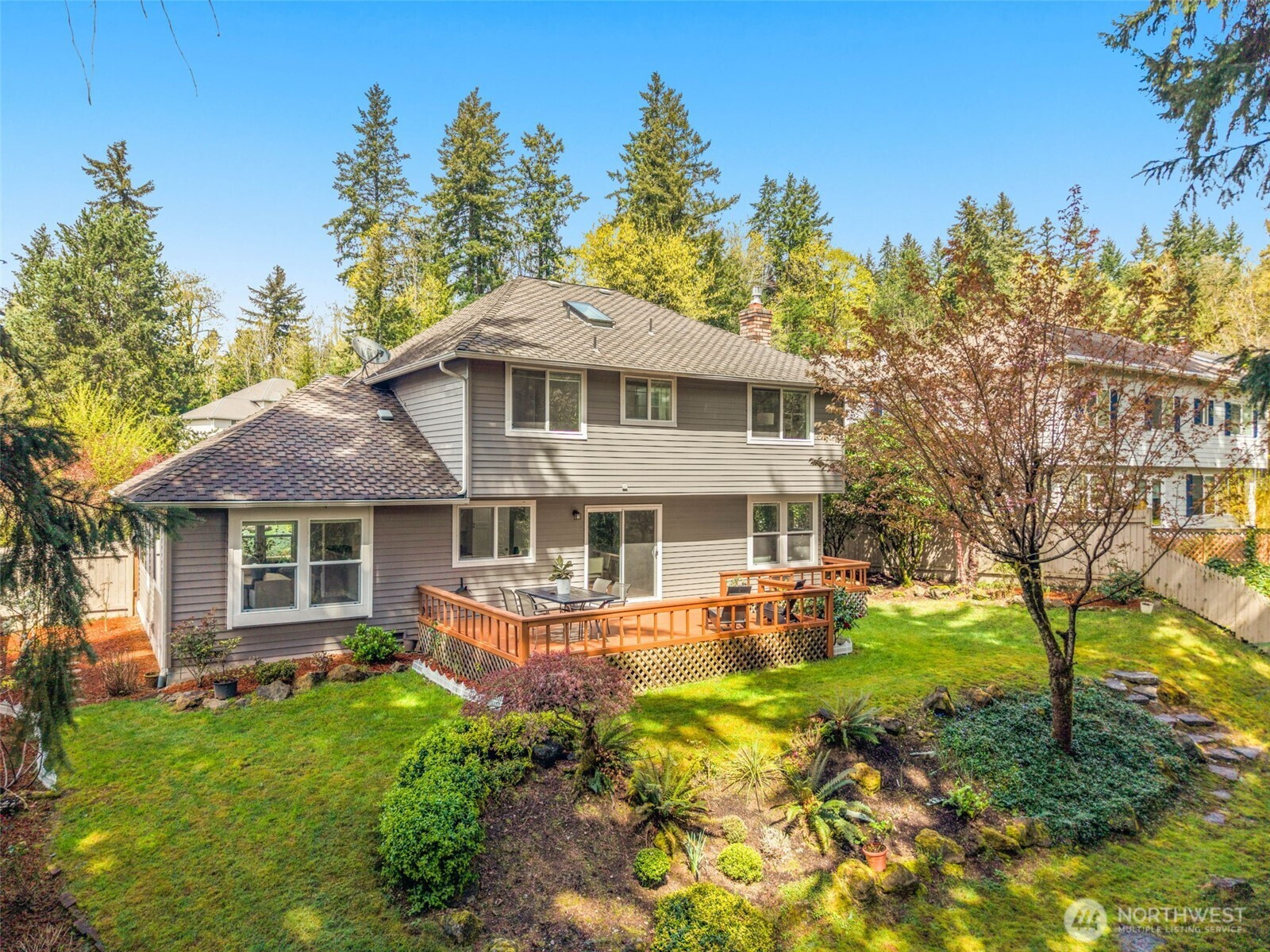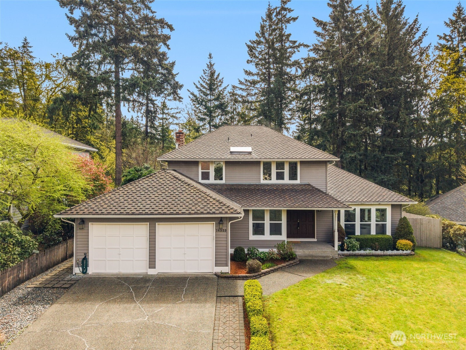Beautifully renovated two-story residence situated on a private lot with southern exposure, backing to a tranquil greenbelt in the sought-after Bellevue School District. A timeless and elegant floorplan welcomes you with an inviting living room that seamlessly flows into the formal dining room, both enhanced by expansive windows and soaring vaulted ceilings that bathe the home in natural light. The thoughtfully refreshed kitchen showcases sleek quartz countertops, abundant cabinetry, and a functional seating bar, effortlessly connecting to the family room with a tiled gas fireplace. A versatile main-level den or office is complemented by a tastefully remodeled ¾ bath, offering flexibility and convenience. Upstairs, the spacious primary suite serves as a private retreat, complete with a remodeled spa-inspired bath and a generous walk-in closet. Three additional bedrooms and a well-appointed hallway bath with skylight complete the upper level. Step outside to an expansive deck overlooking an exceptionally private and fully fenced backyard, perfect for outdoor entertaining, relaxation, and enjoying the peaceful natural surroundings. Ideally located just moments from parks, scenic trails, and top-rated schools, with easy access to shopping, dining, Factoria Mall, and major highways.