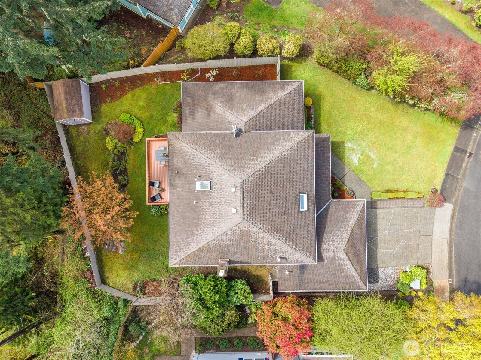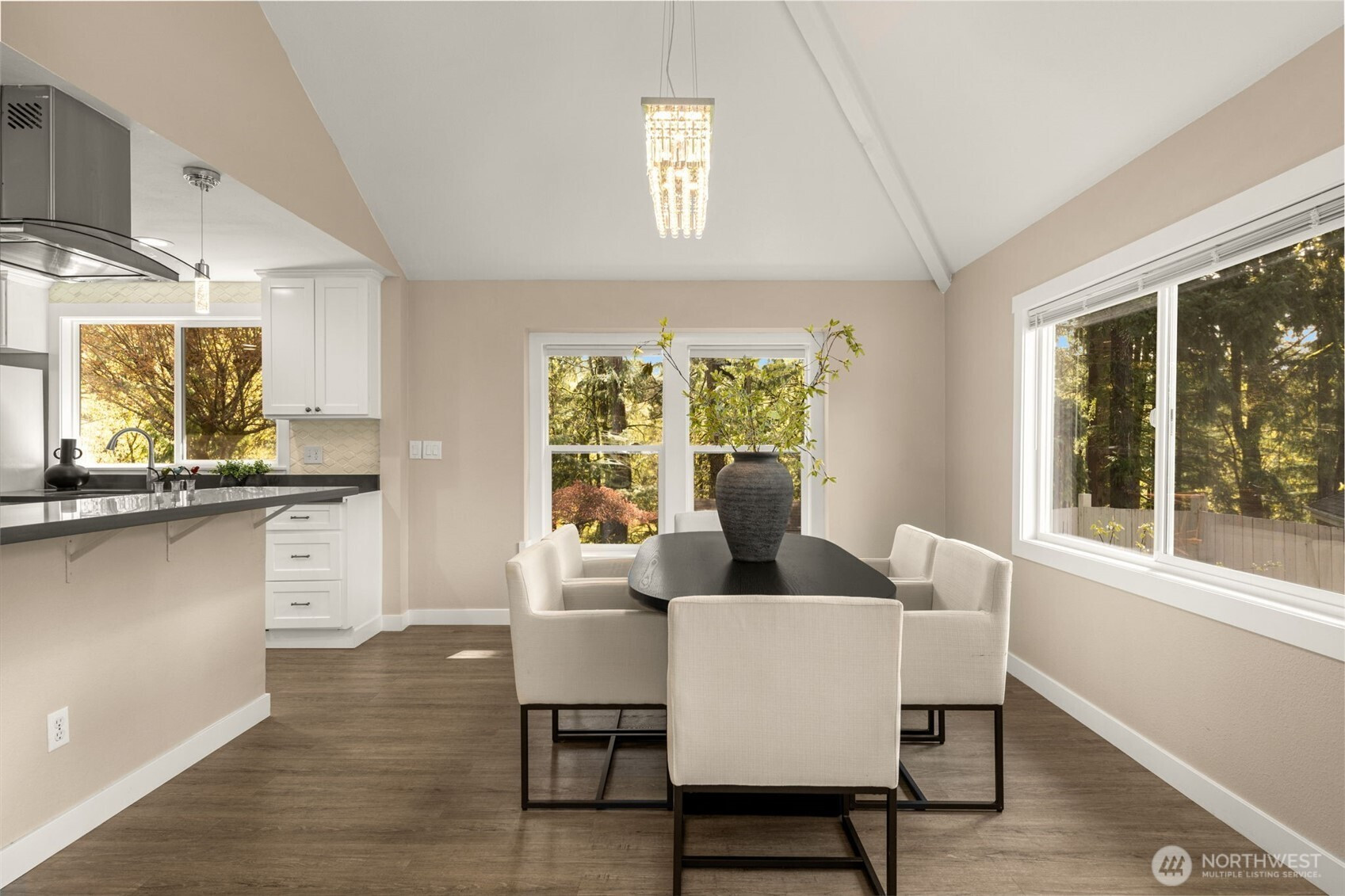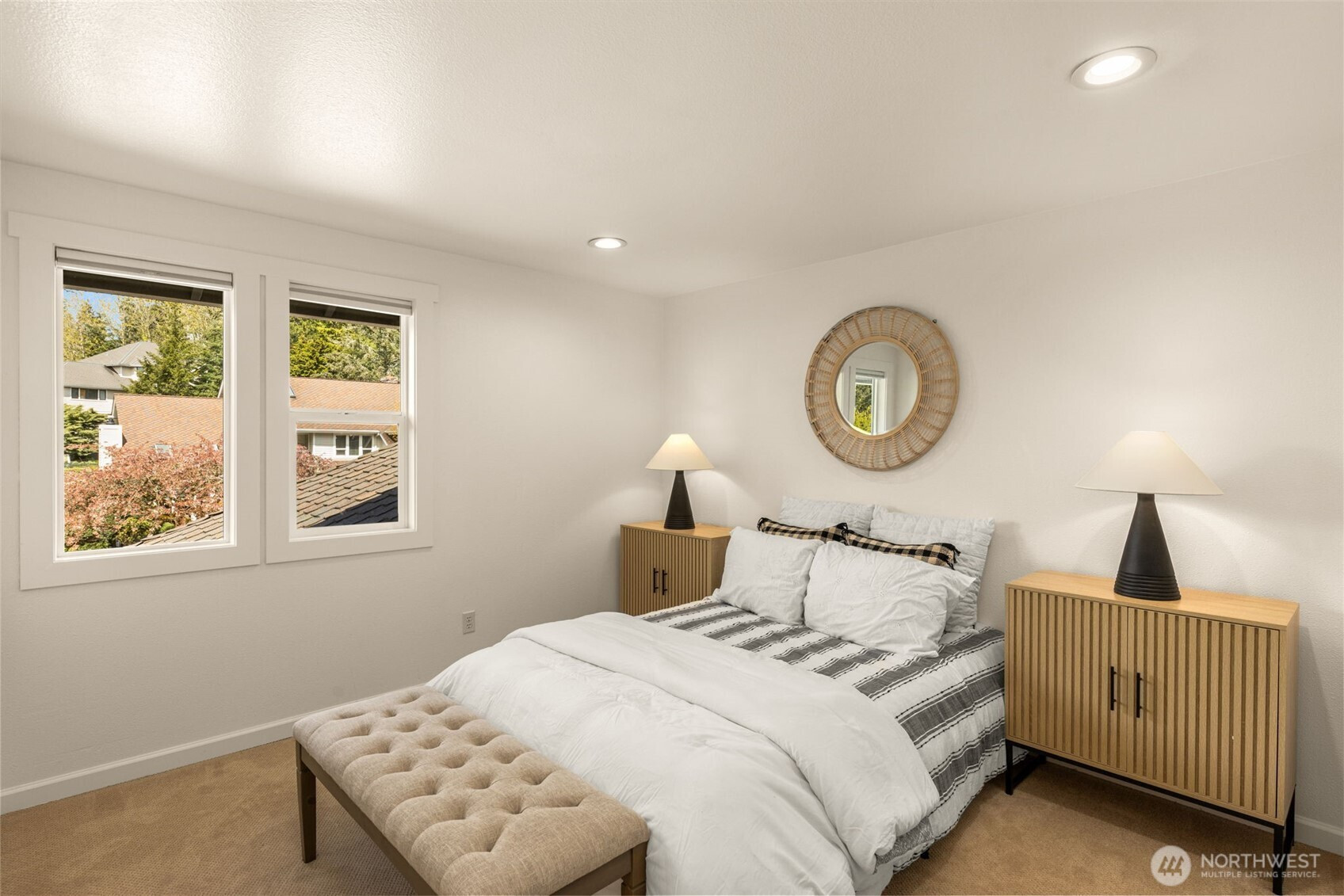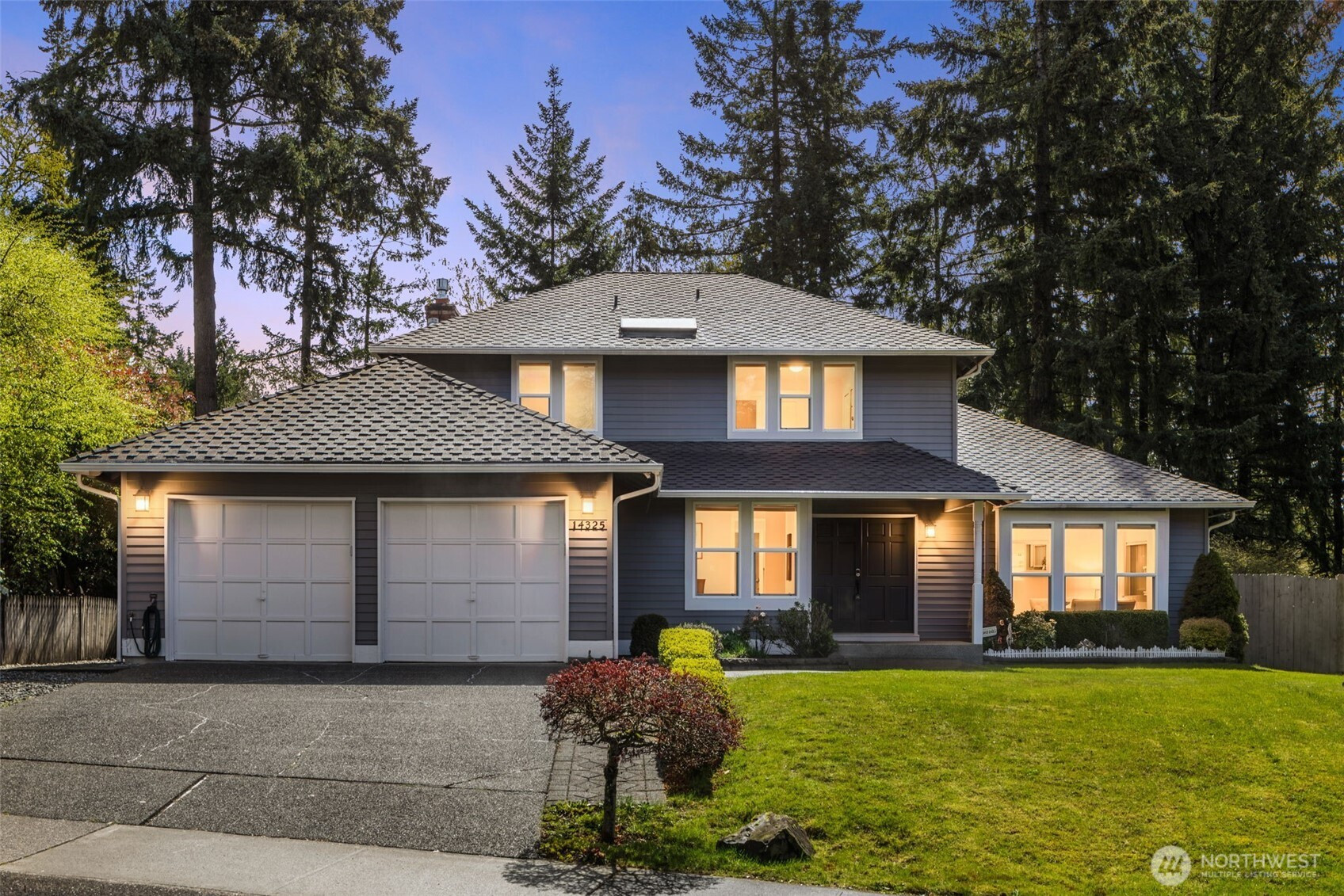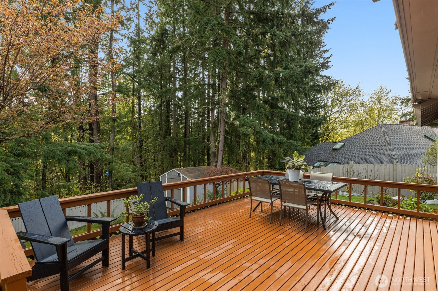 Beautifully renovated two-story residence situated on a private lot with southern exposure, backing to a tranquil greenbelt in the sought-after Bellevue School District. A timeless and elegant floorplan welcomes you with an inviting living room that seamlessly flows into the formal dining room, both enhanced by expansive windows and soaring vaulted ceilings that bathe the home in natural light. The thoughtfully refreshed kitchen showcases sleek quartz countertops, abundant cabinetry, and a functional seating bar, effortlessly connecting to the family room with a tiled gas fireplace. A versatile main-level den or office is complemented by a tastefully remodeled ¾ bath, offering flexibility and convenience. Upstairs, the spacious primary suite serves as a private retreat, complete with a remodeled spa-inspired bath and a generous walk-in closet. Three additional bedrooms and a well-appointed hallway bath with skylight complete the upper level. Step outside to an expansive deck overlooking an exceptionally private and fully fenced backyard, perfect for outdoor entertaining, relaxation, and enjoying the peaceful natural surroundings. Ideally located just moments from parks, scenic trails, and top-rated schools, with easy access to shopping, dining, Factoria Mall, and major highways.