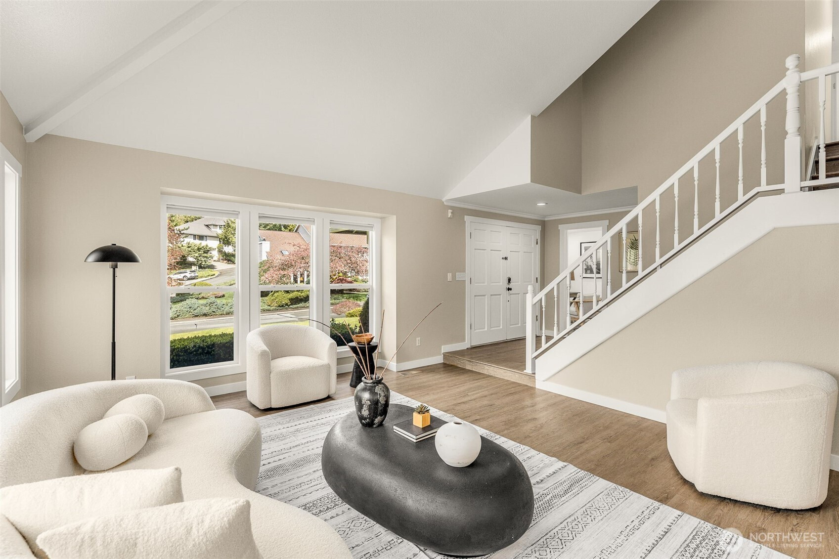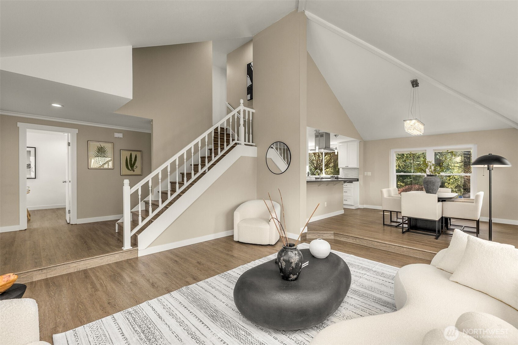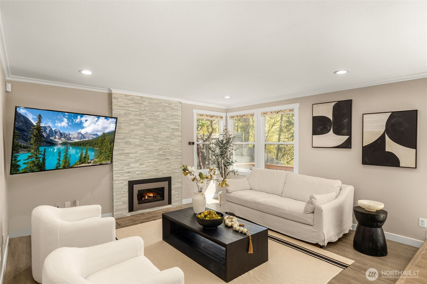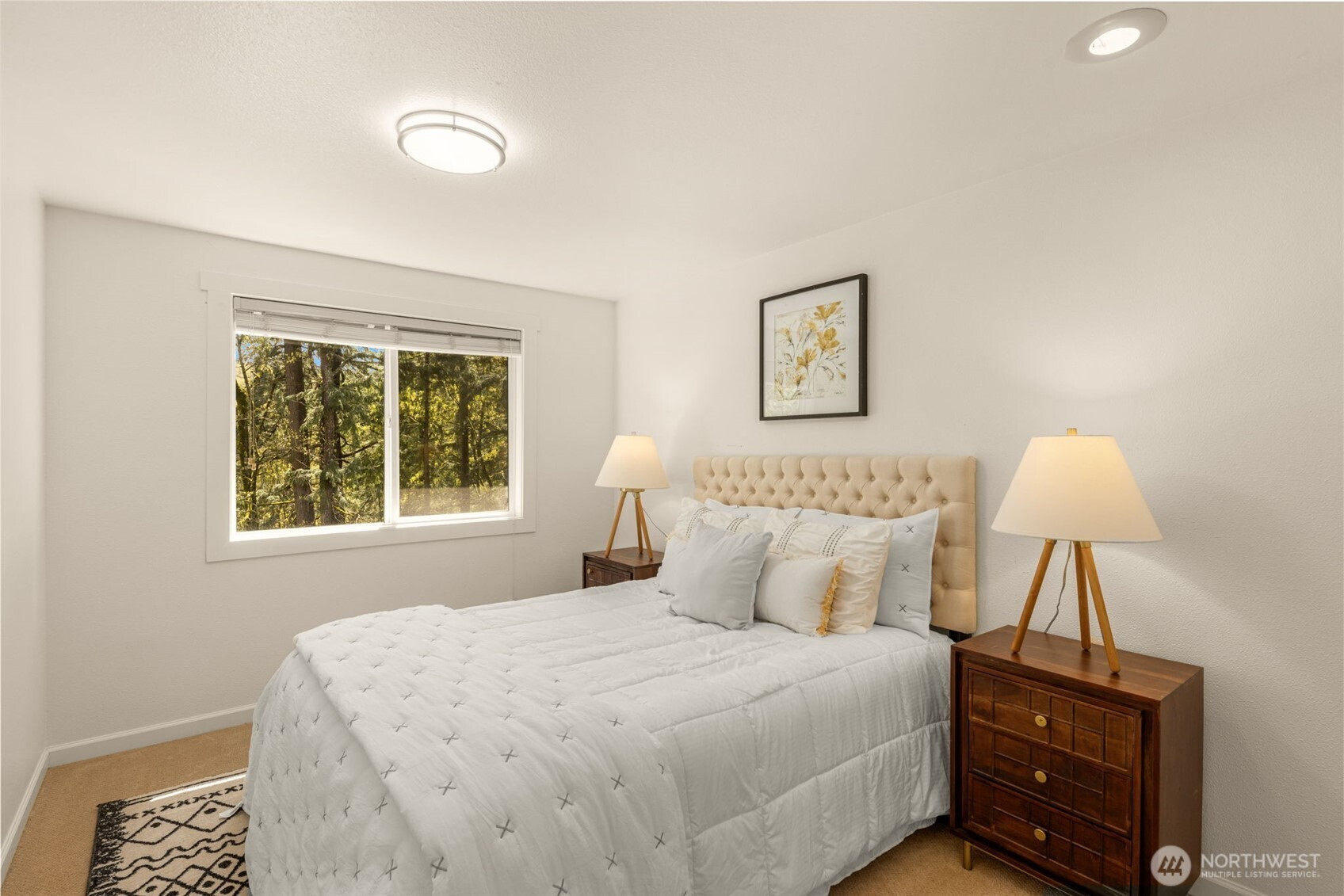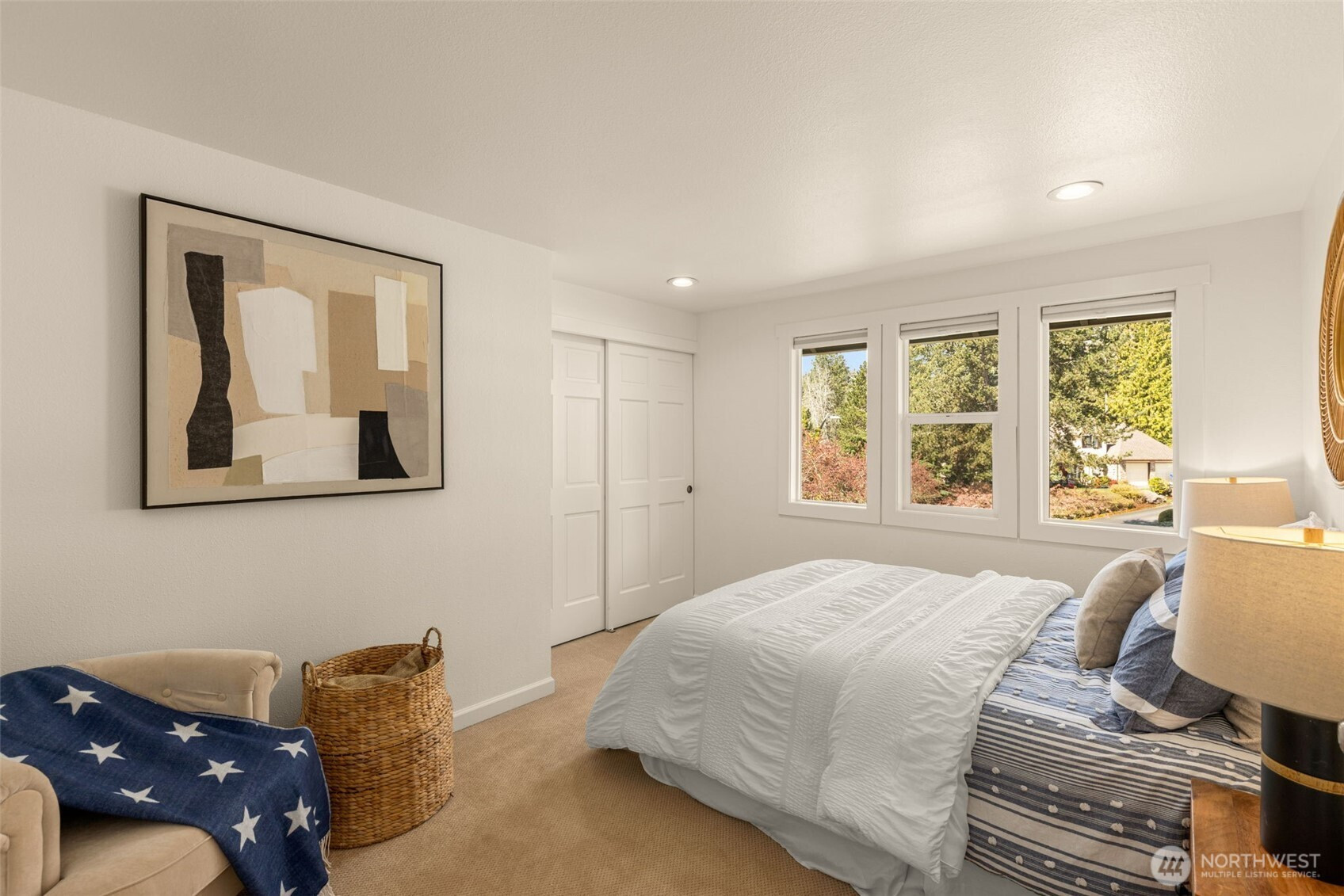 Beautifully renovated two-story residence situated on a private lot with southern exposure, backing to a tranquil greenbelt in the sought-after Bellevue School District. A timeless and elegant floorplan welcomes you with an inviting living room that seamlessly flows into the formal dining room, both enhanced by expansive windows and soaring vaulted ceilings that bathe the home in natural light. The thoughtfully refreshed kitchen showcases sleek quartz countertops, abundant cabinetry, and a functional seating bar, effortlessly connecting to the family room with a tiled gas fireplace. A versatile main-level den or office is complemented by a tastefully remodeled ¾ bath, offering flexibility and convenience. Upstairs, the spacious primary suite serves as a private retreat, complete with a remodeled spa-inspired bath and a generous walk-in closet. Three additional bedrooms and a well-appointed hallway bath with skylight complete the upper level. Step outside to an expansive deck overlooking an exceptionally private and fully fenced backyard, perfect for outdoor entertaining, relaxation, and enjoying the peaceful natural surroundings. Ideally located just moments from parks, scenic trails, and top-rated schools, with easy access to shopping, dining, Factoria Mall, and major highways.