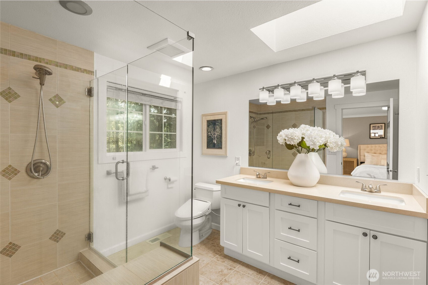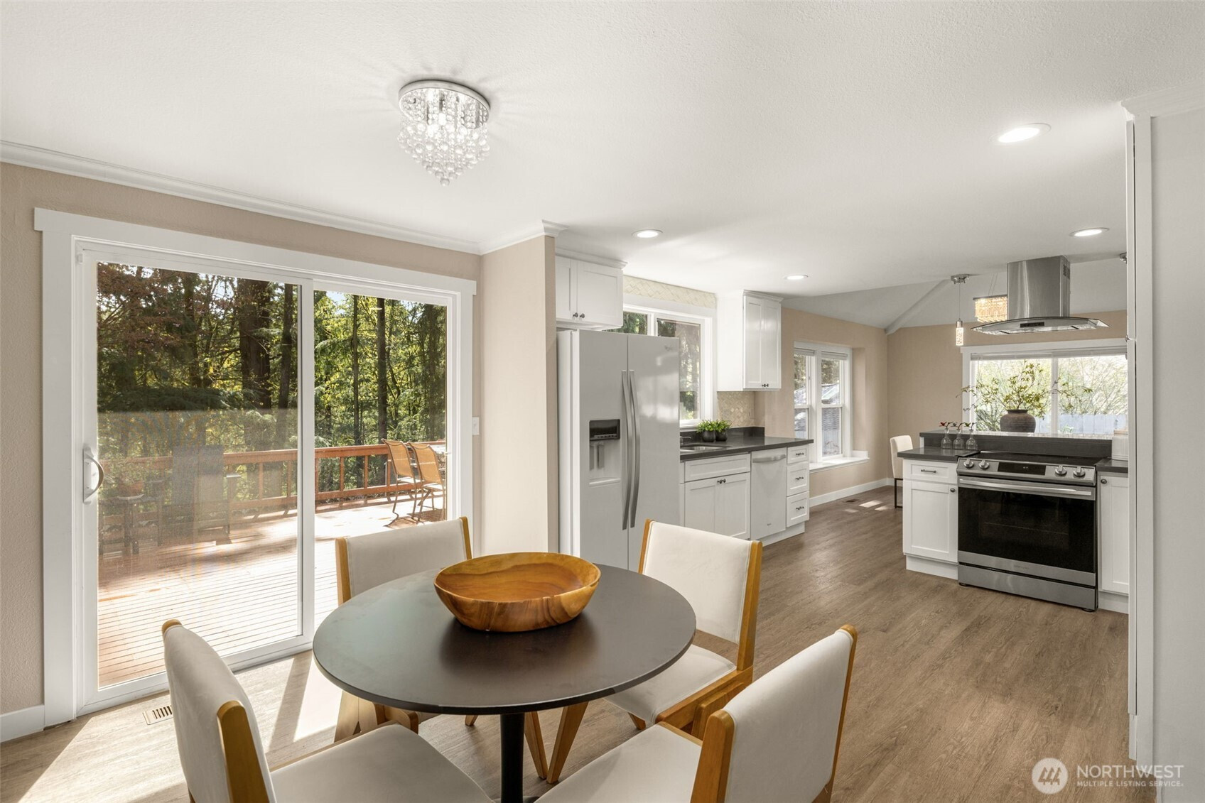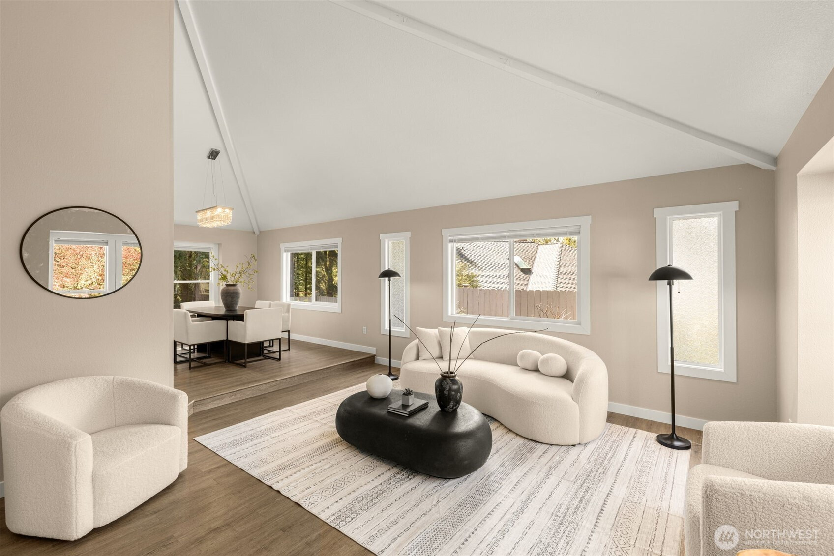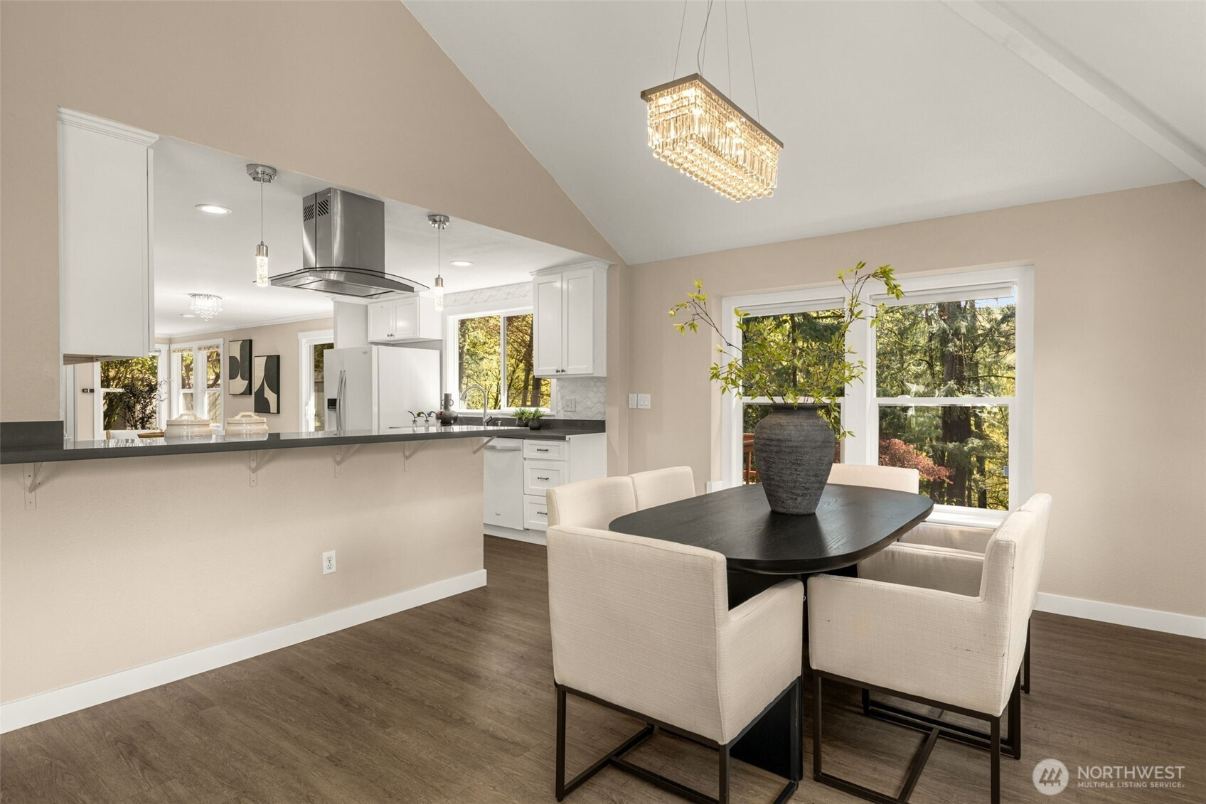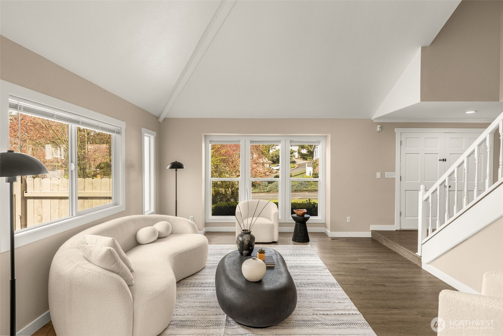 Beautifully renovated two-story residence situated on a private lot with southern exposure, backing to a tranquil greenbelt in the sought-after Bellevue School District. A timeless and elegant floorplan welcomes you with an inviting living room that seamlessly flows into the formal dining room, both enhanced by expansive windows and soaring vaulted ceilings that bathe the home in natural light. The thoughtfully refreshed kitchen showcases sleek quartz countertops, abundant cabinetry, and a functional seating bar, effortlessly connecting to the family room with a tiled gas fireplace. A versatile main-level den or office is complemented by a tastefully remodeled ¾ bath, offering flexibility and convenience. Upstairs, the spacious primary suite serves as a private retreat, complete with a remodeled spa-inspired bath and a generous walk-in closet. Three additional bedrooms and a well-appointed hallway bath with skylight complete the upper level. Step outside to an expansive deck overlooking an exceptionally private and fully fenced backyard, perfect for outdoor entertaining, relaxation, and enjoying the peaceful natural surroundings. Ideally located just moments from parks, scenic trails, and top-rated schools, with easy access to shopping, dining, Factoria Mall, and major highways.