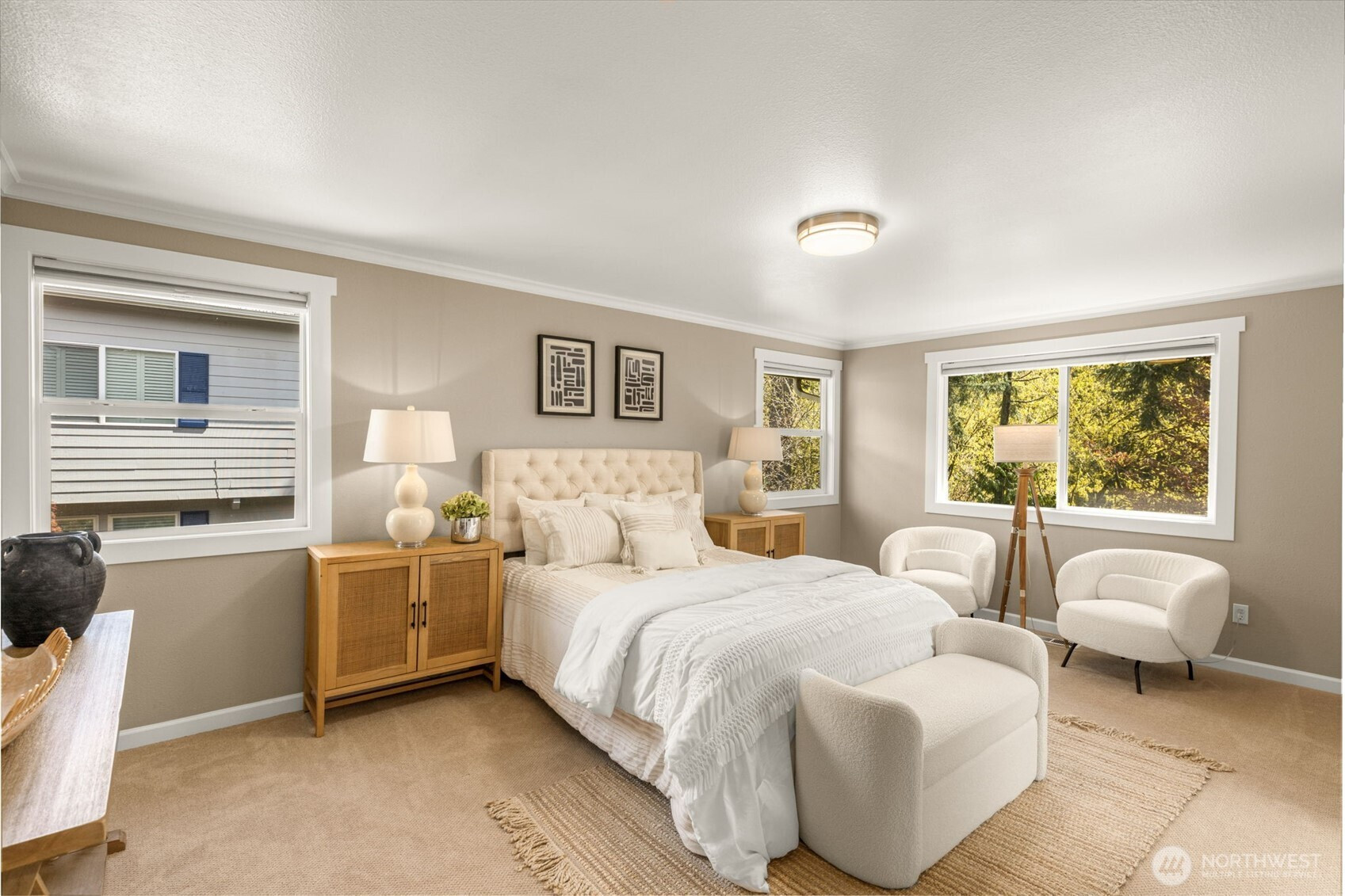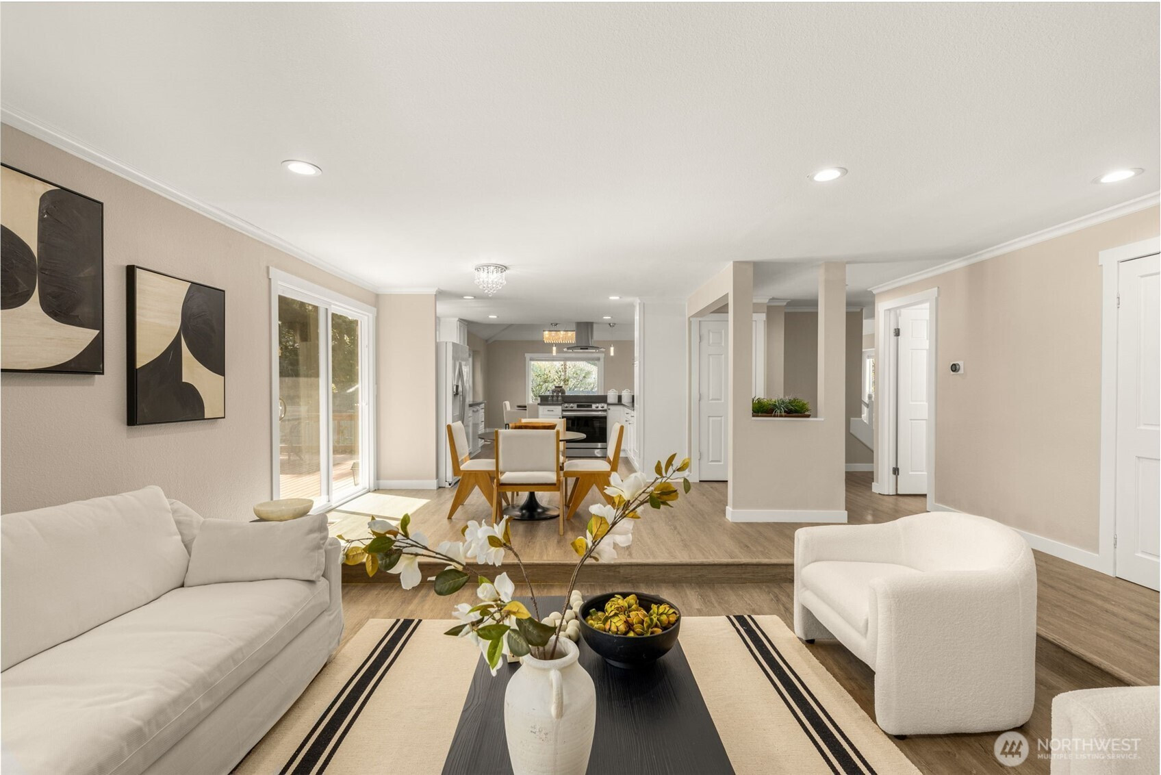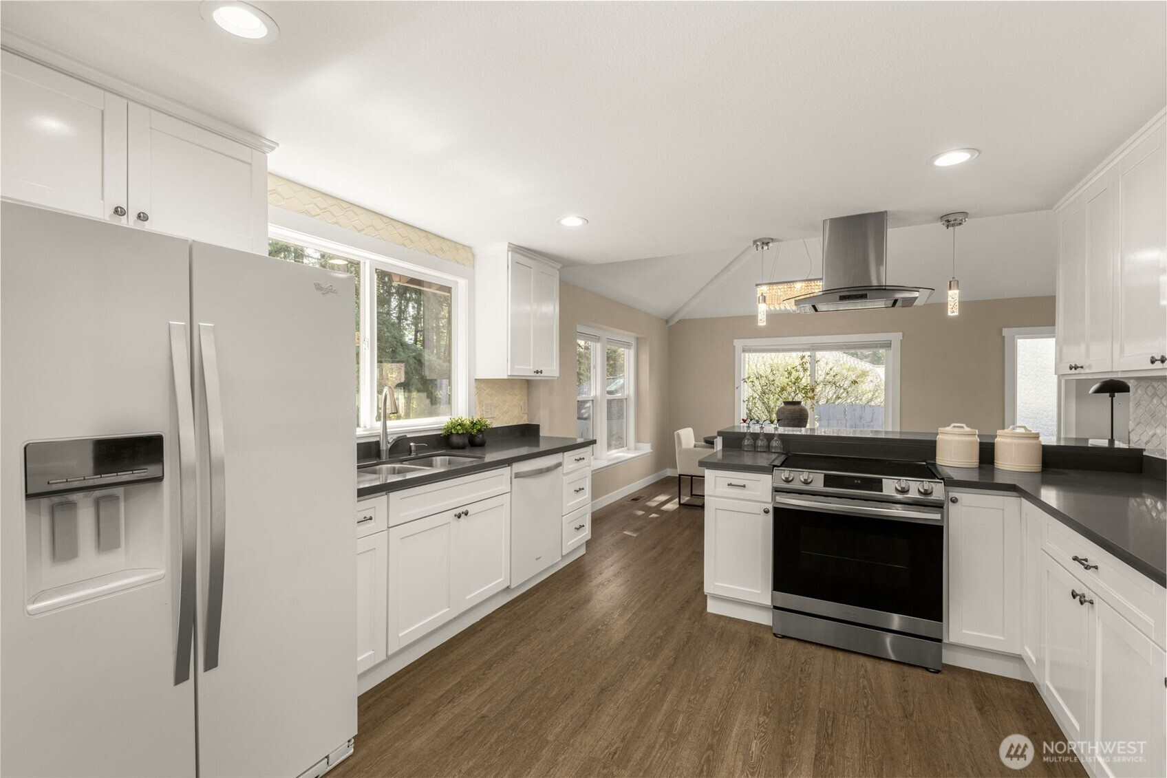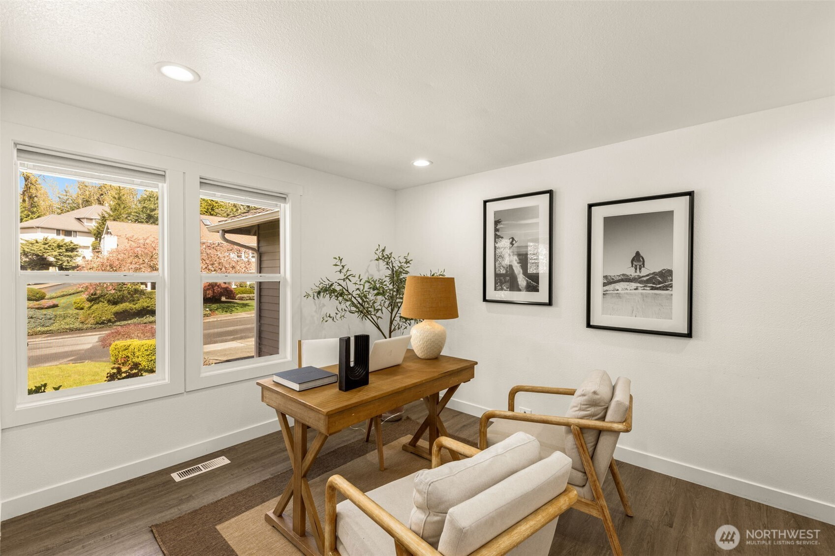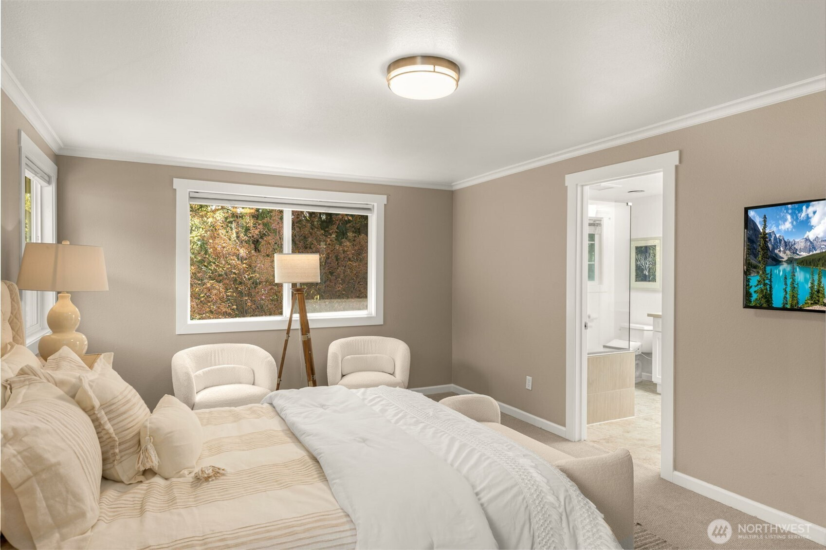 Beautifully renovated two-story residence situated on a private lot with southern exposure, backing to a tranquil greenbelt in the sought-after Bellevue School District. A timeless and elegant floorplan welcomes you with an inviting living room that seamlessly flows into the formal dining room, both enhanced by expansive windows and soaring vaulted ceilings that bathe the home in natural light. The thoughtfully refreshed kitchen showcases sleek quartz countertops, abundant cabinetry, and a functional seating bar, effortlessly connecting to the family room with a tiled gas fireplace. A versatile main-level den or office is complemented by a tastefully remodeled ¾ bath, offering flexibility and convenience. Upstairs, the spacious primary suite serves as a private retreat, complete with a remodeled spa-inspired bath and a generous walk-in closet. Three additional bedrooms and a well-appointed hallway bath with skylight complete the upper level. Step outside to an expansive deck overlooking an exceptionally private and fully fenced backyard, perfect for outdoor entertaining, relaxation, and enjoying the peaceful natural surroundings. Ideally located just moments from parks, scenic trails, and top-rated schools, with easy access to shopping, dining, Factoria Mall, and major highways.
