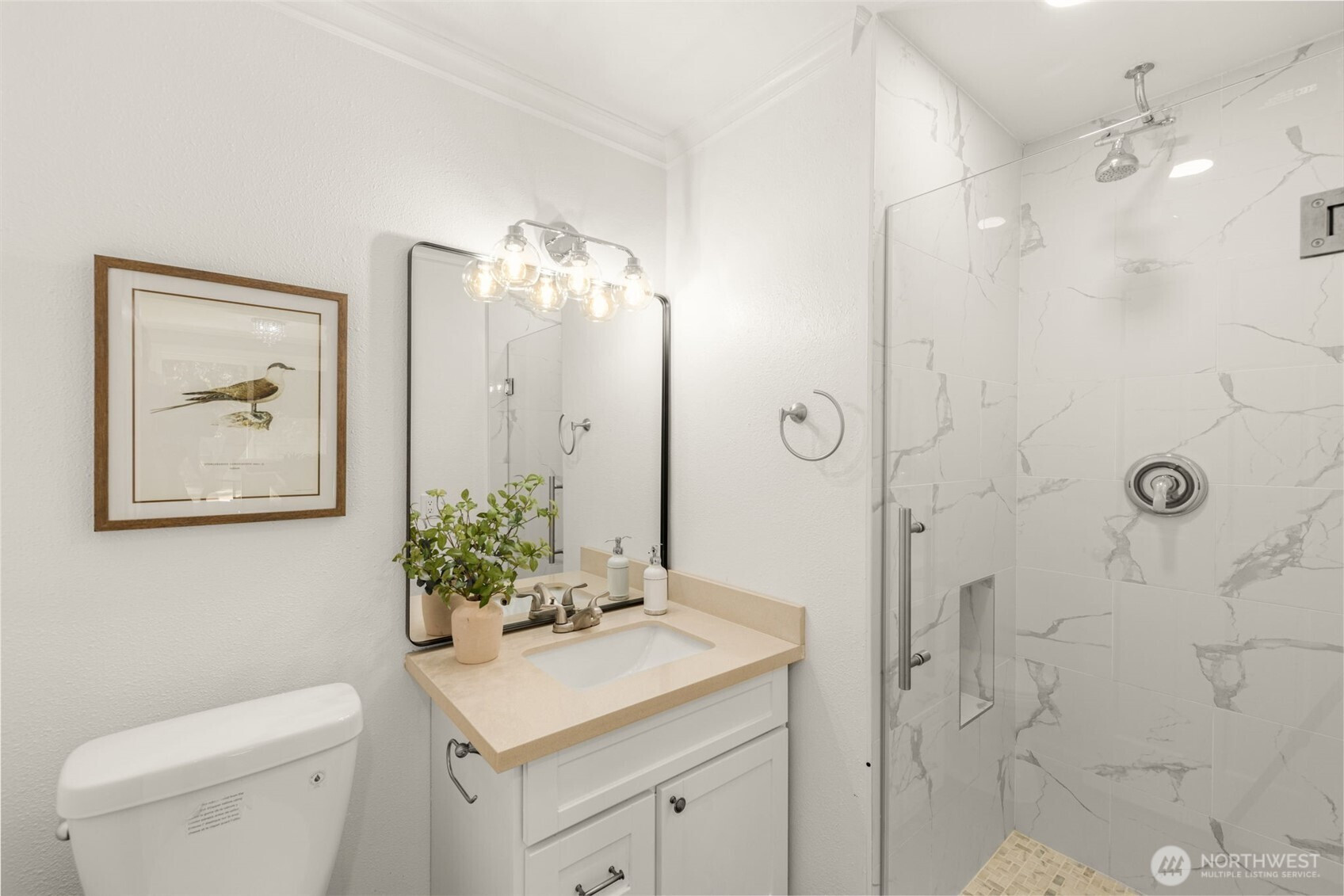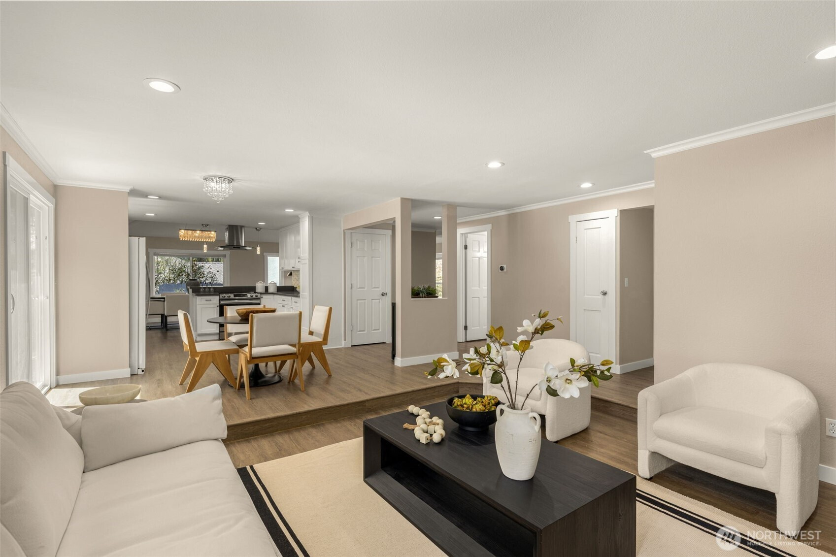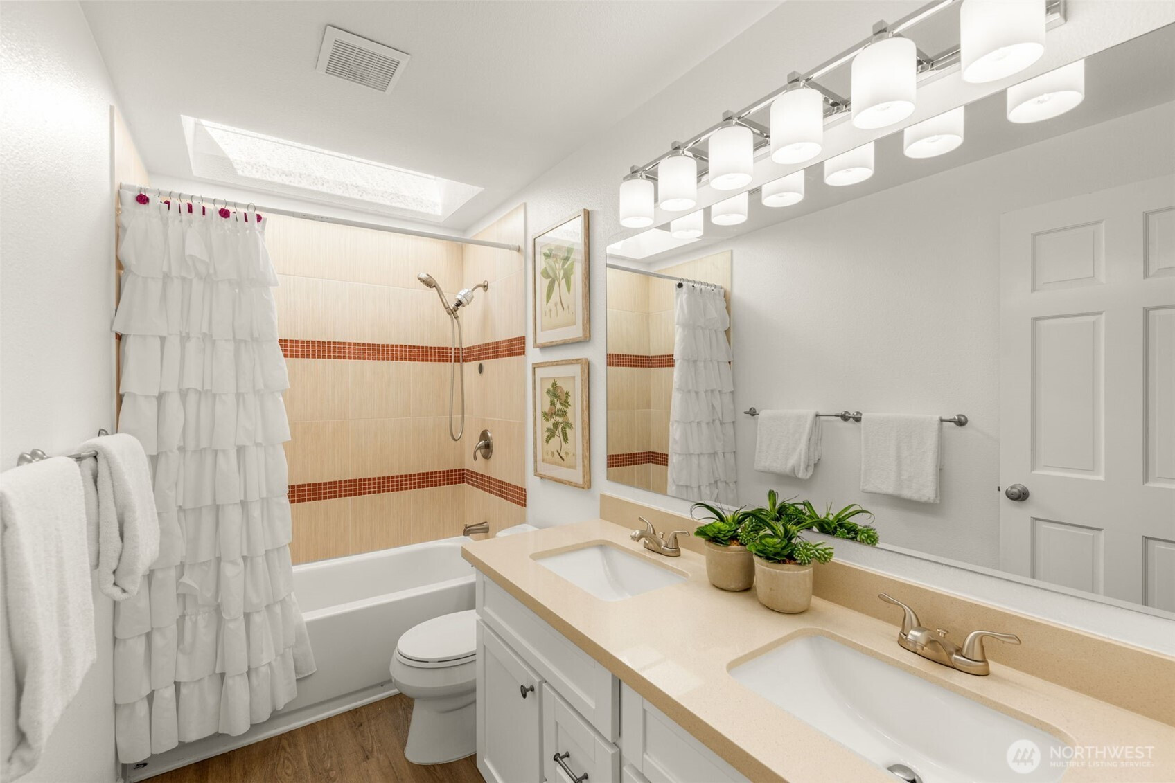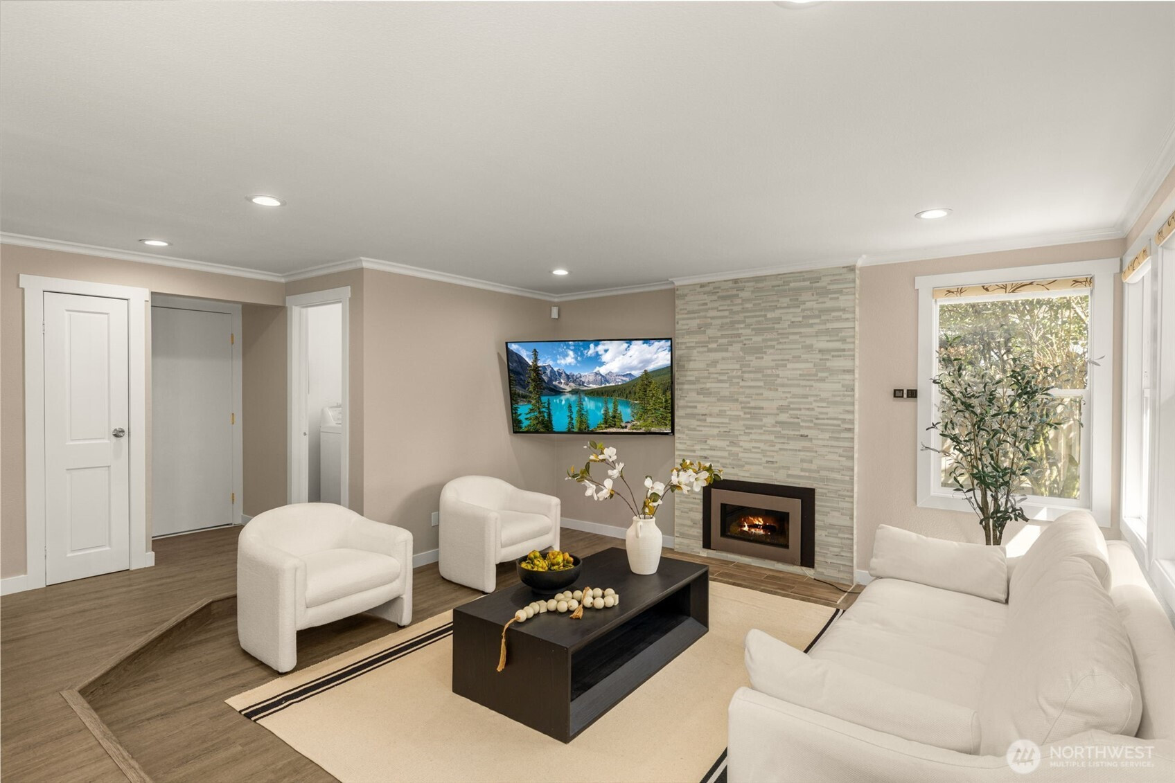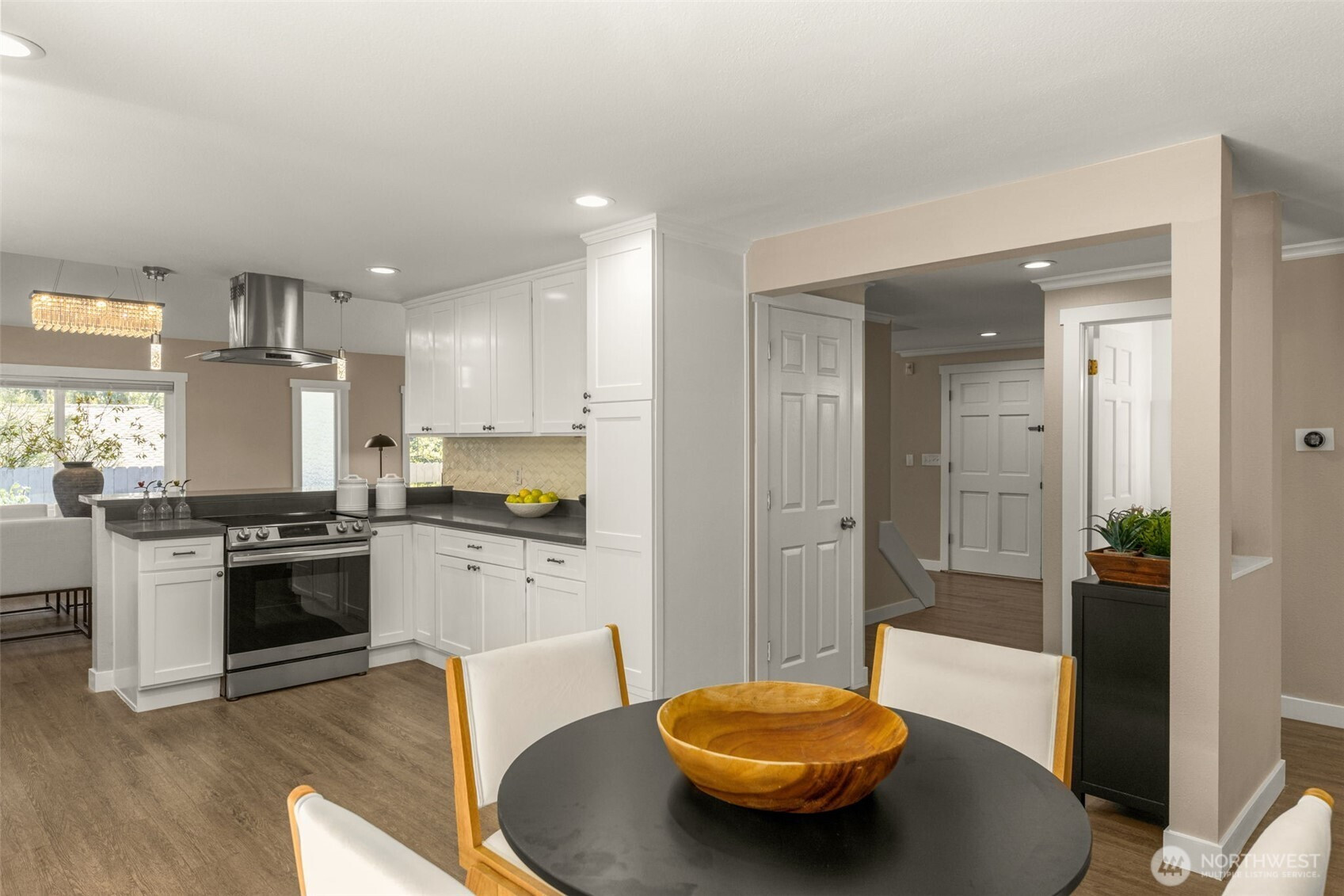 Beautifully renovated two-story residence situated on a private lot with southern exposure, backing to a tranquil greenbelt in the sought-after Bellevue School District. A timeless and elegant floorplan welcomes you with an inviting living room that seamlessly flows into the formal dining room, both enhanced by expansive windows and soaring vaulted ceilings that bathe the home in natural light. The thoughtfully refreshed kitchen showcases sleek quartz countertops, abundant cabinetry, and a functional seating bar, effortlessly connecting to the family room with a tiled gas fireplace. A versatile main-level den or office is complemented by a tastefully remodeled ¾ bath, offering flexibility and convenience. Upstairs, the spacious primary suite serves as a private retreat, complete with a remodeled spa-inspired bath and a generous walk-in closet. Three additional bedrooms and a well-appointed hallway bath with skylight complete the upper level. Step outside to an expansive deck overlooking an exceptionally private and fully fenced backyard, perfect for outdoor entertaining, relaxation, and enjoying the peaceful natural surroundings. Ideally located just moments from parks, scenic trails, and top-rated schools, with easy access to shopping, dining, Factoria Mall, and major highways.