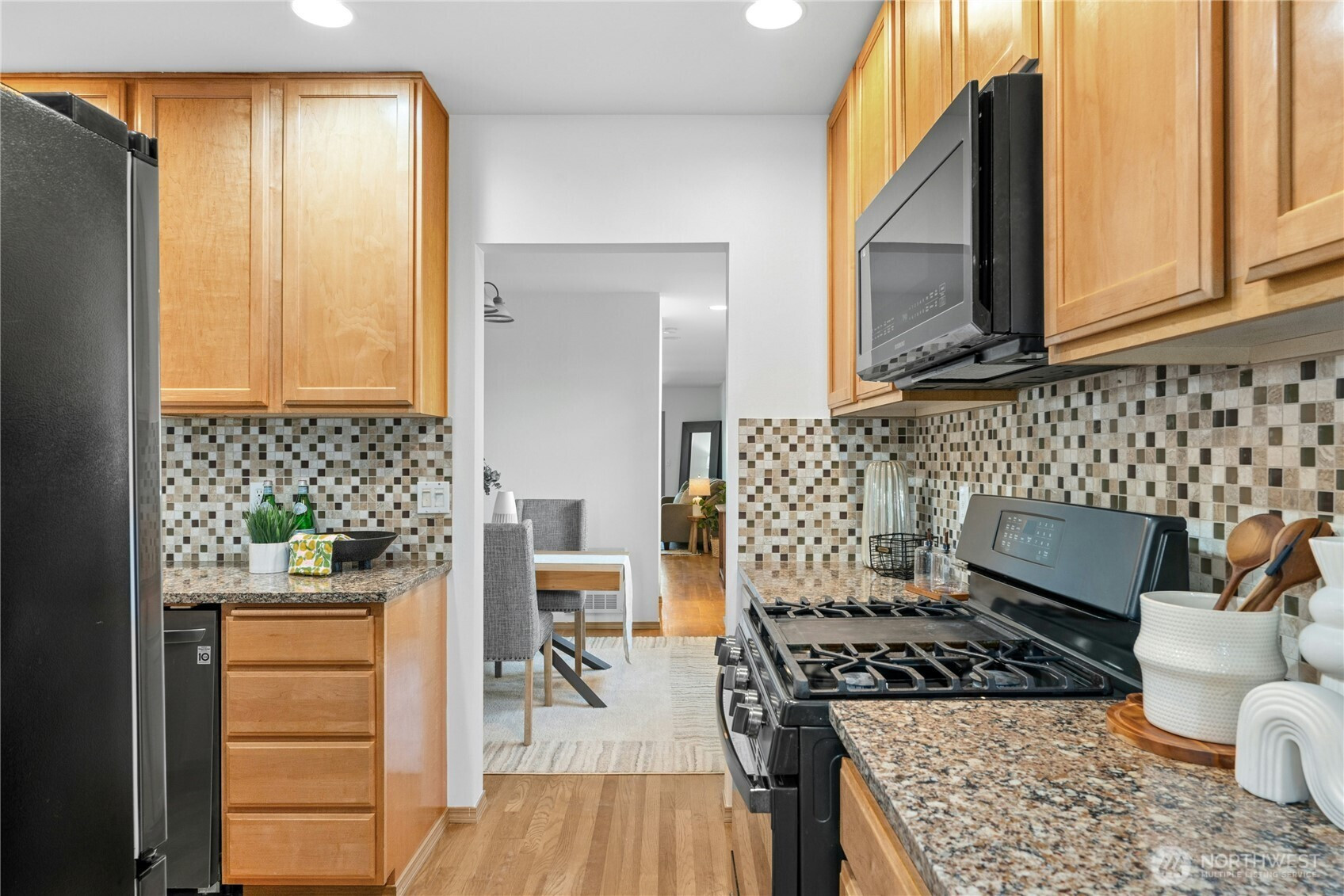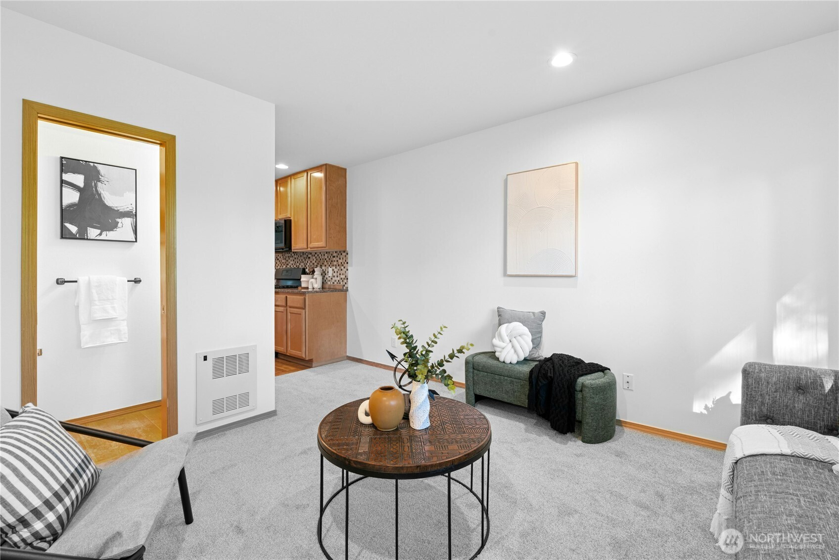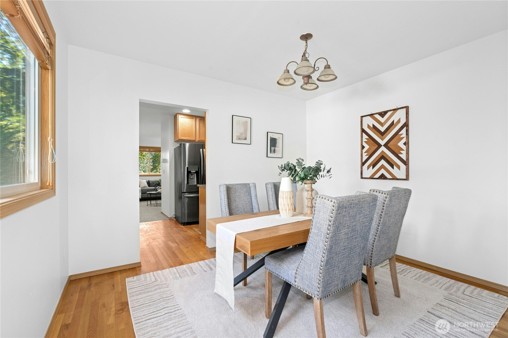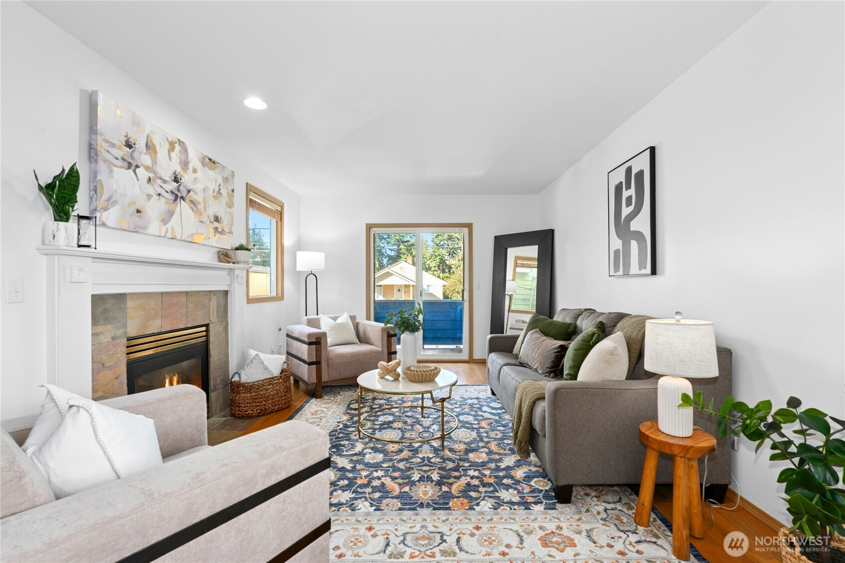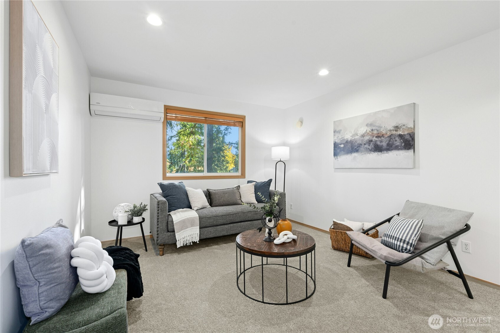 Stylish & Updated Haller Lake home tucked in a quiet setting near shopping & freeways. Light-filled kitchen w/ Quartzite counters, tile backsplash & gas range opens to a sunny living room with gas fireplace & deck. Separate media room overlooking the private yard + dining area and half bath. Upstairs features a spacious primary suite with view deck and second bedroom. Lower level includes full bath, garage, and two flex rooms—ideal for guests, office, gym or nice rental potential. Over $50K in quality improvements including fresh interior/exterior paint, new carpet, Newer mini splits installed, new piping throughout home, newer Refrigerator & Stove & so much more, making this home move-in ready! EXCELLENT LOCATION & Proximity to Light Rail!