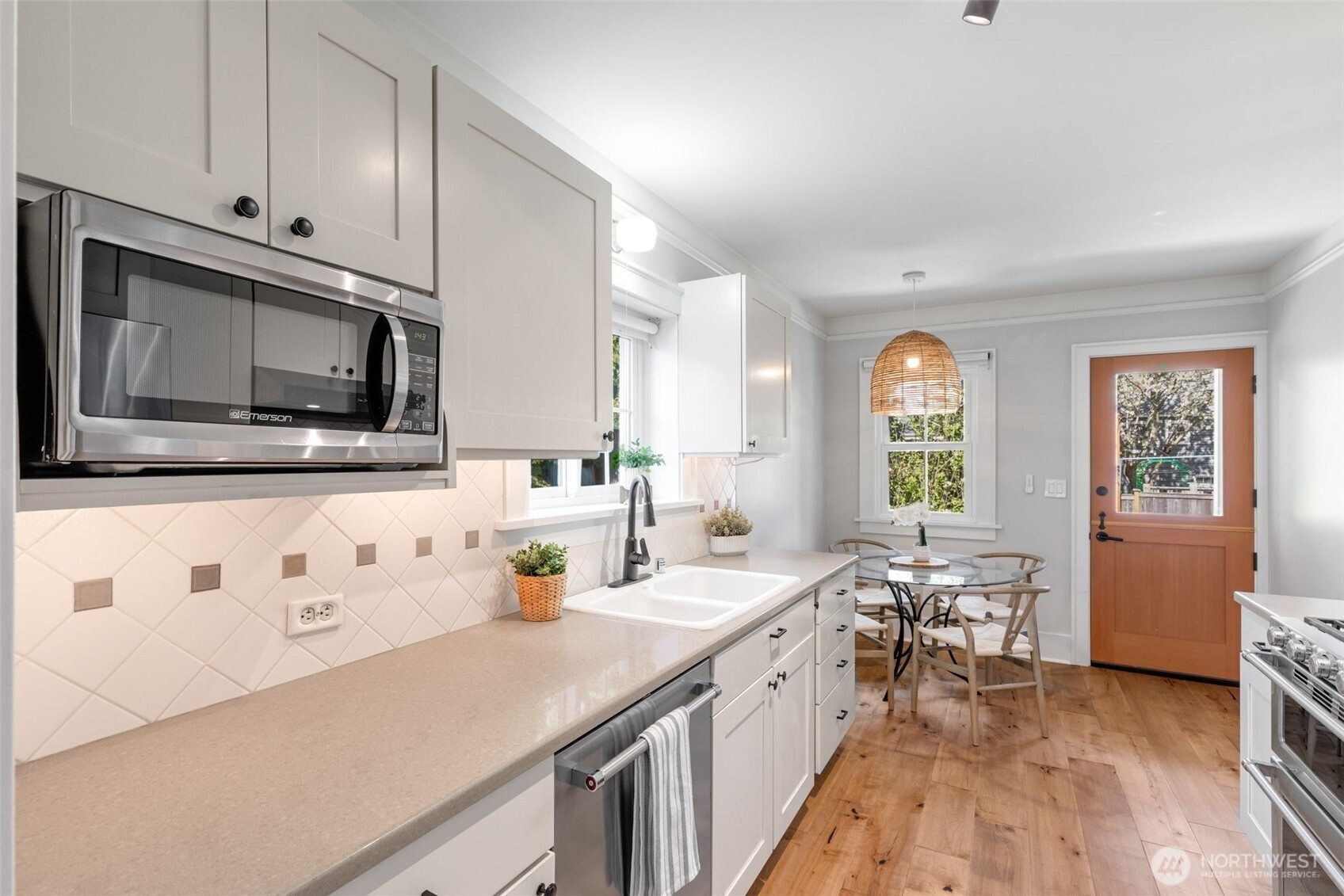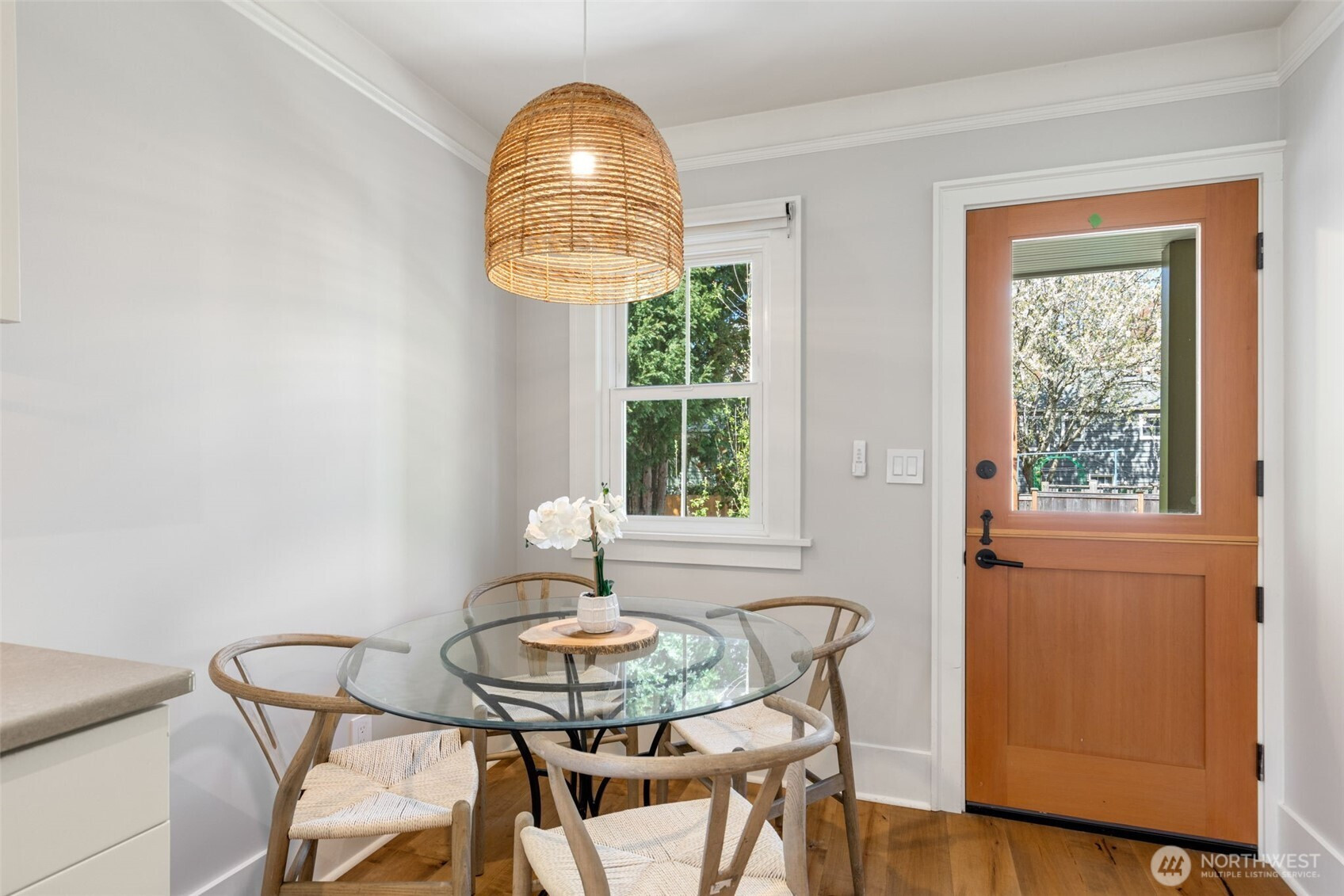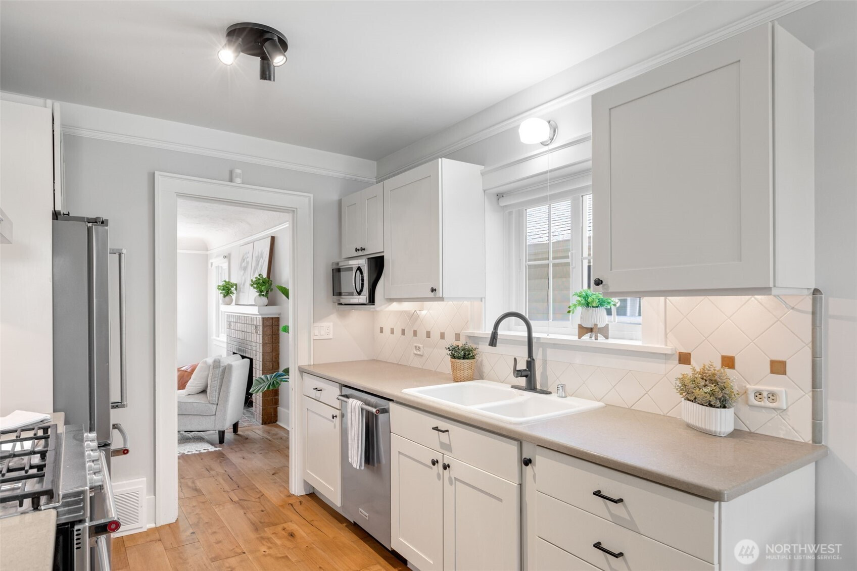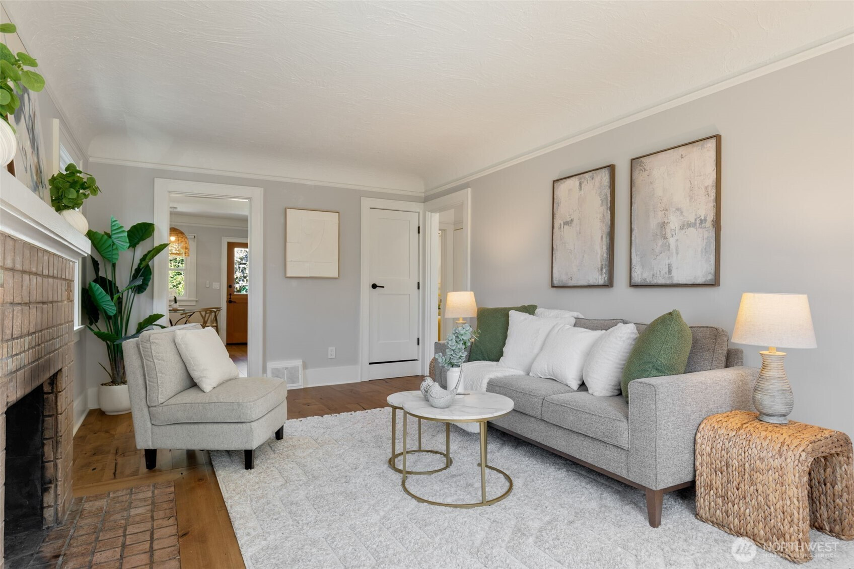 Classic Phinney Ridge charm meets modern flexibility in this thoughtfully updated 1926 Craftsman. The welcoming front porch leads into a light-filled living room with coved ceilings, anchored by an original hand-cast tile fireplace. Two spacious bedrooms and an updated full bath. Kitchen, with stainless appliances, a six-burner gas range, and dining space, features a Dutch door that opens to a sun-drenched backyard, ideal for summer entertaining and late-night campfires. The versatile basement functions as an excellent office, media room, or guest suite, with laundry and a half bath. And here's where it gets interesting: a potential rental studio or MIL / ADU with its own exterior entrance, full kitchen, three-quarter bath, and washer/dryer. House-hack homeownership, host extended guests, or just turn on rental income whenever you want, like during the World Cup this summer! Fresh paint and carpet, newer windows and flooring, and a brand-new high-efficiency furnace. Rare off-street parking space. A short walk to all that Phinney Ridge and Greenwood have to offer: some of the best shops, bars, and restaurants in Seattle. Easy access to transportation, South Lake Union, and downtown. Charming, turnkey, and full of possibilities. Do not miss this unique PhinneyWood gem!