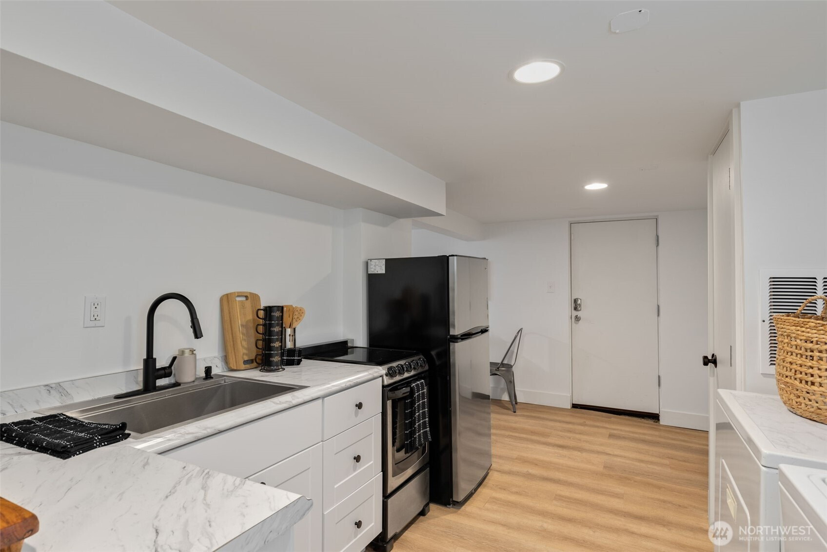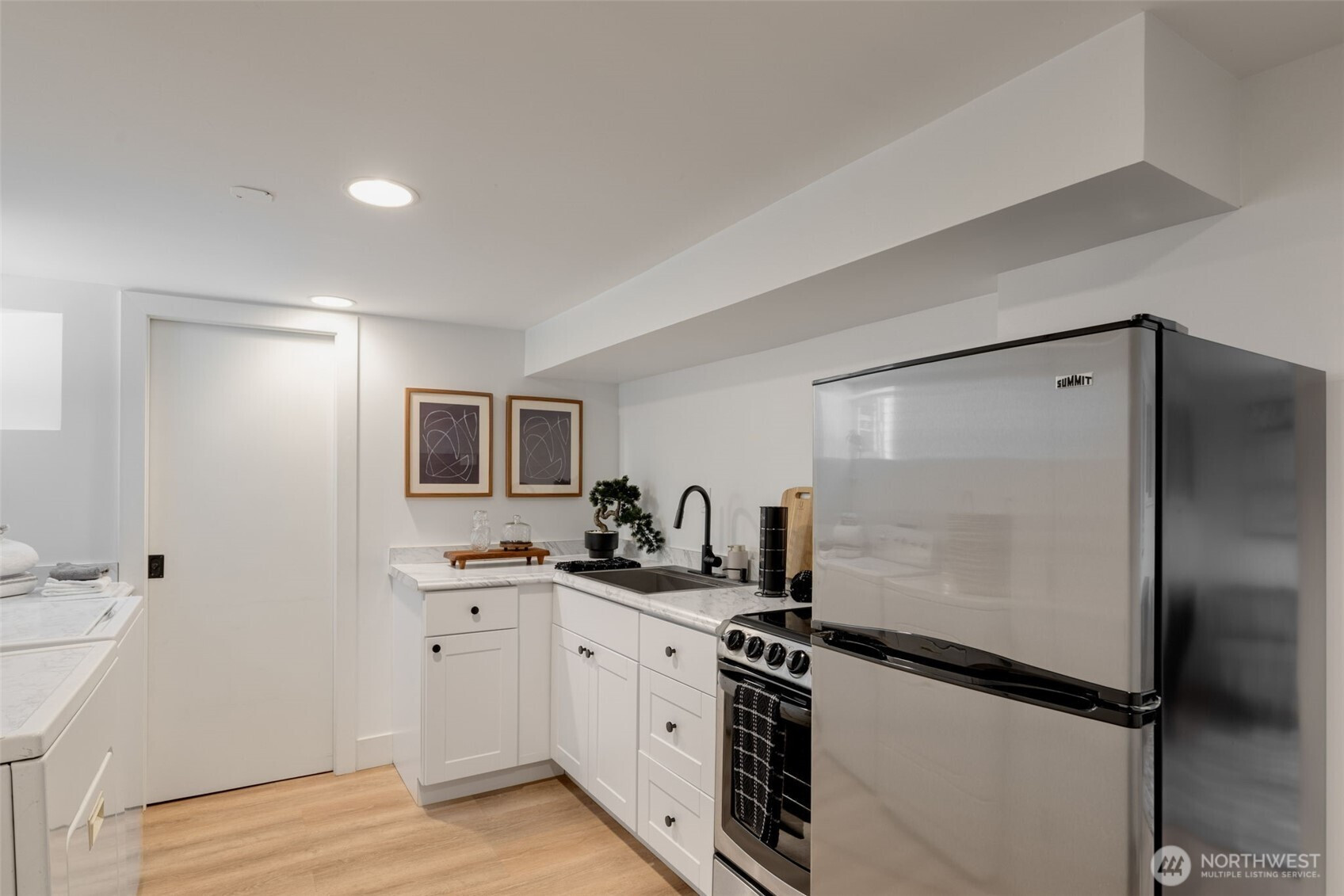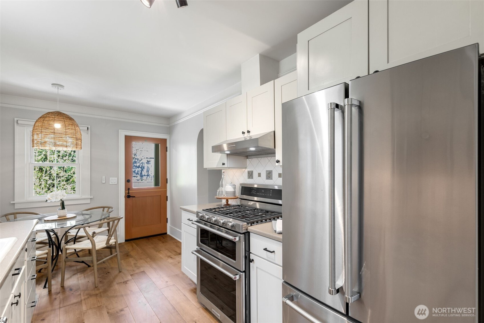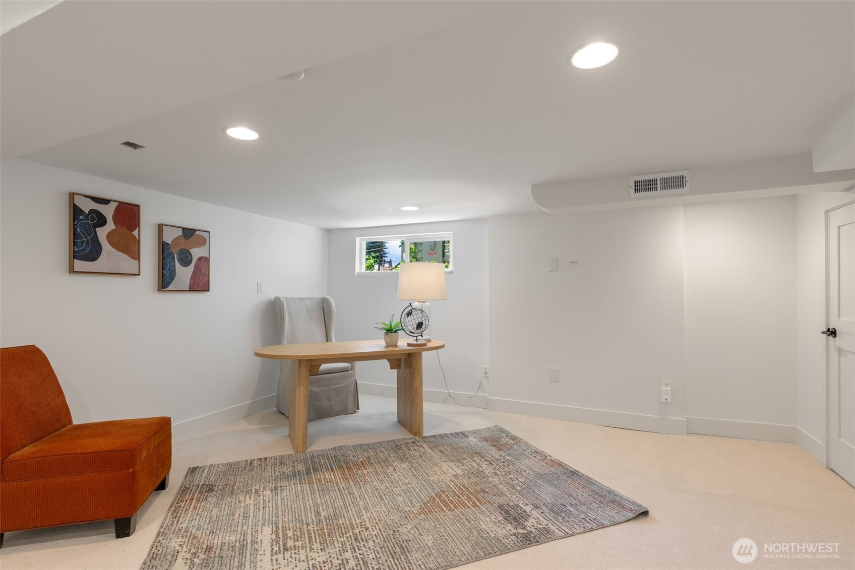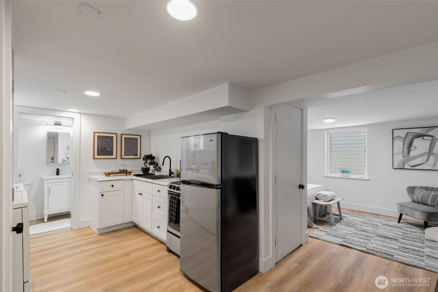 Classic Phinney Ridge charm meets modern flexibility in this thoughtfully updated 1926 Craftsman. The welcoming front porch leads into a light-filled living room with coved ceilings, anchored by an original hand-cast tile fireplace. Two spacious bedrooms and an updated full bath. Kitchen, with stainless appliances, a six-burner gas range, and dining space, features a Dutch door that opens to a sun-drenched backyard, ideal for summer entertaining and late-night campfires. The versatile basement functions as an excellent office, media room, or guest suite, with laundry and a half bath. And here's where it gets interesting: a potential rental studio or MIL / ADU with its own exterior entrance, full kitchen, three-quarter bath, and washer/dryer. House-hack homeownership, host extended guests, or just turn on rental income whenever you want, like during the World Cup this summer! Fresh paint and carpet, newer windows and flooring, and a brand-new high-efficiency furnace. Rare off-street parking space. A short walk to all that Phinney Ridge and Greenwood have to offer: some of the best shops, bars, and restaurants in Seattle. Easy access to transportation, South Lake Union, and downtown. Charming, turnkey, and full of possibilities. Do not miss this unique PhinneyWood gem!