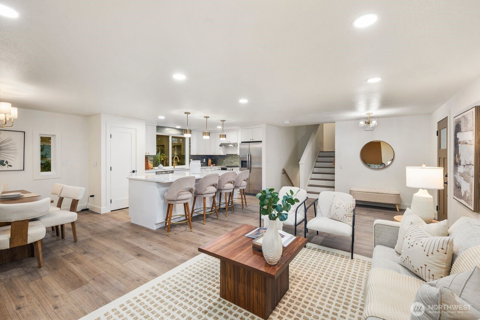 One of a kind by Aced Homes in Kirkland! Step through the front door into an instantly welcoming, open flow that greets you with abundant natural light and seamless energy throughout the home. Revel in morning sunshine in the master bedroom facing east, perfect for waking up refreshed. This gem sits on a peaceful dead-end cul-de-sac with a private backyard and generous 8,482 sq ft lot. Completely renovated with a new roof, gutters, plumbing, electrical, insulation, furnace, water heater, and more. Every surface shines with custom designer finishes by AJX Design. Open-concept chef's kitchen fully remodeled with slim shaker cabinets, quartz island bar overhang countertops, and brand new upgraded appliances—ideal for entertaining or cozy evenings. High-end LVP flooring and custom tile throughout, including in the three fully remodeled luxury bathrooms crafted for spa-like relaxation. Dual laundry upstairs and downstairs. Brand new hydro-seeded yard with updated landscaping, new concrete driveway and walkway, plus new garage doors on the two-car garage. Minutes to downtown Kirkland, parks, and top-rated schools. Easy access to I-405.