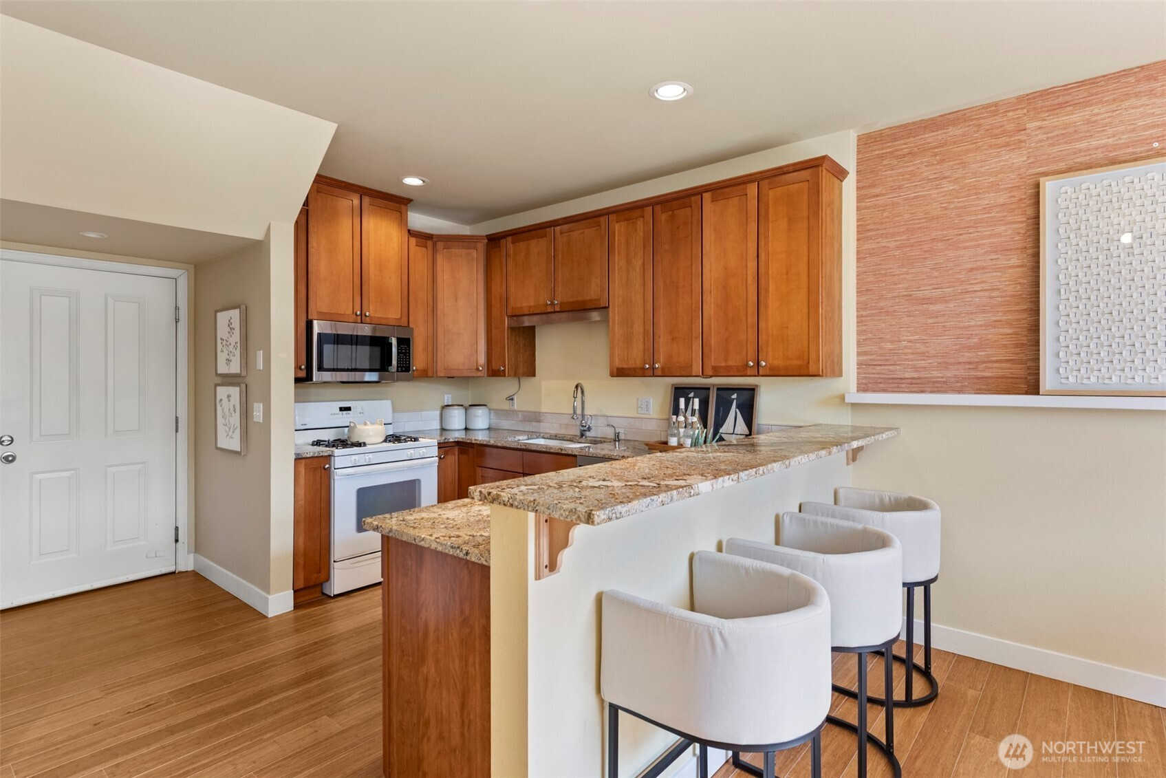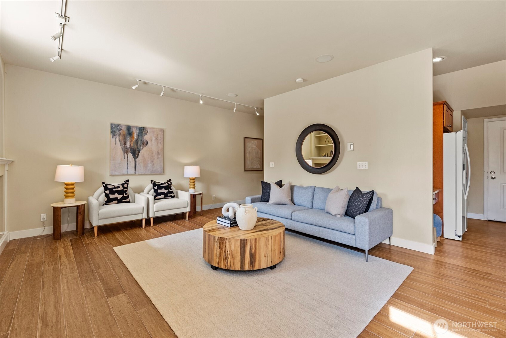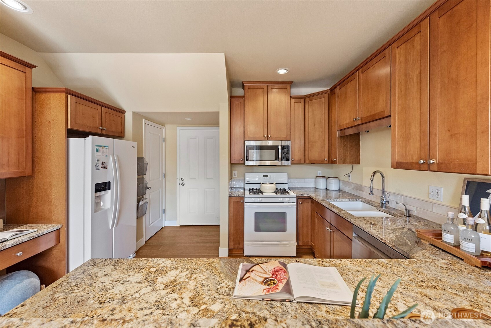 Well-maintained townhome-style condo offering 3 bedrooms and 2.5 baths in a convenient Shoreline location. This spacious home features a thoughtful layout with quality finishes and comfortable living spaces throughout.The main level showcases bamboo flooring, high ceilings, and a welcoming living area with a gas fireplace and custom built-in cabinetry. The kitchen is designed for both function and style, featuring granite countertops, a center island with bar seating, and a walk-in pantry.Just off the dining area, enjoy a sunny patio surrounded by mature landscaping—ideal for outdoor dining, relaxing, or entertaining.Upstairs, the generous primary suite includes a spacious bath with dual sinks, a jet tub, and a separate shower. Two additional bedrooms, a full bath, and a conveniently located washer and dryer complete the upper level.Additional features include an efficient hydronic heating system and an oversized two-car garage with abundant storage space. Located right next to the Ridgecrest Elementary School, near parks, trails, and everyday amenities.