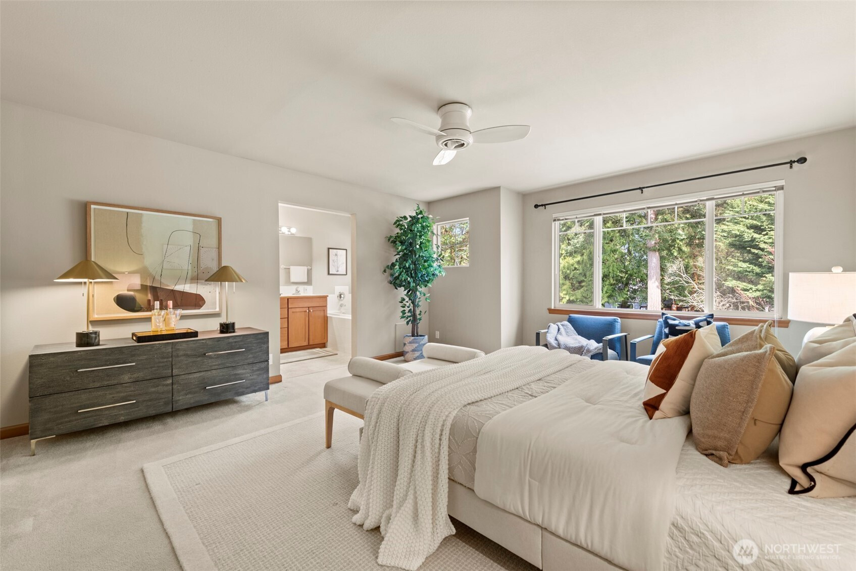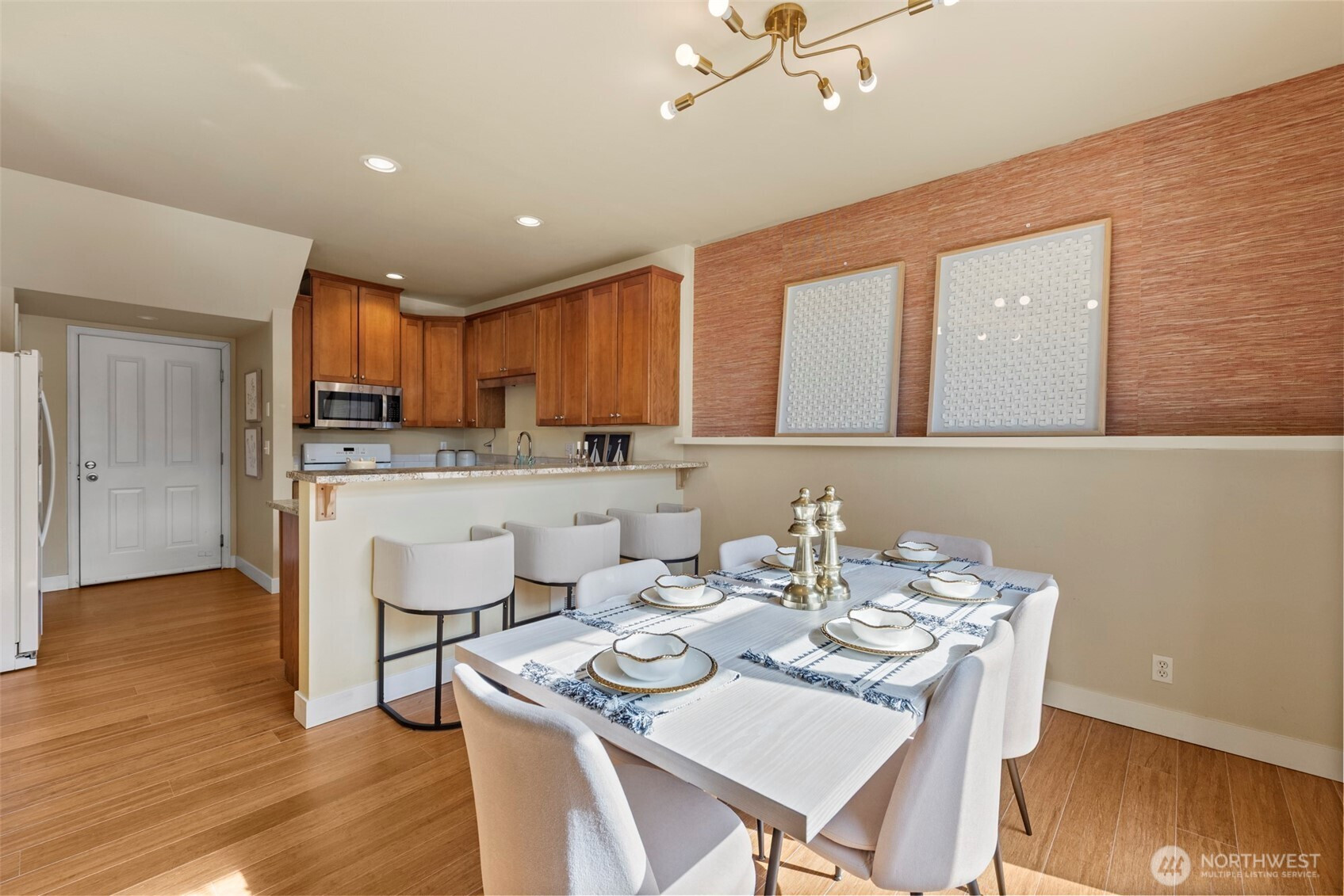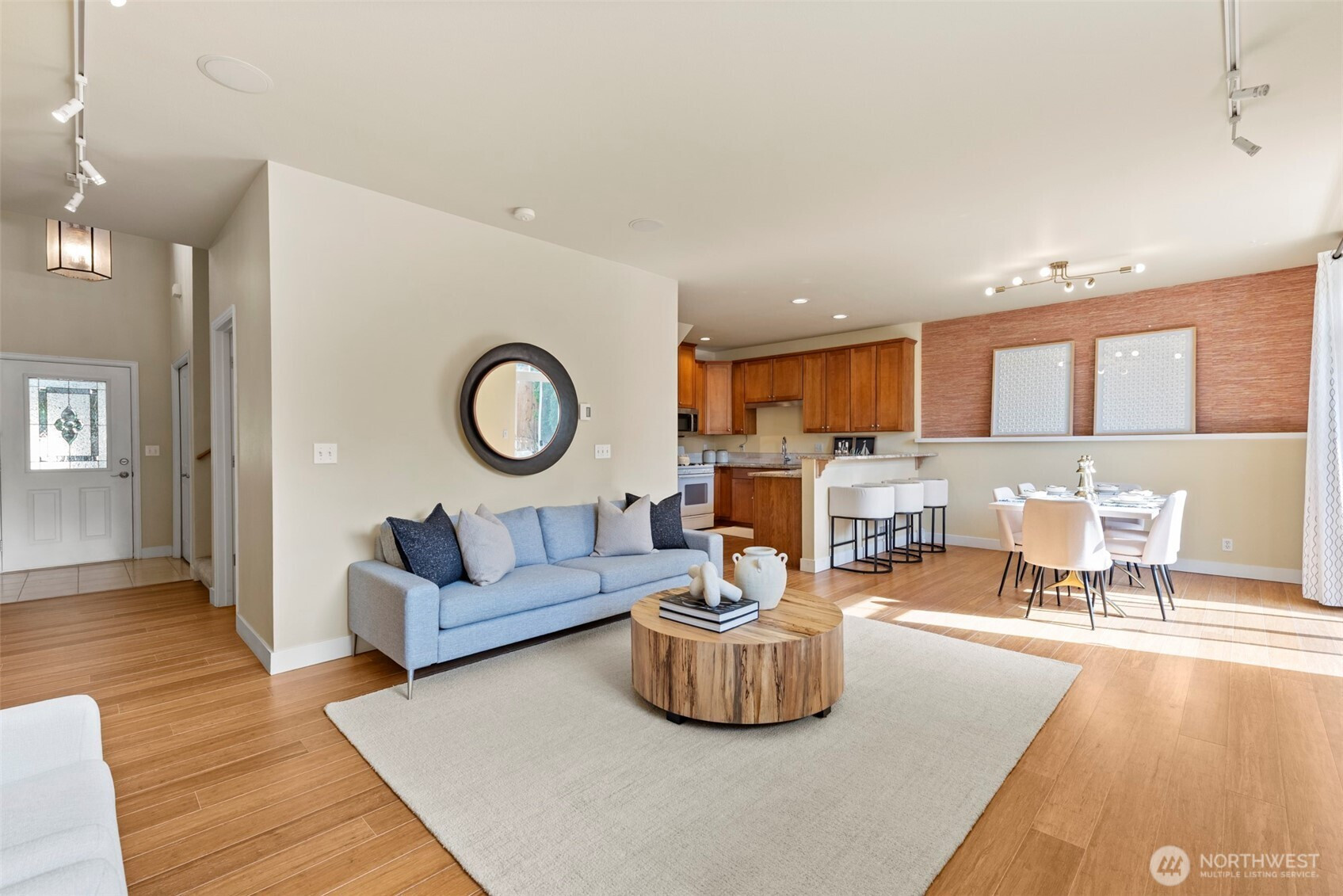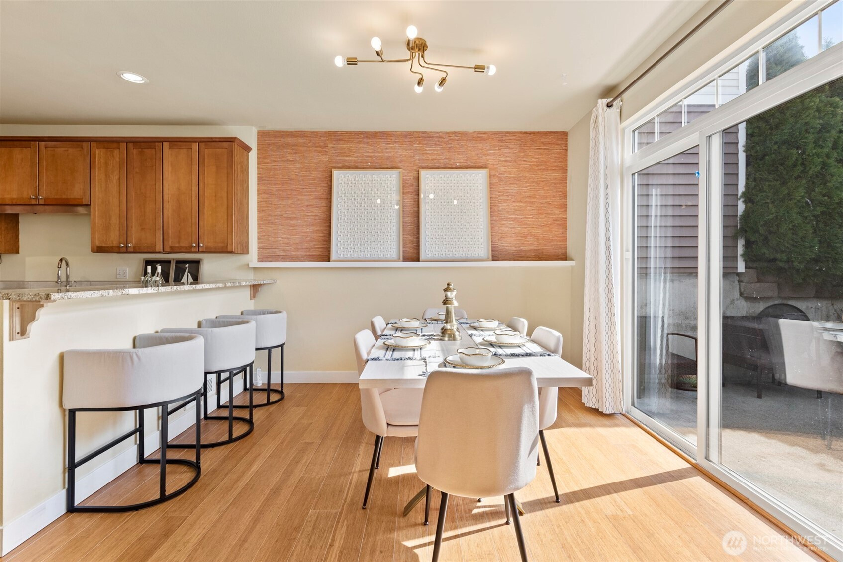 Well-maintained townhome-style condo offering 3 bedrooms and 2.5 baths in a convenient Shoreline location. This spacious home features a thoughtful layout with quality finishes and comfortable living spaces throughout.The main level showcases bamboo flooring, high ceilings, and a welcoming living area with a gas fireplace and custom built-in cabinetry. The kitchen is designed for both function and style, featuring granite countertops, a center island with bar seating, and a walk-in pantry.Just off the dining area, enjoy a sunny patio surrounded by mature landscaping—ideal for outdoor dining, relaxing, or entertaining.Upstairs, the generous primary suite includes a spacious bath with dual sinks, a jet tub, and a separate shower. Two additional bedrooms, a full bath, and a conveniently located washer and dryer complete the upper level.Additional features include an efficient hydronic heating system and an oversized two-car garage with abundant storage space. Located right next to the Ridgecrest Elementary School, near parks, trails, and everyday amenities.